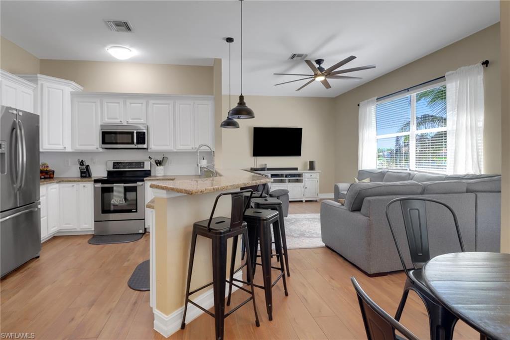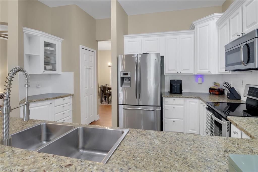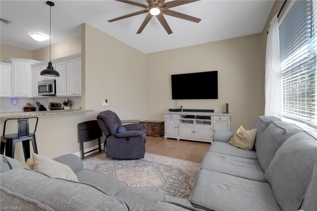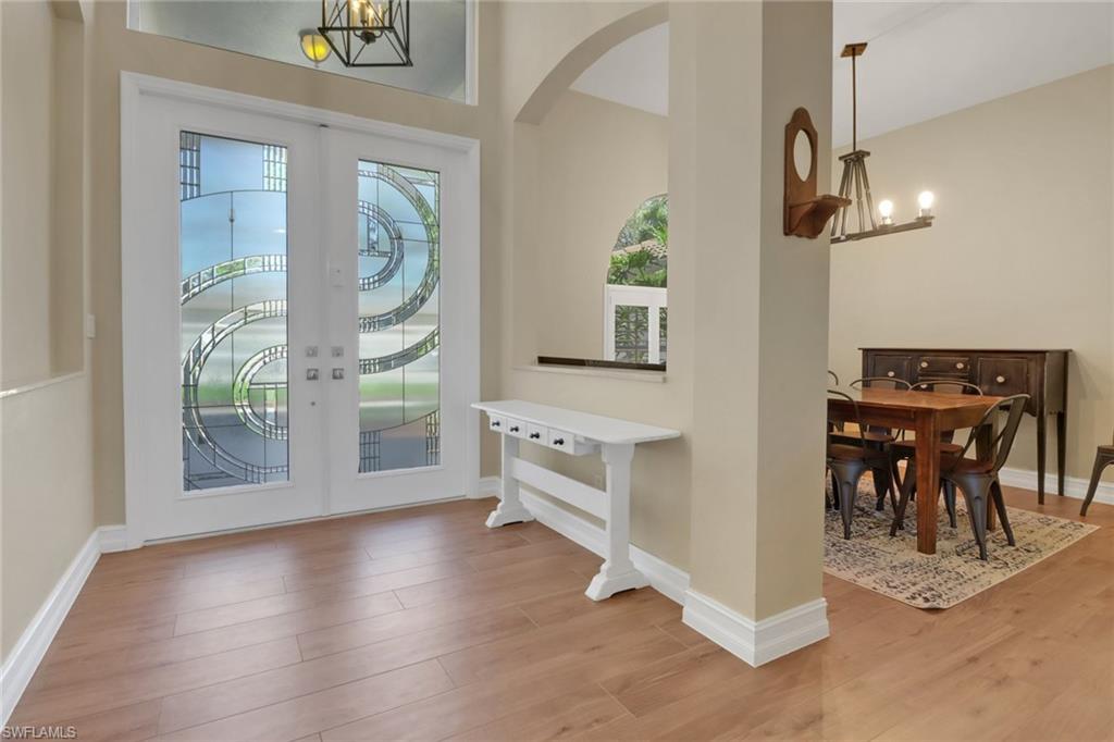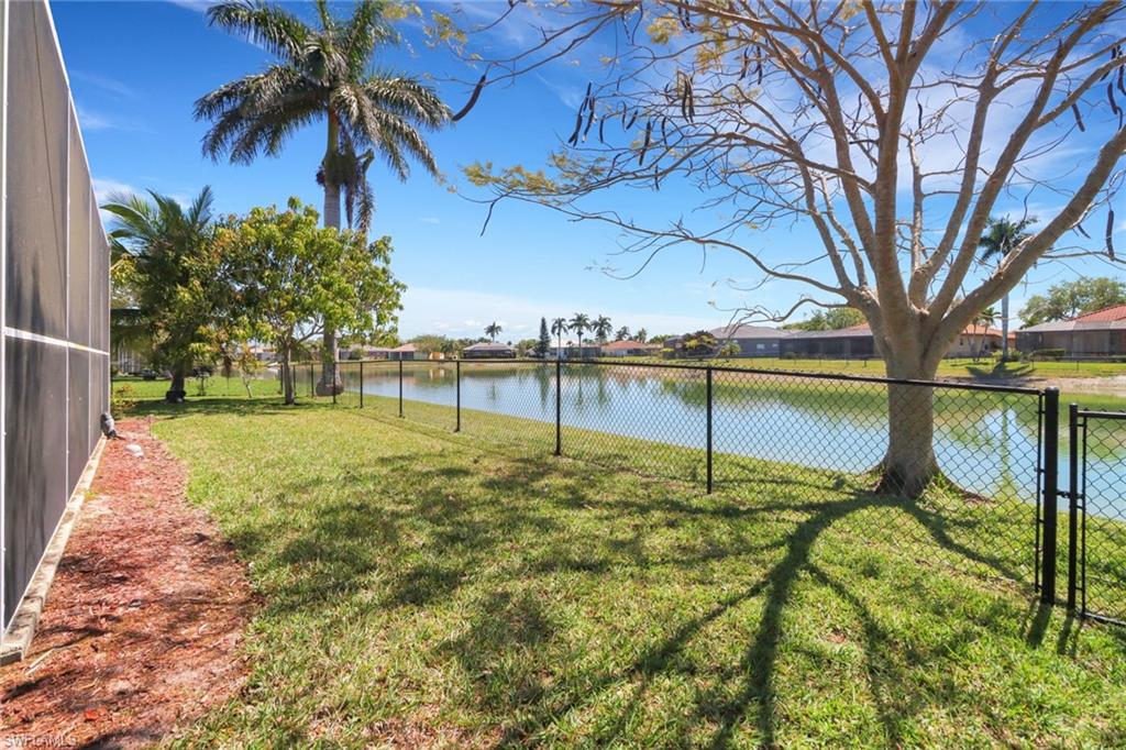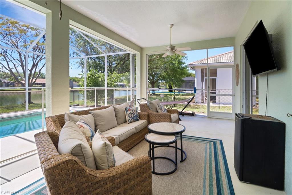 Step into this beautifully designed 3-bedroom, 2-bathroom home offering 1,870 square feet of inviting living space in sought-after Waterways at Naples. A grand French door entry welcomes you into the foyer, where a formal sitting room and formal dining area set the stage for elegant entertaining. The home boasts modern plank tile flooring throughout, with plush carpeting in the bedrooms for added comfort. The cozy living room flows seamlessly into a well-appointed kitchen featuring granite countertops, stainless steel appliances, and a breakfast bar. The spacious primary suite is a private retreat, complete with a tray ceiling, ensuite bath with dual vanities, a soaking tub, and a glass-enclosed shower. A large laundry room offers additional storage and a utility sink for convenience. Step outside to the screened lanai, where a sparkling pool overlooks stunning lake views. The Southern rear exposure provides beautiful sunshine throughout the day, while the fenced yard ensures privacy. Located in the gated Waterways at Naples, residents enjoy low HOA fees and access to exceptional amenities, including a clubhouse, pool, basketball and tennis courts, volleyball, BBQ area, park, and boat storage. With 150 acres of freshwater lakes, this community is perfect for those who love waterfront living. Don’t miss the opportunity to call this lakefront retreat home!