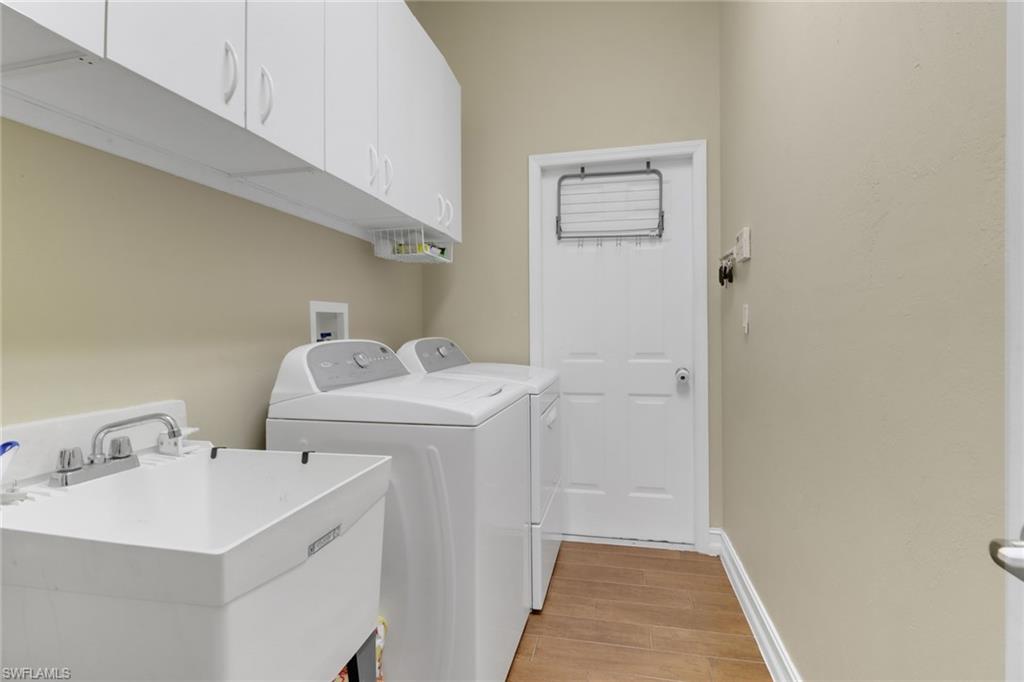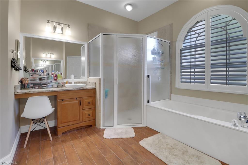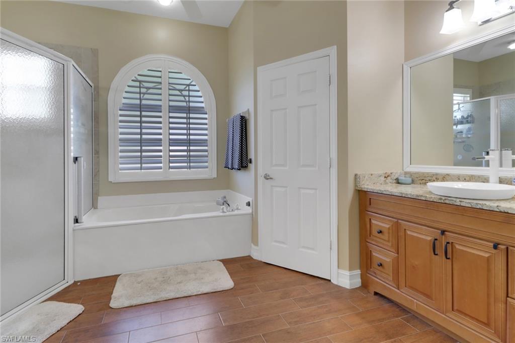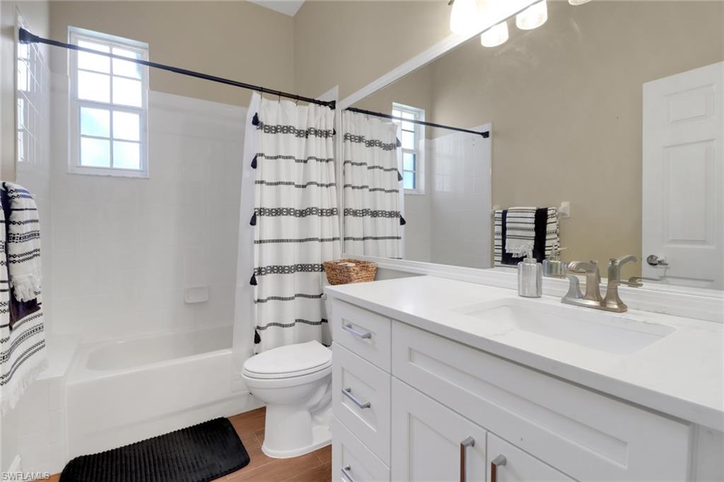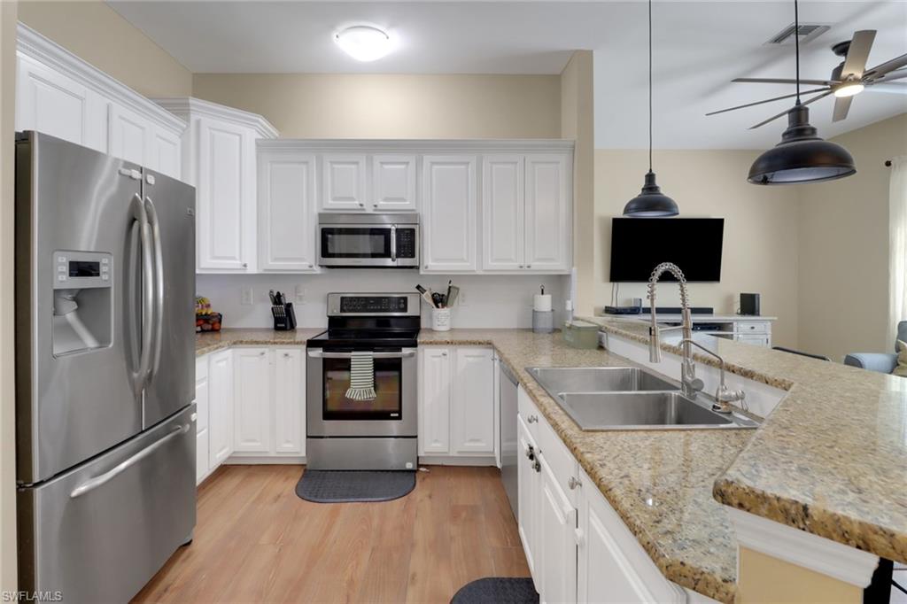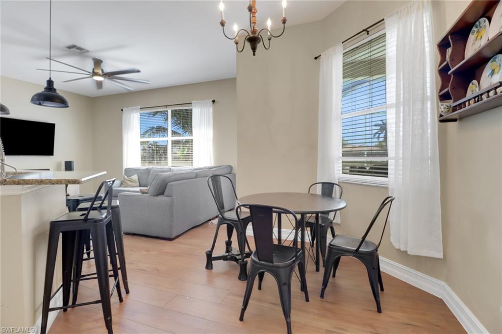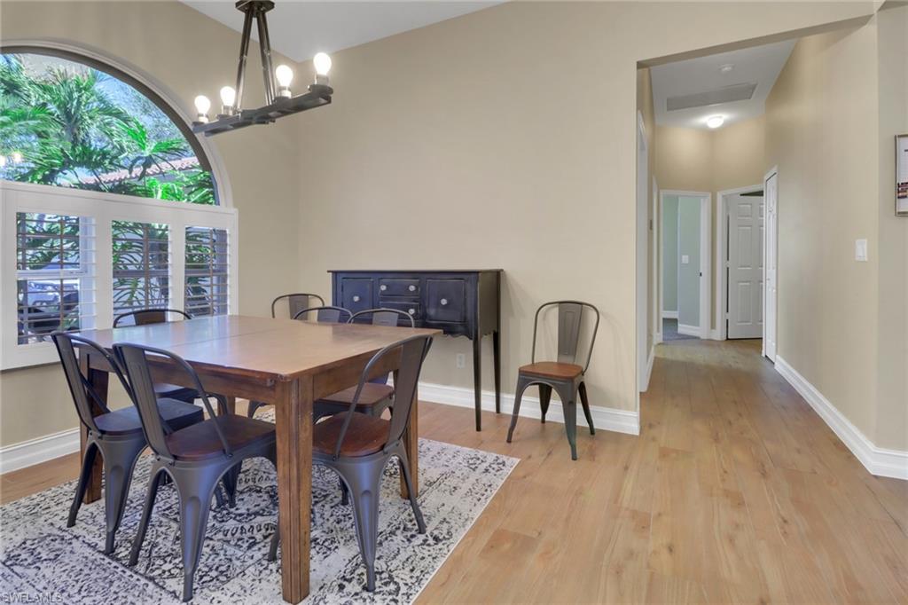 Step into this beautifully designed 3-bedroom, 2-bathroom home offering 1,870 square feet of inviting living space in sought-after Waterways at Naples. A grand French door entry welcomes you into the foyer, where a formal sitting room and formal dining area set the stage for elegant entertaining. The home boasts modern plank tile flooring throughout, with plush carpeting in the bedrooms for added comfort. The cozy living room flows seamlessly into a well-appointed kitchen featuring granite countertops, stainless steel appliances, and a breakfast bar. The spacious primary suite is a private retreat, complete with a tray ceiling, ensuite bath with dual vanities, a soaking tub, and a glass-enclosed shower. A large laundry room offers additional storage and a utility sink for convenience. Step outside to the screened lanai, where a sparkling pool overlooks stunning lake views. The Southern rear exposure provides beautiful sunshine throughout the day, while the fenced yard ensures privacy. Located in the gated Waterways at Naples, residents enjoy low HOA fees and access to exceptional amenities, including a clubhouse, pool, basketball and tennis courts, volleyball, BBQ area, park, and boat storage. With 150 acres of freshwater lakes, this community is perfect for those who love waterfront living. Don’t miss the opportunity to call this lakefront retreat home!