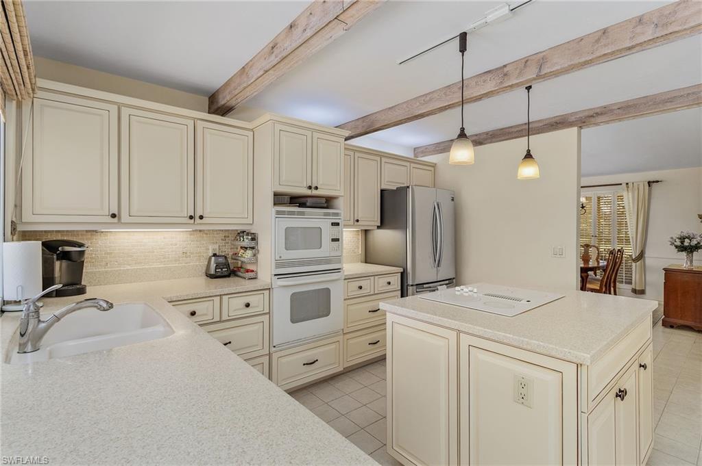 **Seller will pay the $4800 Capital Contribution Fee for buyer at closing** Welcome to Spanish Wells located in the heart of Bonita Springs. Surrounded by large oak and palm trees, this home offers 4 bedrooms, 3 full bathrooms, oversized 2 stall garage with plenty of storage space and a drive through 1/2 circle driveway. 4th bedroom with en-suite has a separate private entrance perfect for guest room, office or even art studio. The step-down formal living space features vaulted ceilings and connects to a large formal dining room. Kitchen has stunning custom cabinets with eat in breakfast nook, built in stacked microwave & oven and separate cooktop. The family room features vaulted ceilings with natural wood beams and a large tuck away sliding glass door to lanai. Convenient split floorplan with 2 guest bedrooms and guest bathroom. The large primary bedroom includes private entrance to lanai, large walk-in closet, en-suite bath that features dual sinks, soaking tub and large walk-in shower. The laundry room has built in cabinets and sink. Sliding glass doors to the patio in all rooms facing the lanai/pool brings in plenty of natural light throughout the home and expands the living space to the outdoor oasis, perfect for entertaining. Outdoor lanai includes a pool with an expansive outdoor living space and electric storm shutters. You will love the pond and golf course views. The eastern exposure is perfect for morning sunrises! Optional Spanish Wells Golf Club Offers a variety of membership options which can include golf, pickleball, tennis, bocce ball, restaurant, and many attractions for the outdoor enthusiast. Close to Bonita Beach, restaurants, RSW airport and shopping!