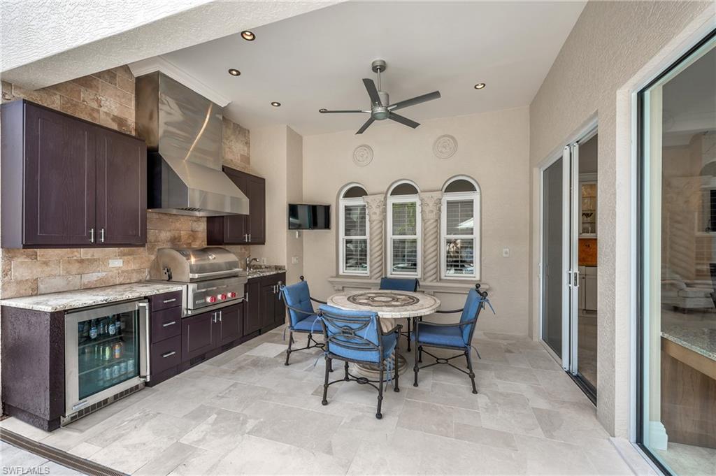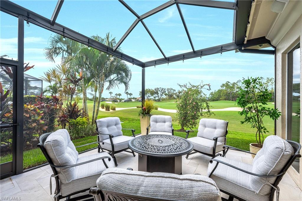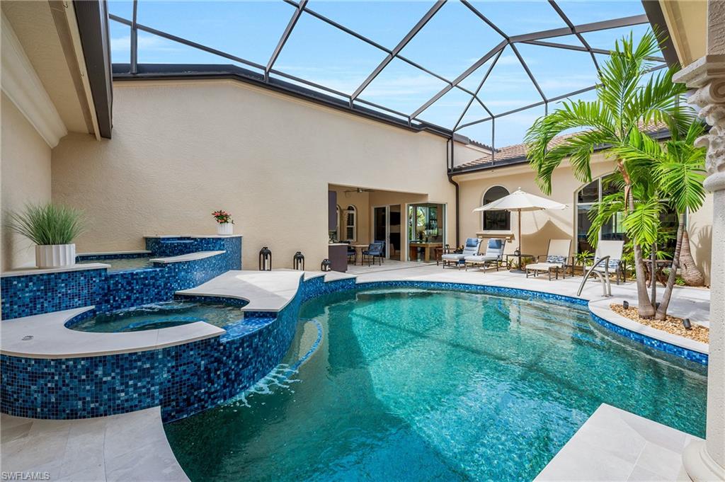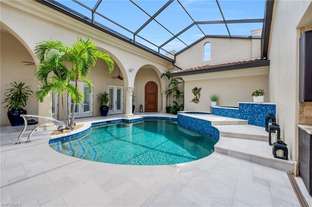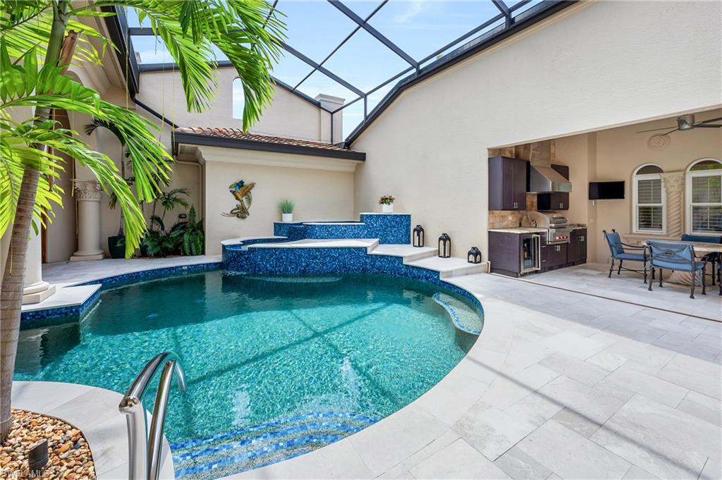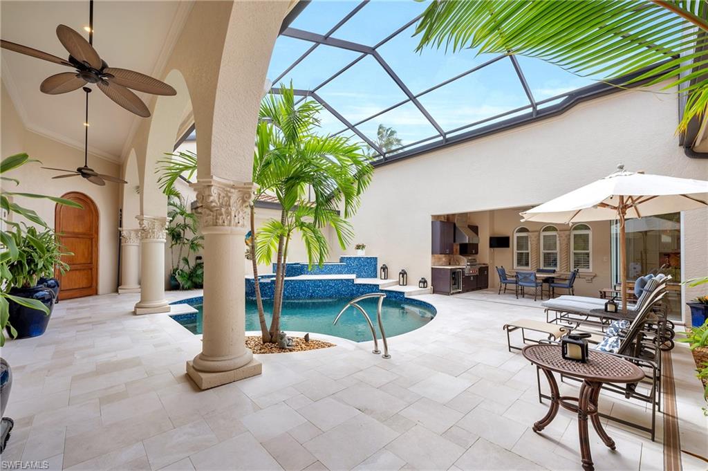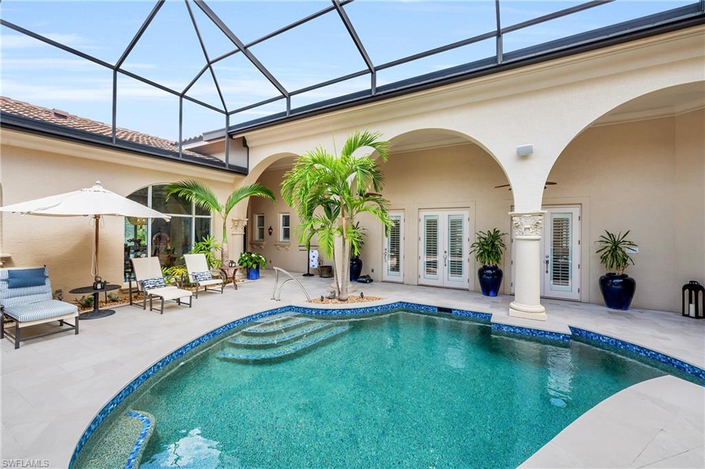 An extraordinary residence awaits in Kensington Country Club, perfectly positioned on the #4 Signature Hole. Beyond the grand Mahogany front door, an updated courtyard oasis welcomes you, where a fully renovated saltwater pool and spa, complemented by an outdoor kitchen, create a serene retreat that sets the tone for the artful craftsmanship and luxurious living that unfolds throughout this stunning 3-bed-plus-den, 3.5-bath home. The formal living room captivates with a distinctive fifth-wall teak plank accent, creating an inviting and refined ambiance. Walls of windows usher in natural light, seamlessly blending indoor and outdoor living while offering uninterrupted views of the greens through the newly added picture frame screen enclosure on the second lanai. This space feels like a front-row seat to the golf course, where western exposure provides majestic sunsets as the day fades over the fairway. The gourmet kitchen is a visual and functional masterpiece designed to delight even the most discerning chef. It's both stylish and practical, outfitted with high-end appliances, including Sub Zero Refrigerator, Wolf gas cooktop/range, Wolf Microwave, custom cherry wood cabinetry, and a striking zebra wood island with 2 refrigerated drawers and extra storage. Thoughtful additions like a pot filler, glass subway tile backsplash, and a wine cooler elevate the culinary experience. Adjacent to the kitchen, a wet bar enhances the home's entertaining appeal. Designed for comfort and versatility, the home features two separate living areas—a formal living room and Dining room and Kitchen Great Room with a gas fireplace for cozy evenings. The primary suite is a sanctuary of serenity, showcasing a comprehensive bathroom renovation with modern fixtures, elegant finishes, a massive walk-in shower with intricate tilework, multiple shower heads, and a freestanding soaking tub. The versatile office/den, featuring Custom Cabinetry, a Murphy bed and access to a Jack and Jill bathroom shared with added third bedroom, provides flexible sleeping space and can easily convert to a fourth bedroom, while the private casita off the pool creates an exclusive VIP retreat for guests. Recent impressive updates continue throughout, including the renovation of all bathrooms, a primary bedroom refresh, complete interior and ceiling painting, freshly painted exteriors, and new garage doors with sleek epoxy flooring. The courtyard area and pool were completely renovated, the back lanai sports new Leathered Marble and both areas have newly enclosed with super screens. Embrace a lifestyle of luxury and timeless beauty in this extraordinary Kensington estate.