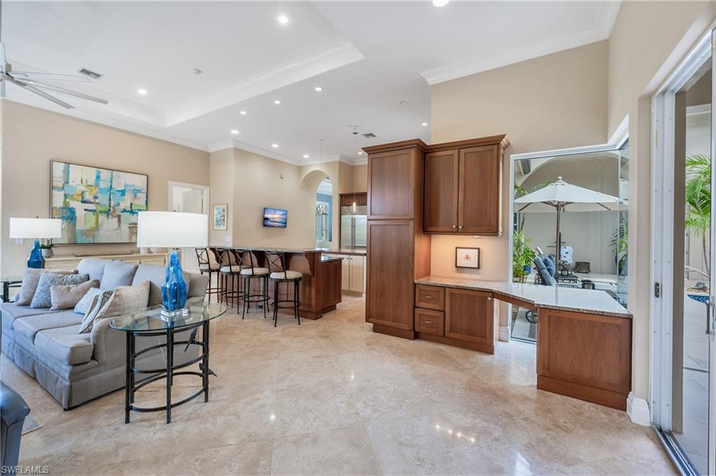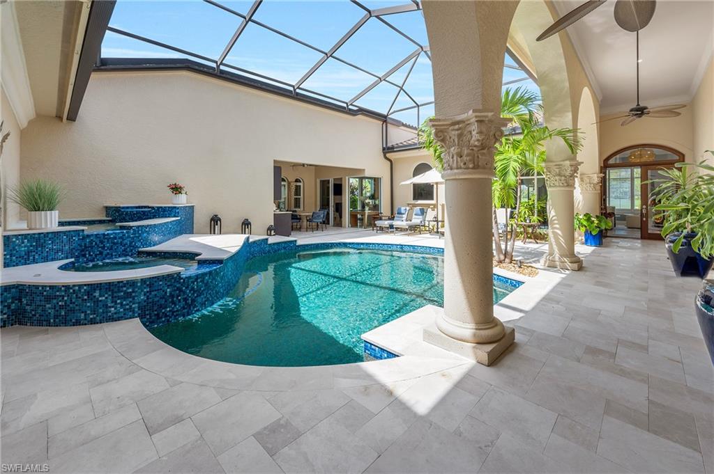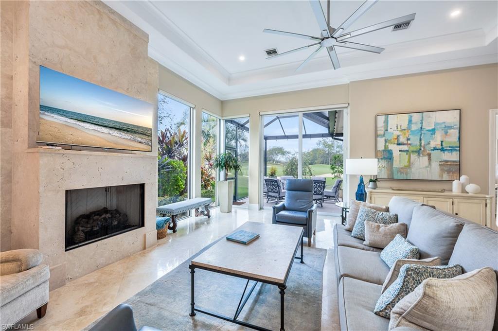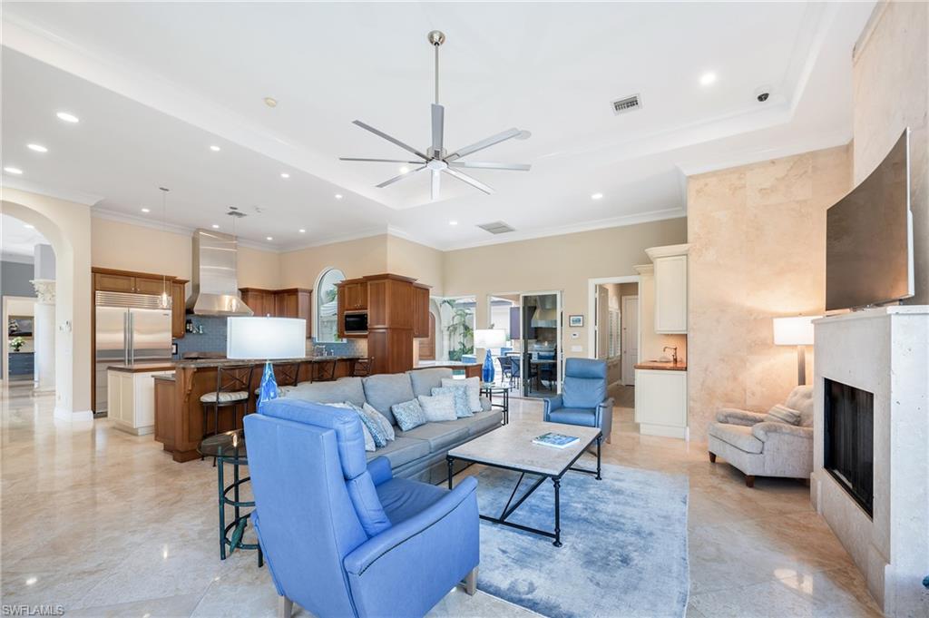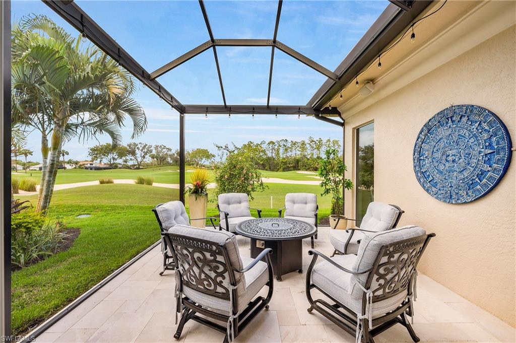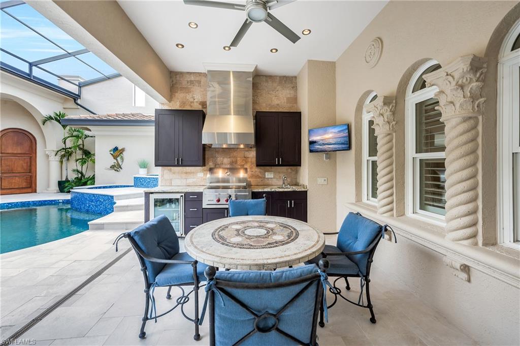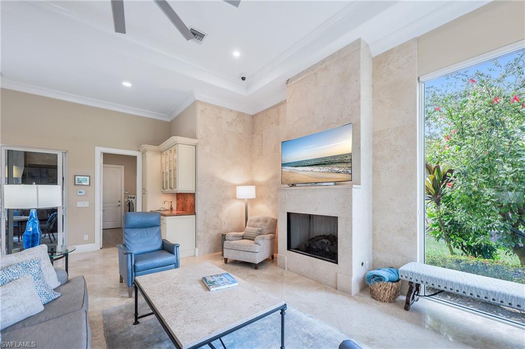 An extraordinary residence awaits in Kensington Country Club, perfectly positioned on the #4 Signature Hole. Beyond the grand Mahogany front door, an updated courtyard oasis welcomes you, where a fully renovated saltwater pool and spa, complemented by an outdoor kitchen, create a serene retreat that sets the tone for the artful craftsmanship and luxurious living that unfolds throughout this stunning 3-bed-plus-den, 3.5-bath home. The formal living room captivates with a distinctive fifth-wall teak plank accent, creating an inviting and refined ambiance. Walls of windows usher in natural light, seamlessly blending indoor and outdoor living while offering uninterrupted views of the greens through the newly added picture frame screen enclosure on the second lanai. This space feels like a front-row seat to the golf course, where western exposure provides majestic sunsets as the day fades over the fairway. The gourmet kitchen is a visual and functional masterpiece designed to delight even the most discerning chef. It's both stylish and practical, outfitted with high-end appliances, including Sub Zero Refrigerator, Wolf gas cooktop/range, Wolf Microwave, custom cherry wood cabinetry, and a striking zebra wood island with 2 refrigerated drawers and extra storage. Thoughtful additions like a pot filler, glass subway tile backsplash, and a wine cooler elevate the culinary experience. Adjacent to the kitchen, a wet bar enhances the home's entertaining appeal. Designed for comfort and versatility, the home features two separate living areas—a formal living room and Dining room and Kitchen Great Room with a gas fireplace for cozy evenings. The primary suite is a sanctuary of serenity, showcasing a comprehensive bathroom renovation with modern fixtures, elegant finishes, a massive walk-in shower with intricate tilework, multiple shower heads, and a freestanding soaking tub. The versatile office/den, featuring Custom Cabinetry, a Murphy bed and access to a Jack and Jill bathroom shared with added third bedroom, provides flexible sleeping space and can easily convert to a fourth bedroom, while the private casita off the pool creates an exclusive VIP retreat for guests. Recent impressive updates continue throughout, including the renovation of all bathrooms, a primary bedroom refresh, complete interior and ceiling painting, freshly painted exteriors, and new garage doors with sleek epoxy flooring. The courtyard area and pool were completely renovated, the back lanai sports new Leathered Marble and both areas have newly enclosed with super screens. Embrace a lifestyle of luxury and timeless beauty in this extraordinary Kensington estate.