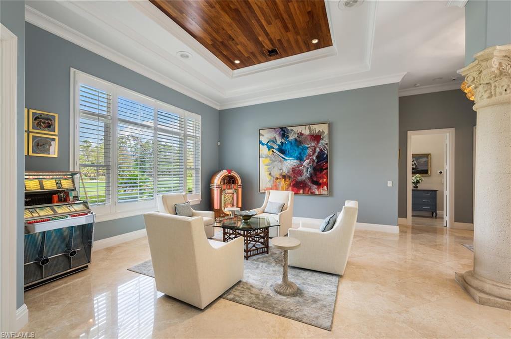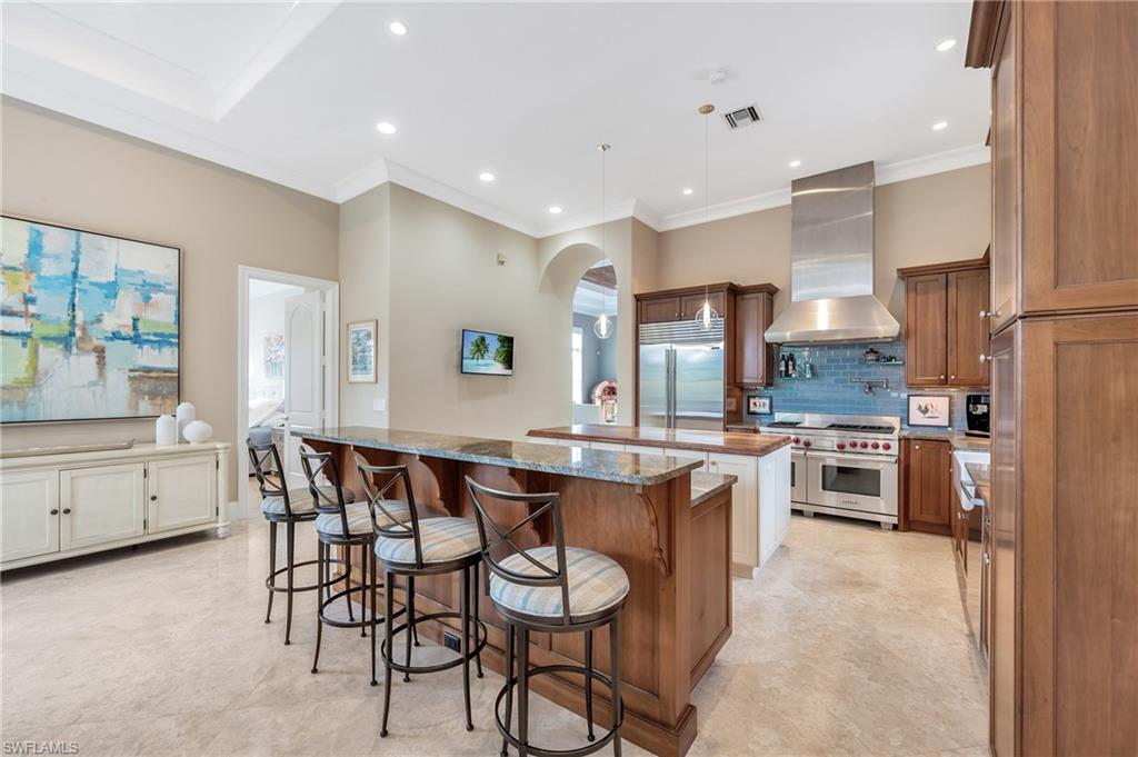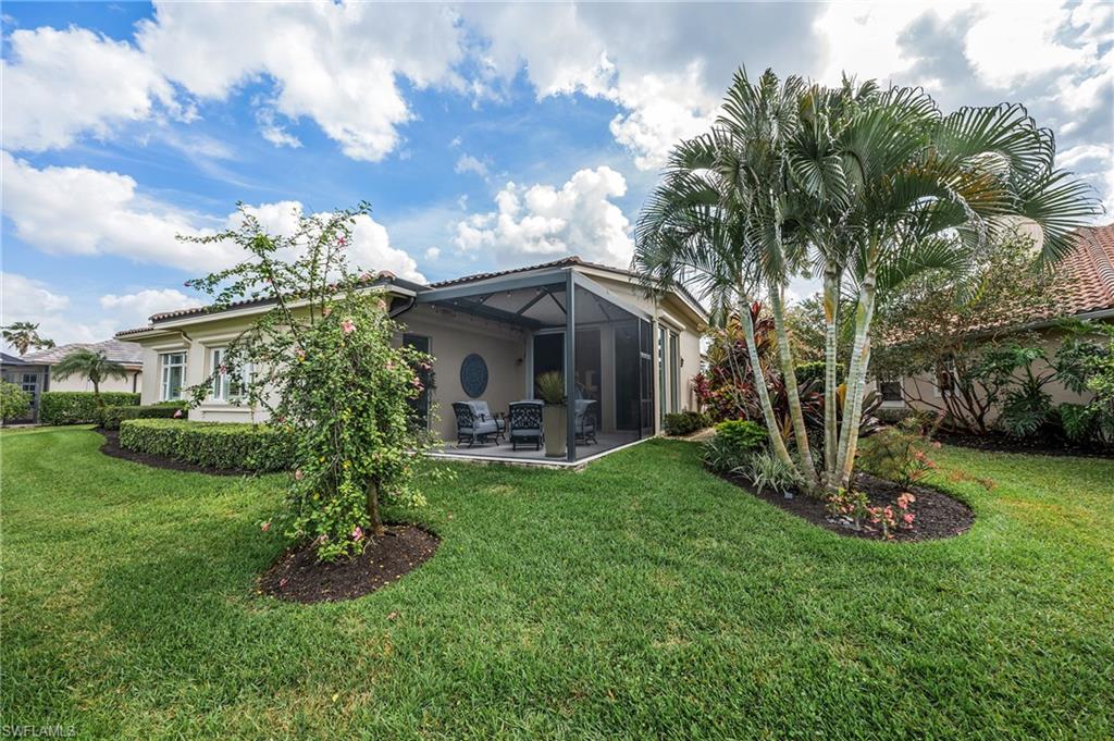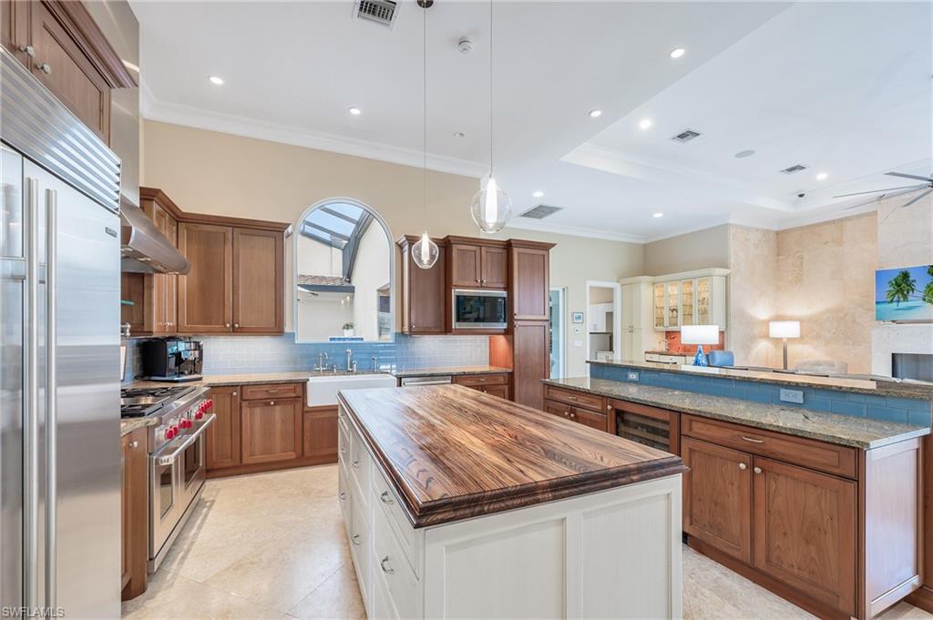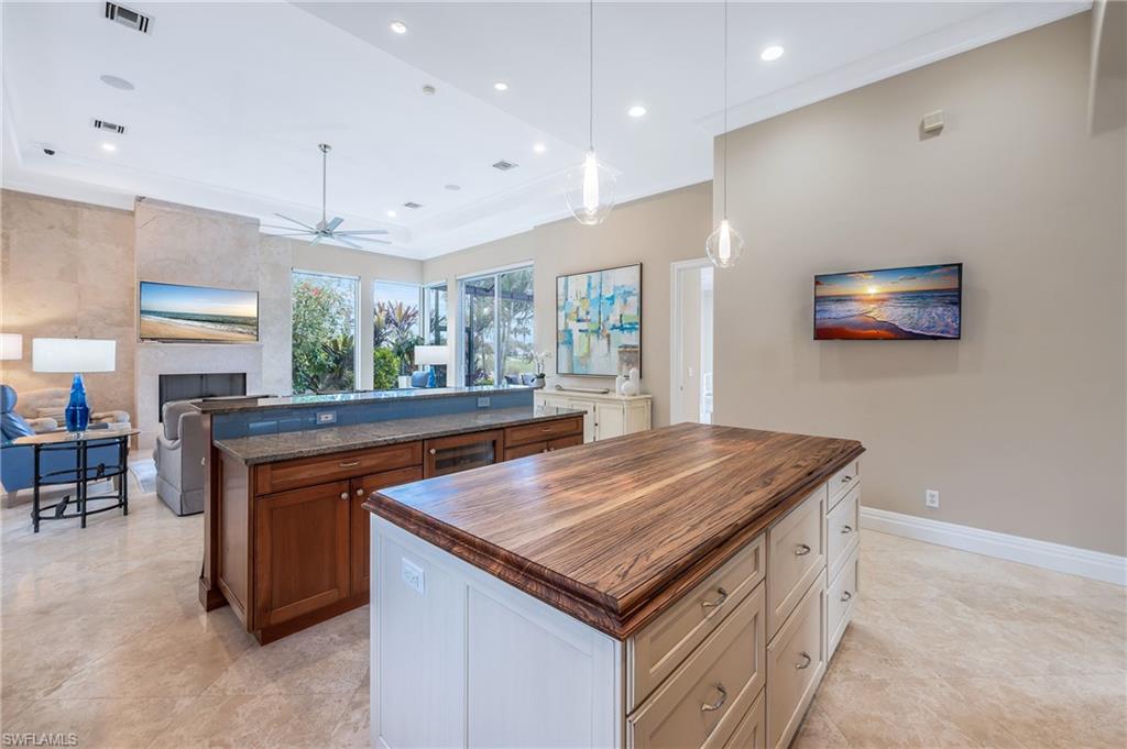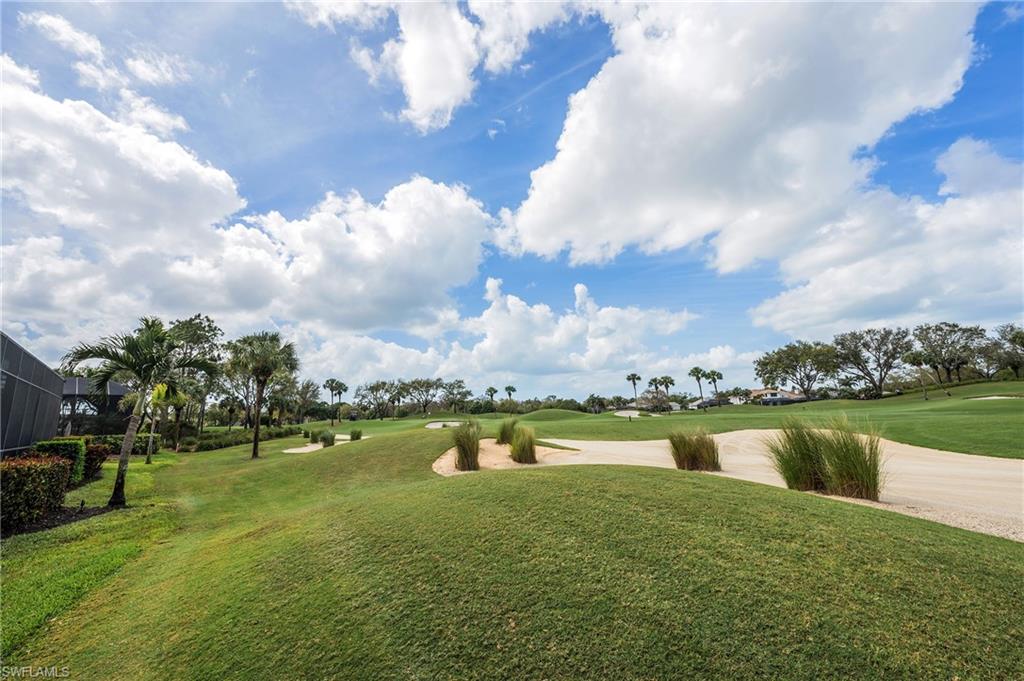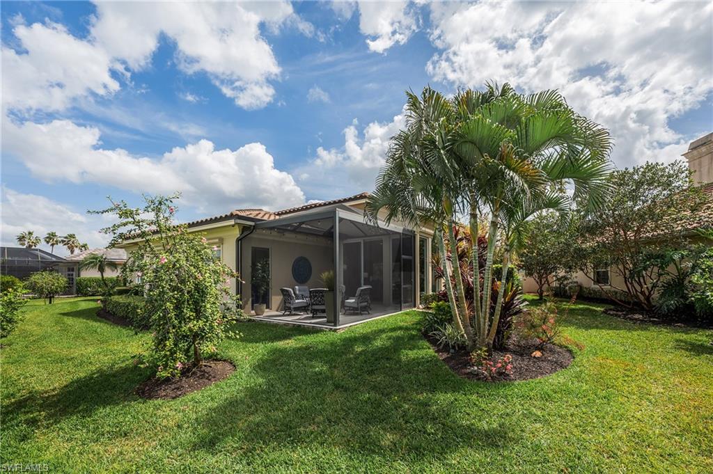 An extraordinary residence awaits in Kensington Country Club, perfectly positioned on the #4 Signature Hole. Beyond the grand Mahogany front door, an updated courtyard oasis welcomes you, where a fully renovated saltwater pool and spa, complemented by an outdoor kitchen, create a serene retreat that sets the tone for the artful craftsmanship and luxurious living that unfolds throughout this stunning 3-bed-plus-den, 3.5-bath home. The formal living room captivates with a distinctive fifth-wall teak plank accent, creating an inviting and refined ambiance. Walls of windows usher in natural light, seamlessly blending indoor and outdoor living while offering uninterrupted views of the greens through the newly added picture frame screen enclosure on the second lanai. This space feels like a front-row seat to the golf course, where western exposure provides majestic sunsets as the day fades over the fairway. The gourmet kitchen is a visual and functional masterpiece designed to delight even the most discerning chef. It's both stylish and practical, outfitted with high-end appliances, including Sub Zero Refrigerator, Wolf gas cooktop/range, Wolf Microwave, custom cherry wood cabinetry, and a striking zebra wood island with 2 refrigerated drawers and extra storage. Thoughtful additions like a pot filler, glass subway tile backsplash, and a wine cooler elevate the culinary experience. Adjacent to the kitchen, a wet bar enhances the home's entertaining appeal. Designed for comfort and versatility, the home features two separate living areas—a formal living room and Dining room and Kitchen Great Room with a gas fireplace for cozy evenings. The primary suite is a sanctuary of serenity, showcasing a comprehensive bathroom renovation with modern fixtures, elegant finishes, a massive walk-in shower with intricate tilework, multiple shower heads, and a freestanding soaking tub. The versatile office/den, featuring Custom Cabinetry, a Murphy bed and access to a Jack and Jill bathroom shared with added third bedroom, provides flexible sleeping space and can easily convert to a fourth bedroom, while the private casita off the pool creates an exclusive VIP retreat for guests. Recent impressive updates continue throughout, including the renovation of all bathrooms, a primary bedroom refresh, complete interior and ceiling painting, freshly painted exteriors, and new garage doors with sleek epoxy flooring. The courtyard area and pool were completely renovated, the back lanai sports new Leathered Marble and both areas have newly enclosed with super screens. Embrace a lifestyle of luxury and timeless beauty in this extraordinary Kensington estate.