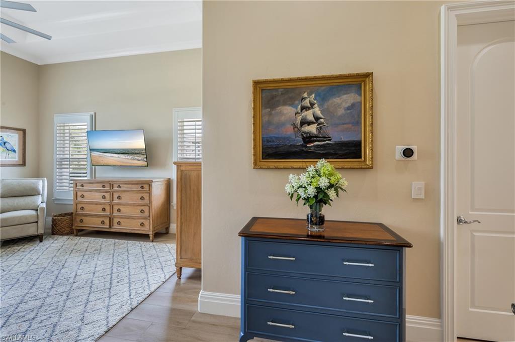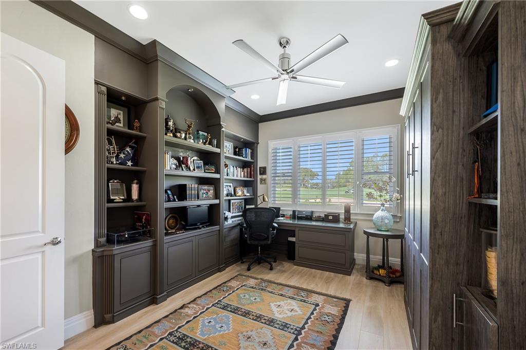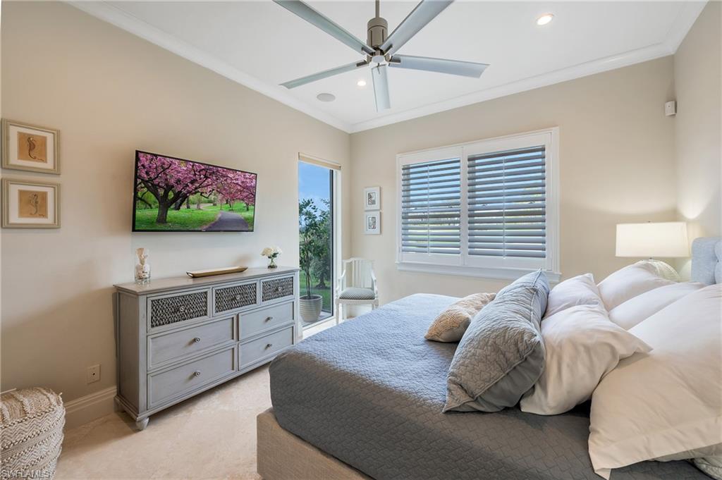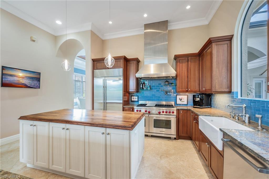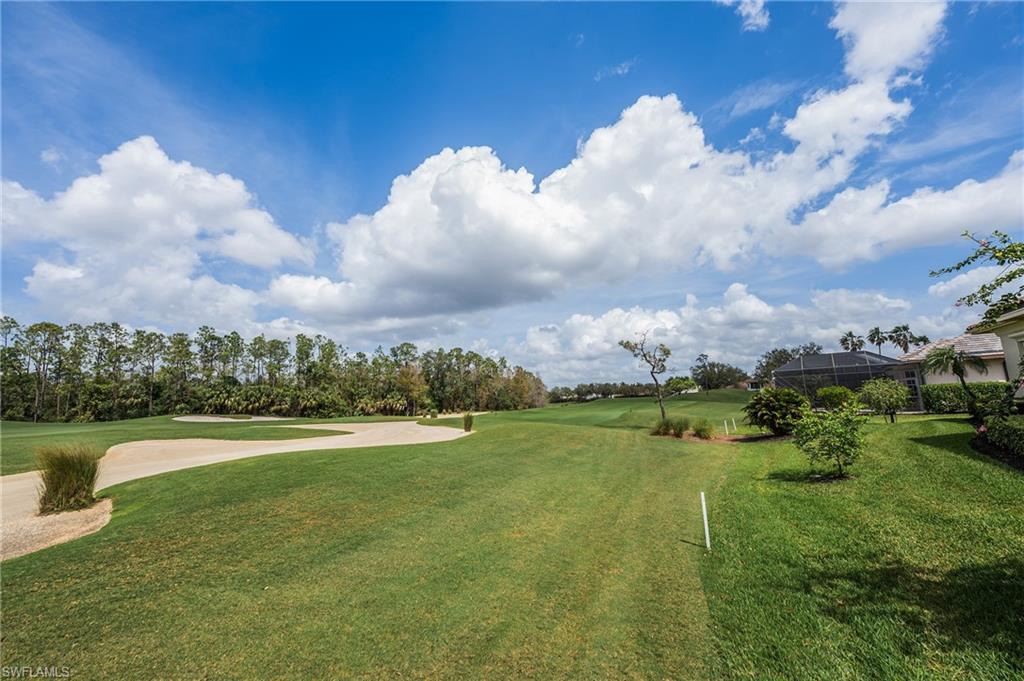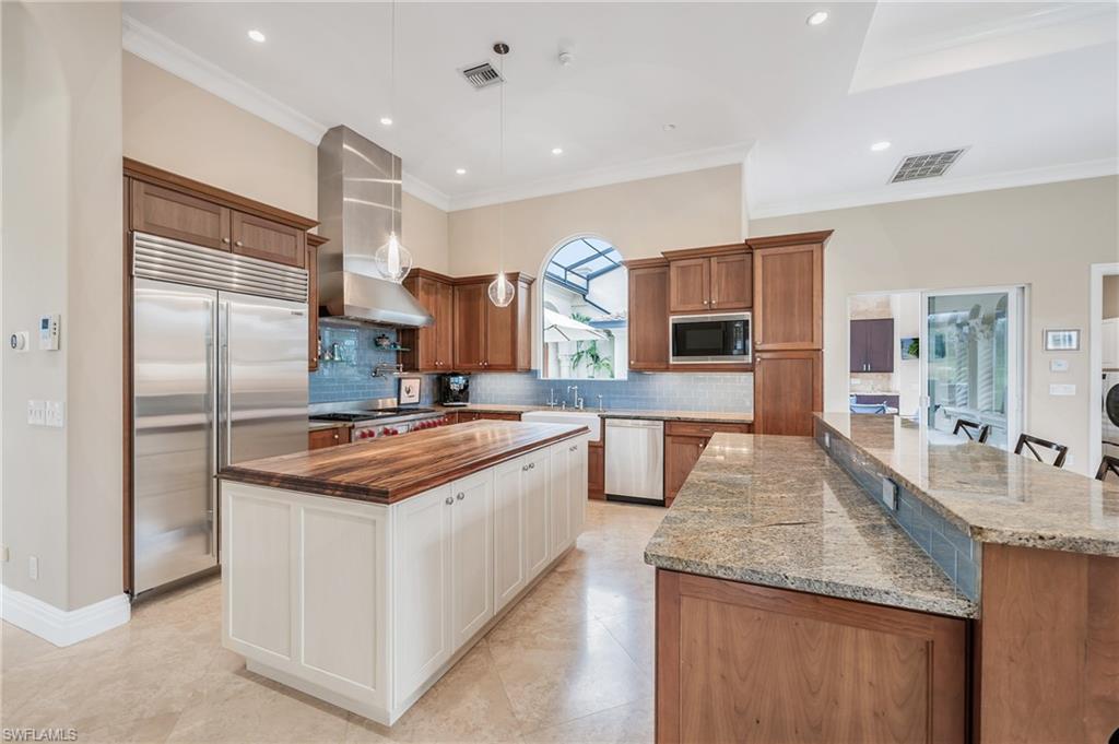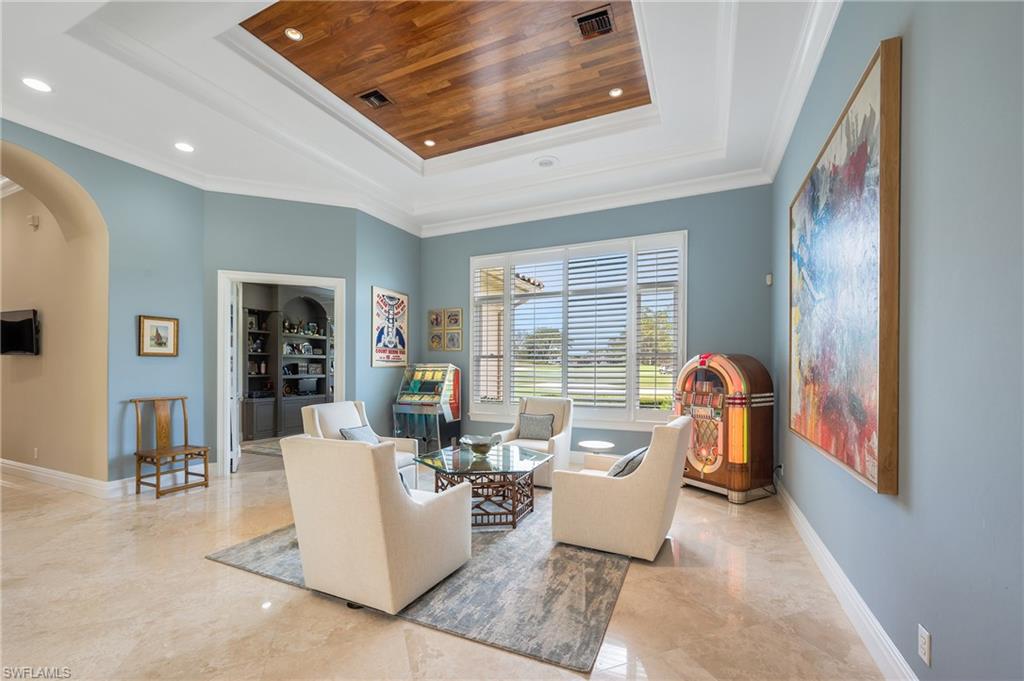 An extraordinary residence awaits in Kensington Country Club, perfectly positioned on the #4 Signature Hole. Beyond the grand Mahogany front door, an updated courtyard oasis welcomes you, where a fully renovated saltwater pool and spa, complemented by an outdoor kitchen, create a serene retreat that sets the tone for the artful craftsmanship and luxurious living that unfolds throughout this stunning 3-bed-plus-den, 3.5-bath home. The formal living room captivates with a distinctive fifth-wall teak plank accent, creating an inviting and refined ambiance. Walls of windows usher in natural light, seamlessly blending indoor and outdoor living while offering uninterrupted views of the greens through the newly added picture frame screen enclosure on the second lanai. This space feels like a front-row seat to the golf course, where western exposure provides majestic sunsets as the day fades over the fairway. The gourmet kitchen is a visual and functional masterpiece designed to delight even the most discerning chef. It's both stylish and practical, outfitted with high-end appliances, including Sub Zero Refrigerator, Wolf gas cooktop/range, Wolf Microwave, custom cherry wood cabinetry, and a striking zebra wood island with 2 refrigerated drawers and extra storage. Thoughtful additions like a pot filler, glass subway tile backsplash, and a wine cooler elevate the culinary experience. Adjacent to the kitchen, a wet bar enhances the home's entertaining appeal. Designed for comfort and versatility, the home features two separate living areas—a formal living room and Dining room and Kitchen Great Room with a gas fireplace for cozy evenings. The primary suite is a sanctuary of serenity, showcasing a comprehensive bathroom renovation with modern fixtures, elegant finishes, a massive walk-in shower with intricate tilework, multiple shower heads, and a freestanding soaking tub. The versatile office/den, featuring Custom Cabinetry, a Murphy bed and access to a Jack and Jill bathroom shared with added third bedroom, provides flexible sleeping space and can easily convert to a fourth bedroom, while the private casita off the pool creates an exclusive VIP retreat for guests. Recent impressive updates continue throughout, including the renovation of all bathrooms, a primary bedroom refresh, complete interior and ceiling painting, freshly painted exteriors, and new garage doors with sleek epoxy flooring. The courtyard area and pool were completely renovated, the back lanai sports new Leathered Marble and both areas have newly enclosed with super screens. Embrace a lifestyle of luxury and timeless beauty in this extraordinary Kensington estate.