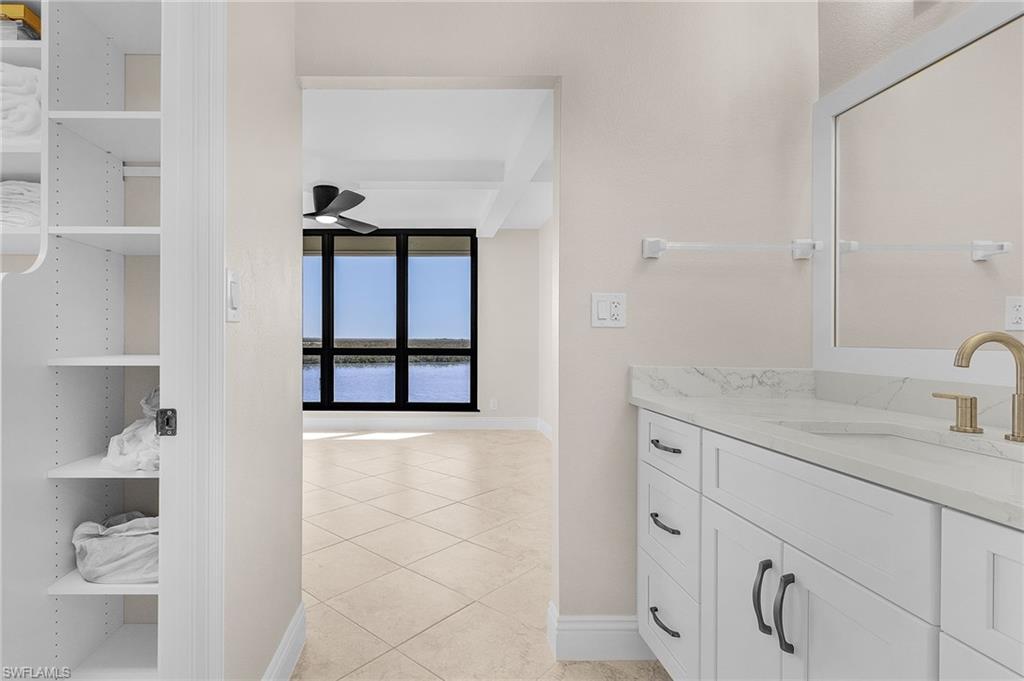 Stunning condo at The Palms at Bay Beach. From the moment you walk into this 2 bed/2 bath condo, you will be in awe of the breathtaking Estero Bay views. Fully updated and move in ready! No expense was spared!! New kitchen with soft close white shaker cabinets, brushed nickel hardware, all new appliances (never used), quartz counter tops and recessed lighting. Open floor plan perfect for entertaining. Coffered ceilings with recessed lighting in the dining room and living room add a touch of elegance to this Fort Myers Beach condo. Bathrooms have been fully updated with new soft close cabinets, hardware and tile showers. Main bedroom offers panoramic views of the bay, walk in closets with built in shelves & drawers and fully updated bathroom. The split bedrooms offer privacy for guests. Guest room has stunning Gulf Views, cedar shelf in closet and new light/ceiling fan. New electric wiring throughout, 4 new electric smoke alarms including 1 new dual smoke carbon monoxide alarm in living room, newer AC and Water heater. Tile flooring throughout. In unit laundry room with new built in cabinets and new washer and dryer. The Palms offers amazing amenities with pool, shuffleboard, fitness center and club house. Additional EBIA Amenities include walking paths, pickleball, bocce ball, tennis, chipping greens, driving cage, tiki huts, deeded beach access, and fishing pier. Boat slips available for purchase on Bay Beach Lane. Conveniently located on the South end of the island close to Santini Plaza, Marina, Lovers Key State Park, Restaurants and shopping!!
