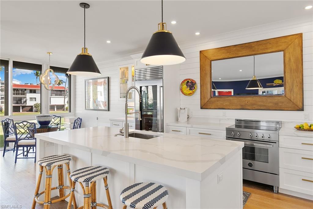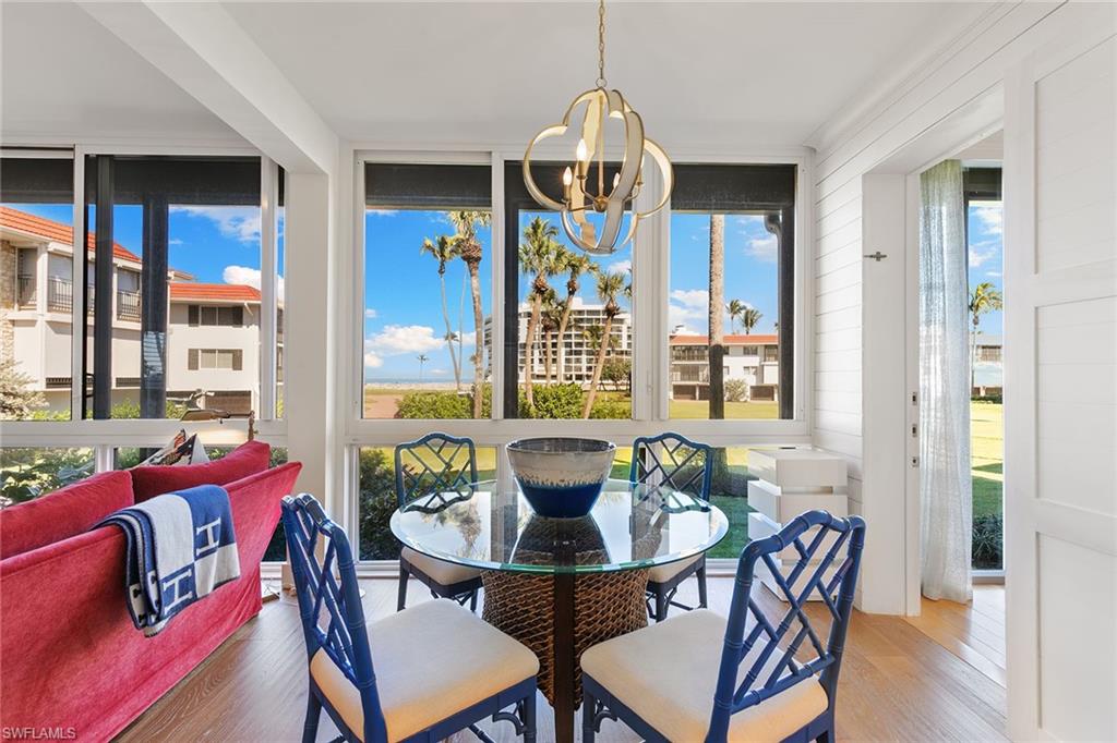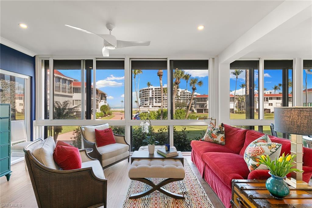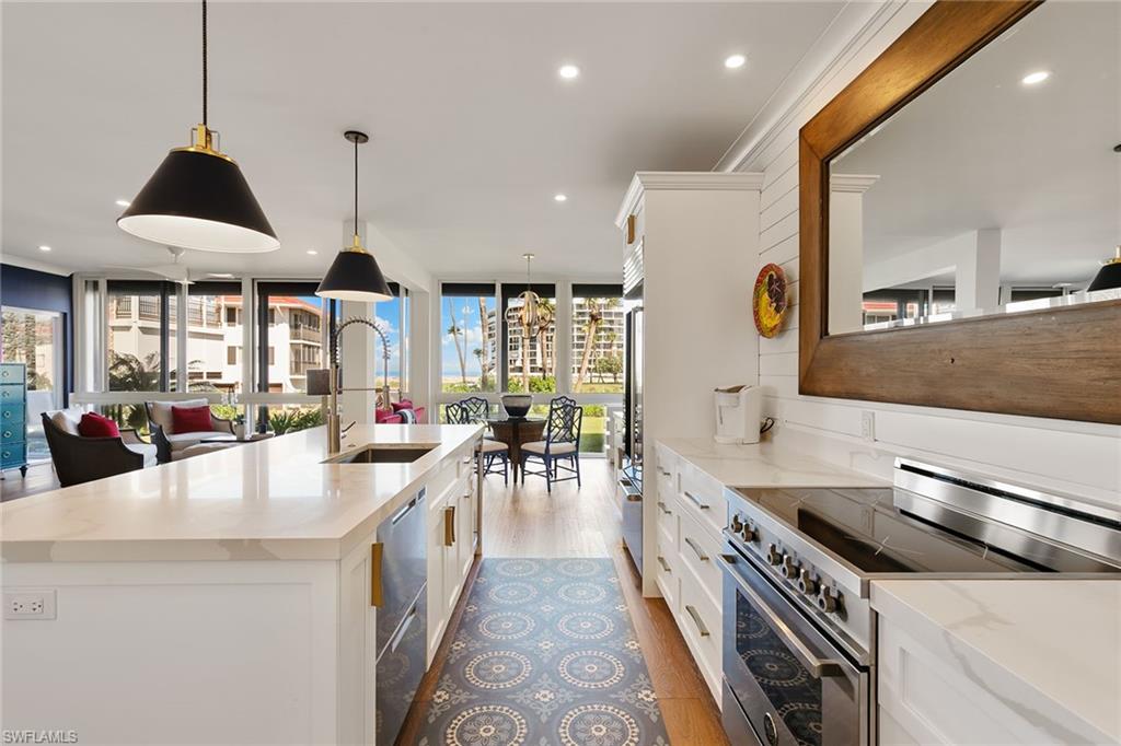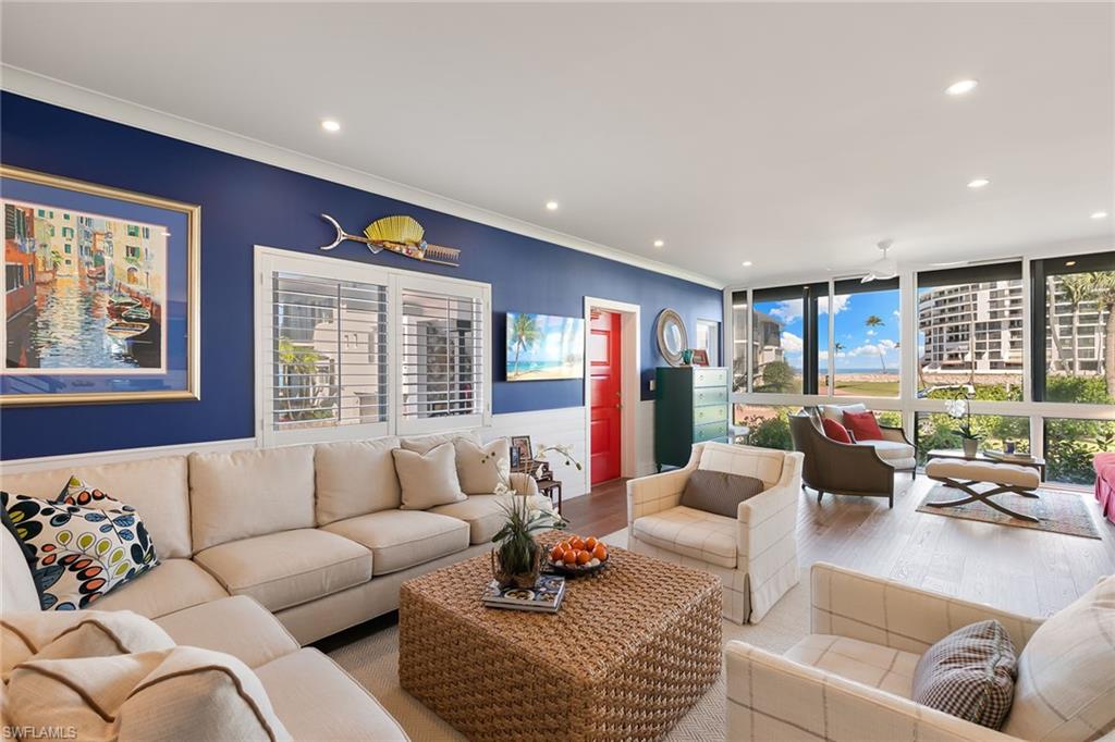 This condominium is south of Doctors Pass and just 60 steps to the beach! The newly renovated two-bedroom, two-bath condominium has an open floor plan, floor-to-ceiling wall of sliding windows, wood floors, tall ceilings and a one-car enclosed garage. The kitchen has a pantry, Sub-Zero refrigerator, dishwasher drawers, wine refrigerator, range and large stainless-steel sink with disposal. Primary bedroom has a king bed, walk-in closet, and two additional closets plus en-suite bath with walk-in shower. The guest room has a queen bed with en-suite guest bath with shower and tub. In-unit laundry makes it a great place to live. Rare opportunity to own two connecting condominiums because 2201 Gulf Shore Blvd. N unit E1 is also for sale. Both are completely remodeled first-floor condominiums with a hotel-style door between the two units that can be locked so you have two 1,500-square-foot two-bedroom, two-bath condominiums or opened up, so you have one 3,000-square-foot condominium with four bedrooms and four baths. Interior of units has never had damage from hurricanes! Remodeled clubhouse, complete with full kitchen, has a beautiful pool with outdoor grilling area, ice machine, plus boat slips for rent. Famous Fifth Ave South is only 2.3 miles away.