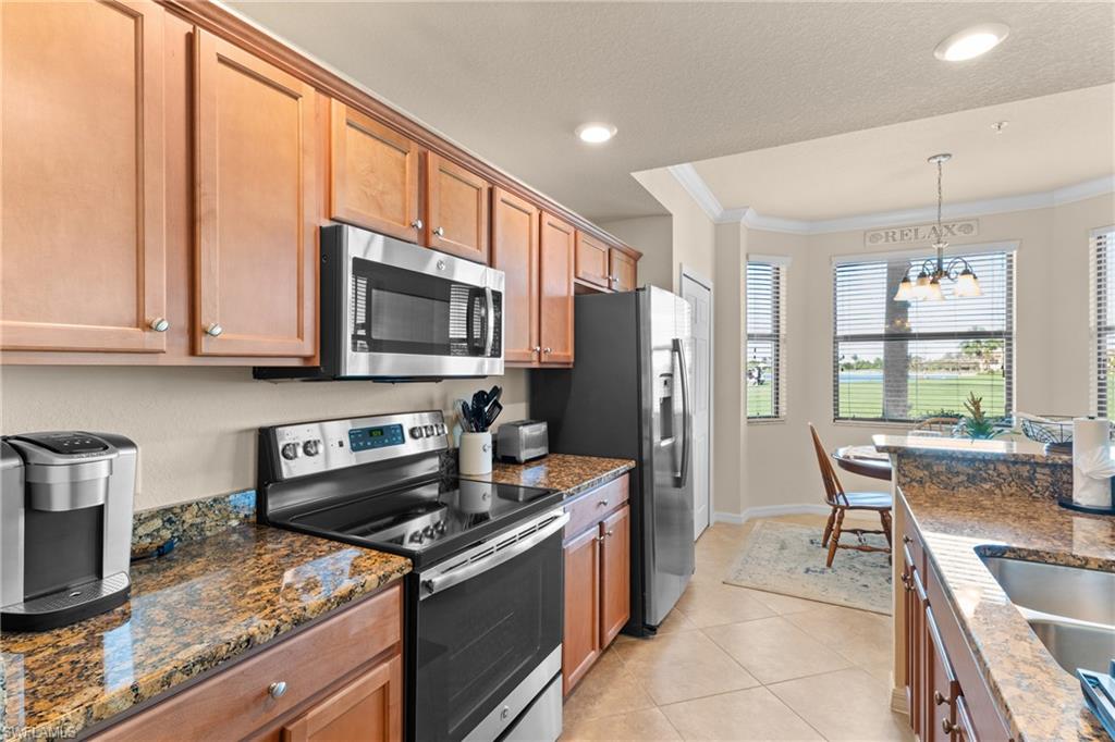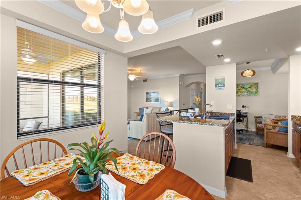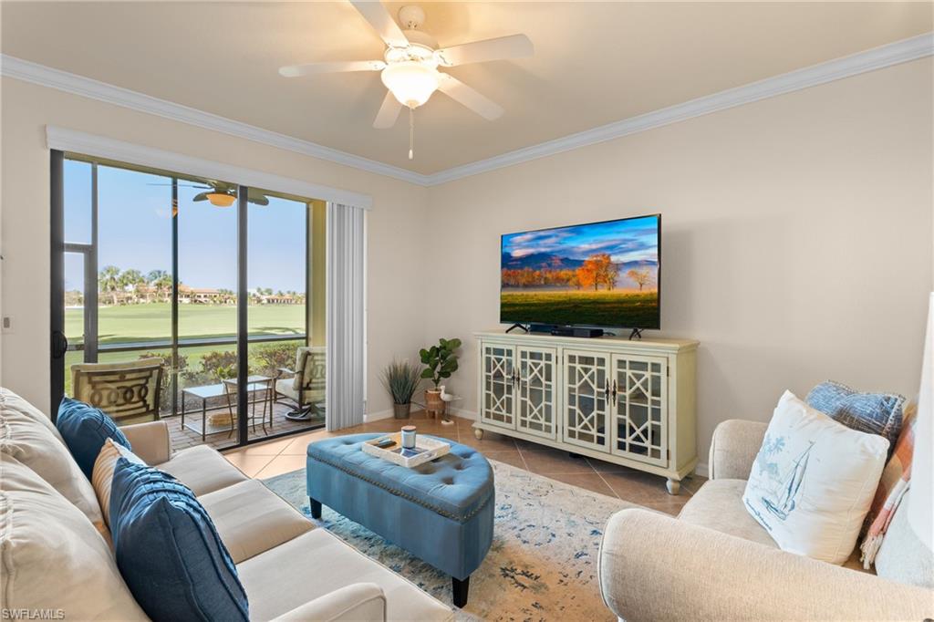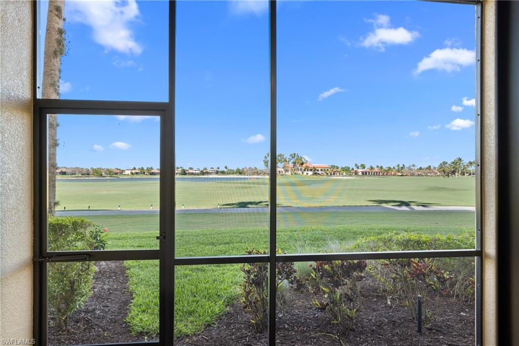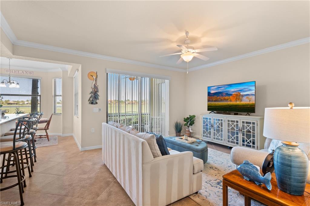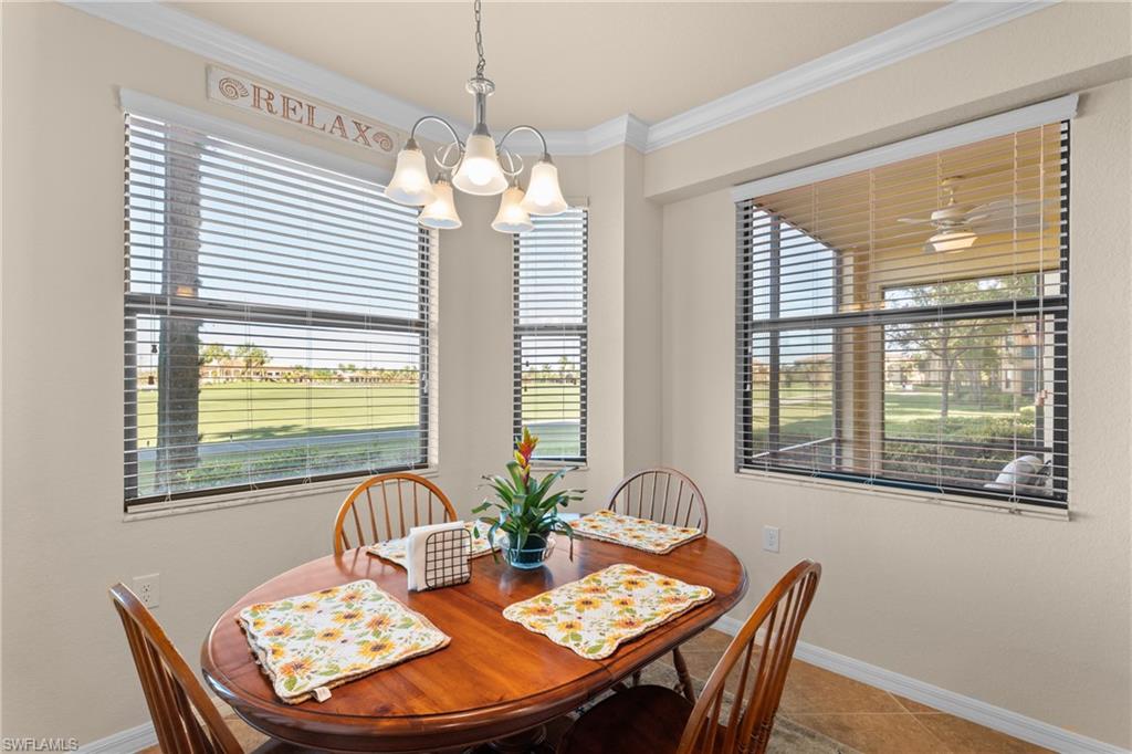 Full golf and amenities available! First floor unit has abundant natural light and open airy floor plan. Kitchen nook and living room overlooks the beautiful golf course and lake views. Enjoy amazing sunsets from the lanai. This is resort style living featuring luxurious amenities including a zero entry lagoon style pool with waterfall, lap lanes, spa, fire pit, BBQ area, fitness center, sauna, full service spa and tennis courts.