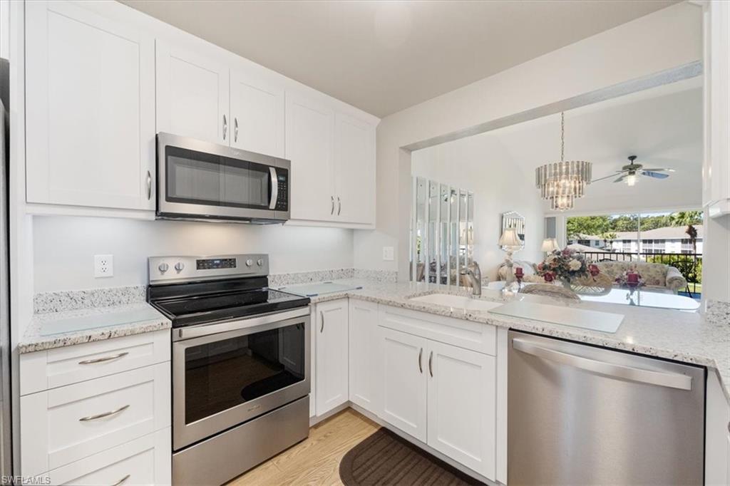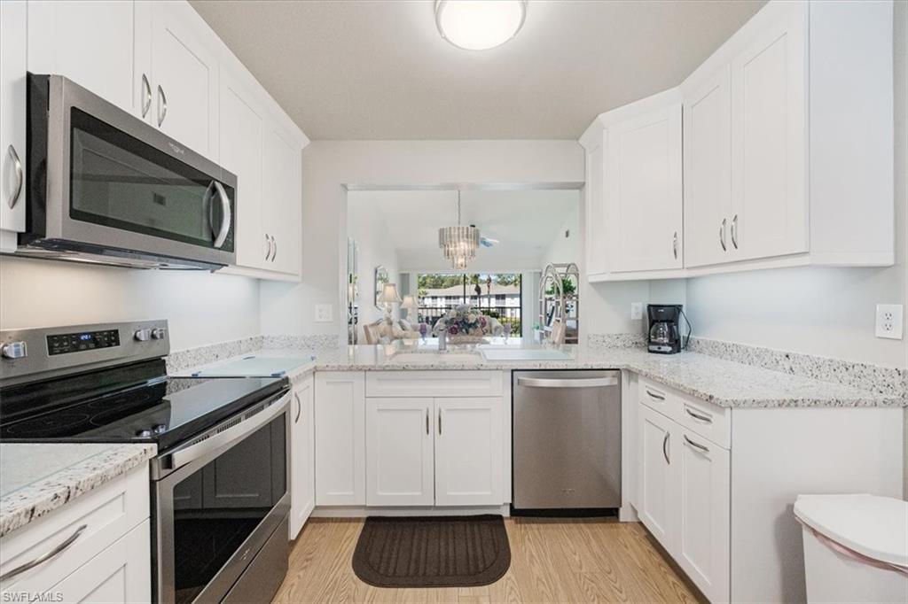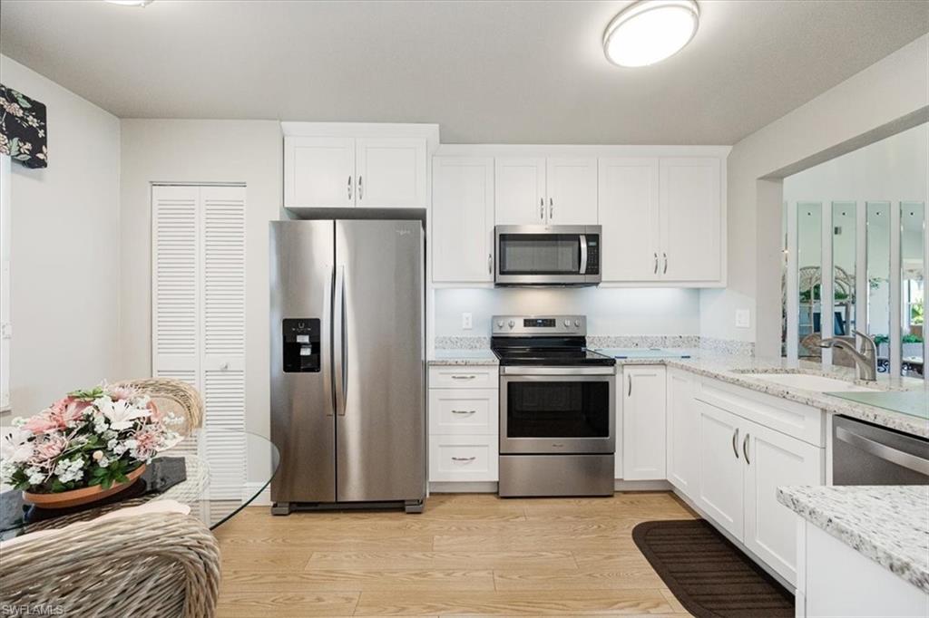 Are YOU Looking for ME! Step into this exceptionally remodeled/Repiped 3-bedroom, 2-bathroom end unit with 1,350 sq. ft. of inviting living space! From the moment you arrive, you’ll feel right at home. The bright, open floor plan is designed for comfort, featuring beautiful vinyl plank flooring that flows seamlessly throughout. The chef-inspired kitchen is a true highlight, with sleek shaker cabinets (including soft-close drawers), stainless steel Whirlpool appliances, a cozy breakfast nook, under cabinet lighting and a spacious pantry. You’ll also notice the stylish, modern fans and light fixtures that add a touch of elegance throughout the home. The bathrooms are both chic and functional, with granite countertops and tiled shower walls. This home was thoughtfully repiped during the remodel, ensuring peace of mind for years to come. Unwind and enjoy western views from your lanai, whether you're wrapping up a busy day or starting your morning off right. The original owners have clearly taken great pride in this immaculate home, which is now ready for new memories and new owners. Canterbury Village offers low fees and an unbeatable location, just minutes from the Berkshire Commons shopping plaza, Publix, restaurants, and more! With easy access to 5th Ave shops, Mercato, and I-75, you’ll love the convenience of everything at your doorstep. Bring your family and start making memories today – this home is waiting for you!