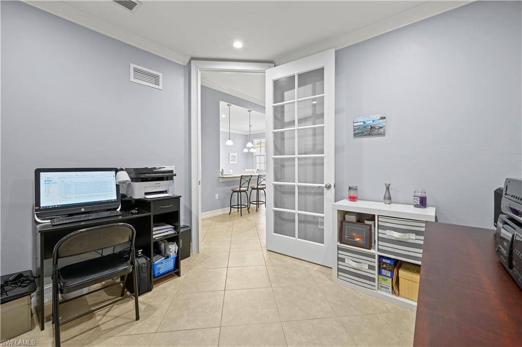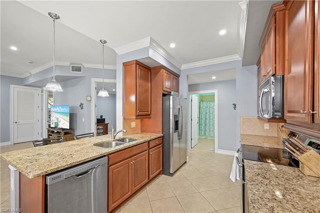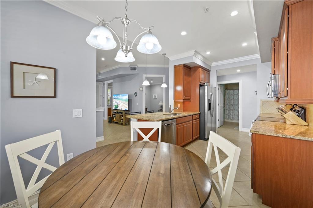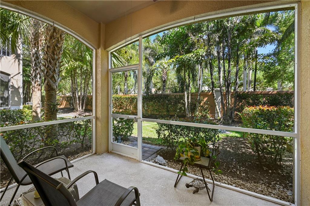 Welcome to this stunning 2-bedroom plus den, 2-bathroom condo located in the desirable community of Sorrento at Bonita Springs, FL. This first-floor unit offers a serene retreat with a private lanai that overlooks a beautifully landscaped area and a privacy wall, providing a peaceful space to relax and unwind. The bright and open floor plan features a well-appointed kitchen with solid wood cabinets, sleek granite countertops, and a cozy breakfast bar — perfect for casual dining or enjoying your morning coffee. The spacious living area leads out to the lanai, offering a perfect setting for indoor-outdoor living. The large primary bedroom is a true sanctuary, complete with a tray ceiling, a generous walk-in closet, and an ensuite bath with dual sinks and a walk-in shower. The second bedroom is equally inviting, and the additional den provides flexibility for an office, guest space, or hobbies. This condo offers resort-style living with a range of fantastic amenities, including a community pool with a waterfall, clubhouse, exercise room, and bocce court. It is also conveniently located near some of the finest dining in the area and the beautiful beaches of Southwest Florida, providing the ideal combination of comfort, convenience, and coastal living. Don’t miss out on this beautiful home! Schedule your showing today!