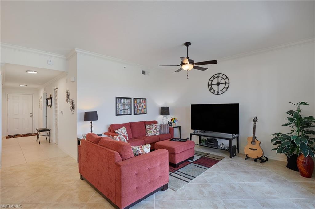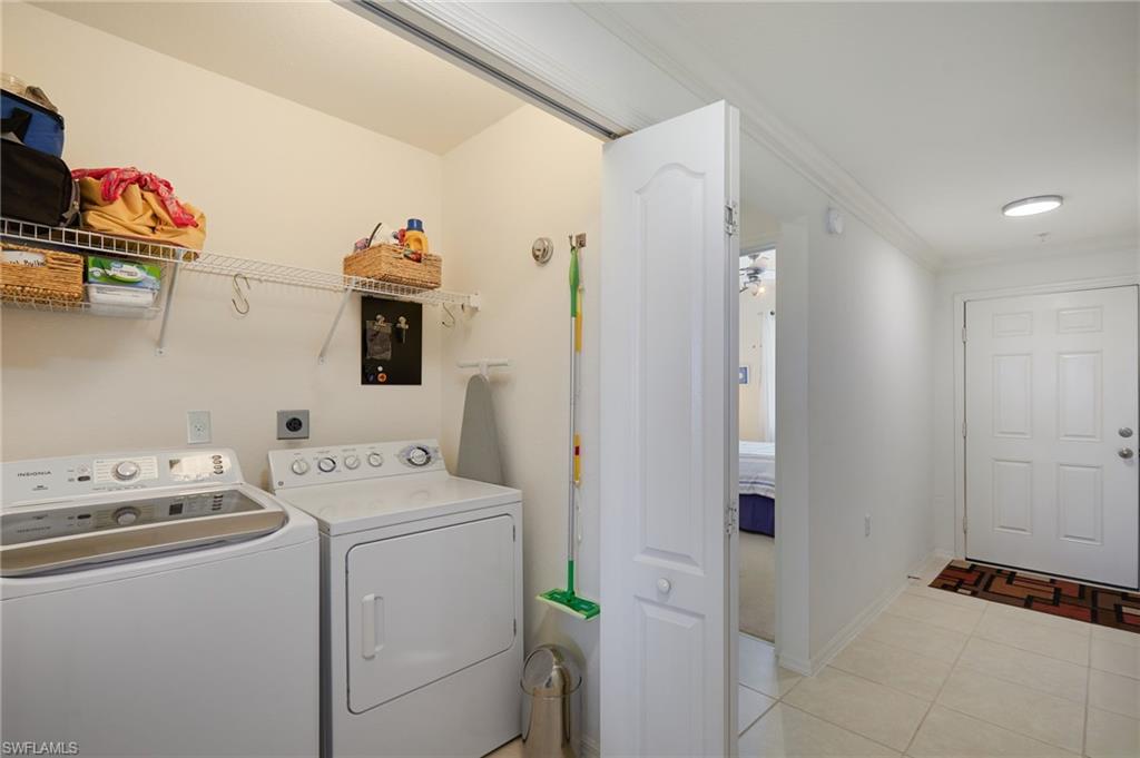 This clean & move-in ready condo in Osprey Cove is the perfect vacation home or year-round residence. Lightly used by seasonal seniors,(non-smokers, no pets) it is being offered turn-key furnished so you can move in and start enjoying a Florida lifestyle right away! Condition is exceptional. You'll enjoy your morning coffee from the tiled lanai with a tranquil view of the lake + fountains. In the evening, you'll marvel at the amazing SW Florida sunsets! There's easy to care for tile in the main living areas, carpet only in the bedrooms. There's crown molding in the entry, living room, dining room and kitchen. Recent improvements include water heater (2023) and washer (2024). The building has an ELEVATOR & just outside the front door is your spacious (5 x 19) storage closet for your holiday decor, beach chairs, tools or golf clubs. Association fees include cable, water, sewer, trash, lawn and landscaping maintenance, irrigation, professional management, building maintenance and exterior insurance, amenities, and FULLY FUNDED RESERVES. There aren't any CDD fees. Note: building roof was replaced in 2024. Exterior painting of the building was just completed, with refreshed landscaping upgrades to follow, all without any special assessments. The condo has Hurricane protected and energy efficient IMPACT WINDOWS & DOORS. Included is a designated covered parking space and there is ample guest parking. The resort style amenities include a modern clubhouse within a short walking distance with a well equipped fitness room, billiards, large heated community pool & hot tub- all just a 2 minute walk from your condo. There are lots of activities and opportunities to make new friends- game nights, dinner outings, Saturday morning coffee gathering. LOCATION LOCATION LOCATION! Osprey Cove has an enviable location- it's walking distance to WalMart, Aldi, Sprouts and Starbucks. It's just a short drive to Publix, Costco, Gulf Coast Town Center and Coconut Pointe Mall with a multitude of shopping and restaurant choices, and the beautiful Gulf beaches. Don't miss this opportunity to make this move-in ready condo your own! ** Closed sales price was $220,000, and buyer paid additional $15,000 for personal property/furnishings.