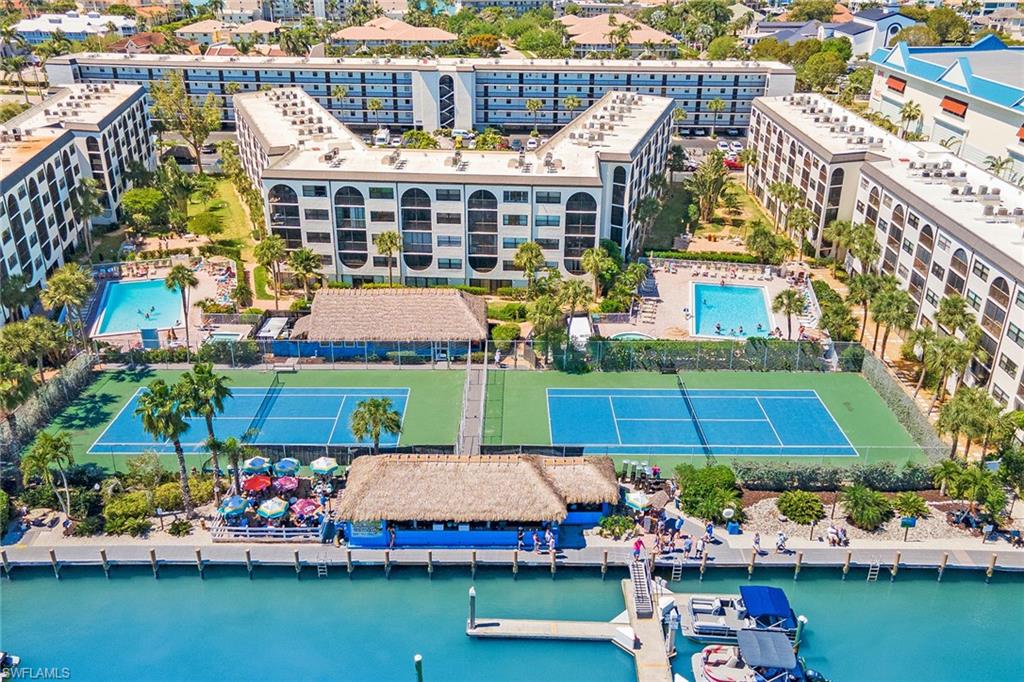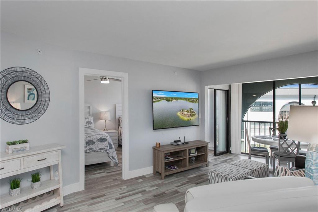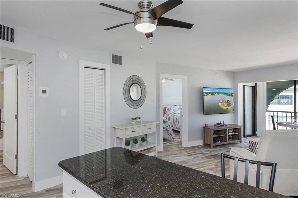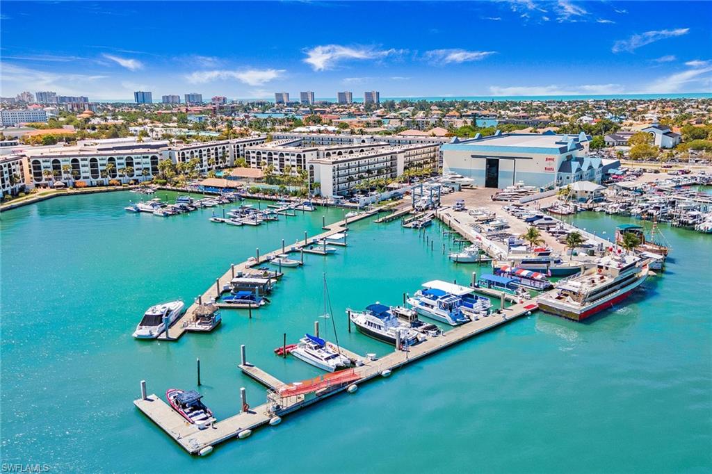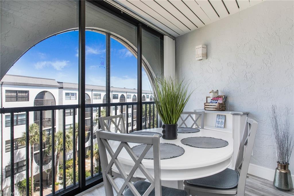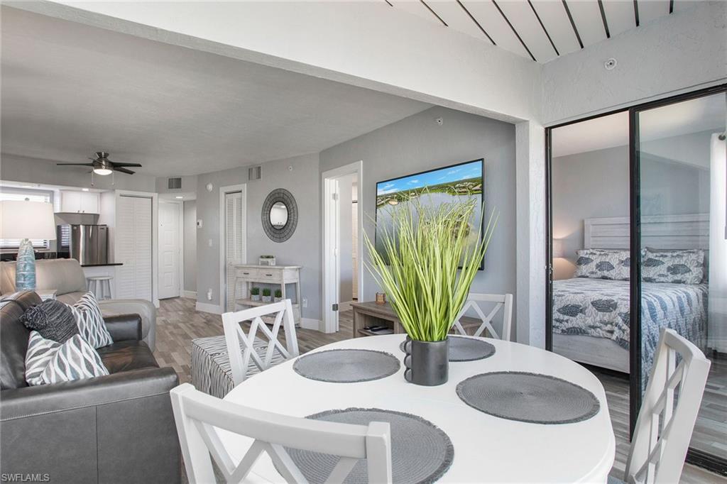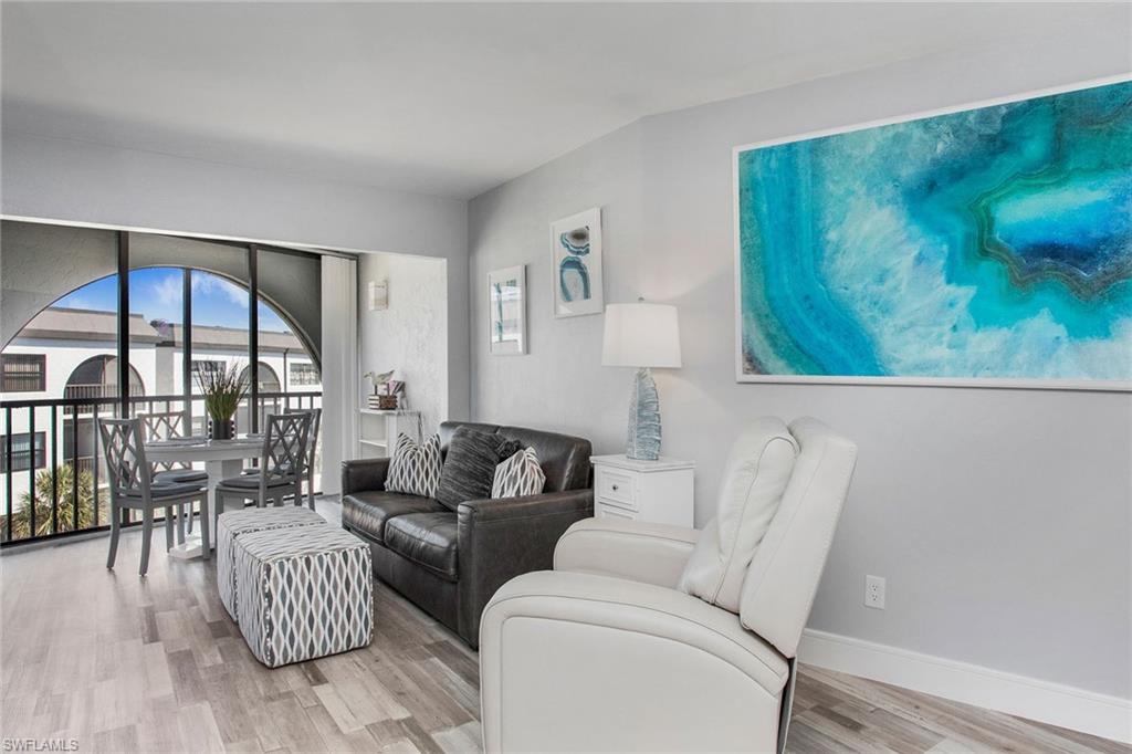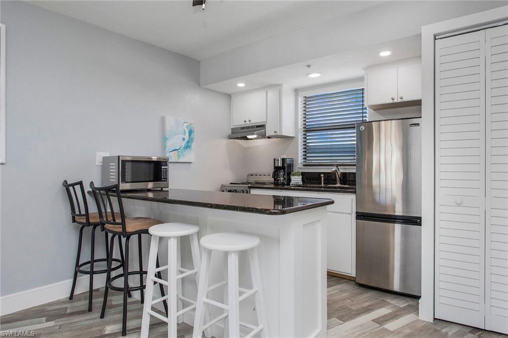 Motivated seller! Ready for a sunny coastal retreat to enjoy boating, fishing and the best Marco Island has to offer? Look no further. This charming, turnkey top-floor condominium at Angler's Cove in north Marco has it all. This one-bedroom, one-bath unit features new coastal wood plank LVM flooring throughout with no carpet, fresh paint, and a washer and dryer in unit. The kitchen has white cabinets, granite countertops and stainless-steel appliances. The water heater is 2018, the air conditioner is 2019. The screened living room has a serene view of Factory Bay and the north pool. Anglers Cove, adjacent to Rose Marina has direct gulf access and boat slips available for lease. The fishing pier, fish cleaning station and kayak storage will also appeal to water sports enthusiasts. But that's not all, there are resort-style amenities, two expansive pools with spas, two tennis courts, pickleball, shuffleboard and the beloved waterfront Dolphin Tiki restaurant and bar on-site. In addition, weekly rentals are welcome. This rare seven-day minimum rental policy provides excellent income potential for savvy investors. Angler's Cove's low condominium fees include all utilities such as electric, cable, internet, trash removal and water. This vibrant waterfront community is well-maintained, social and includes such conveniences as bike storage, a car wash station, a community room and more. Angler's Cove is moments from pristine beaches and in short distance of Marco Town Center which includes an array of shopping, dining and entertainment options.