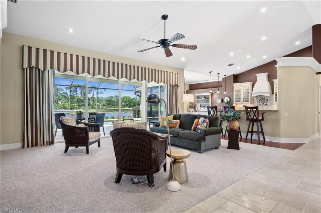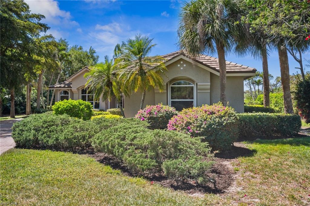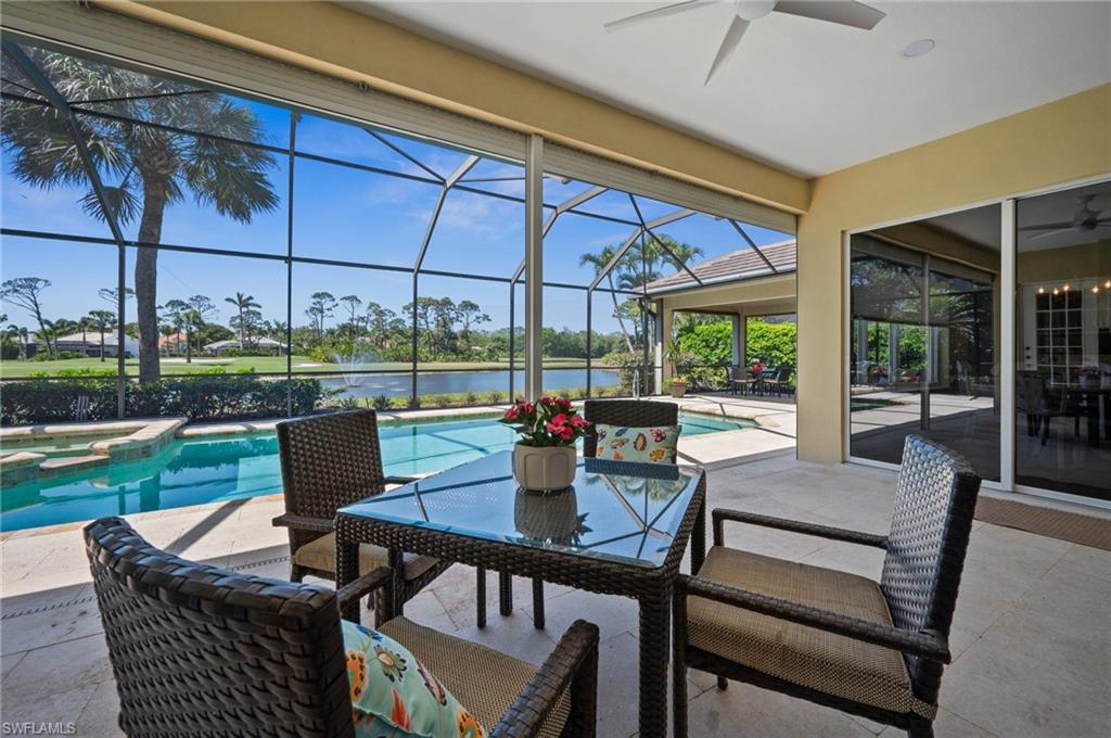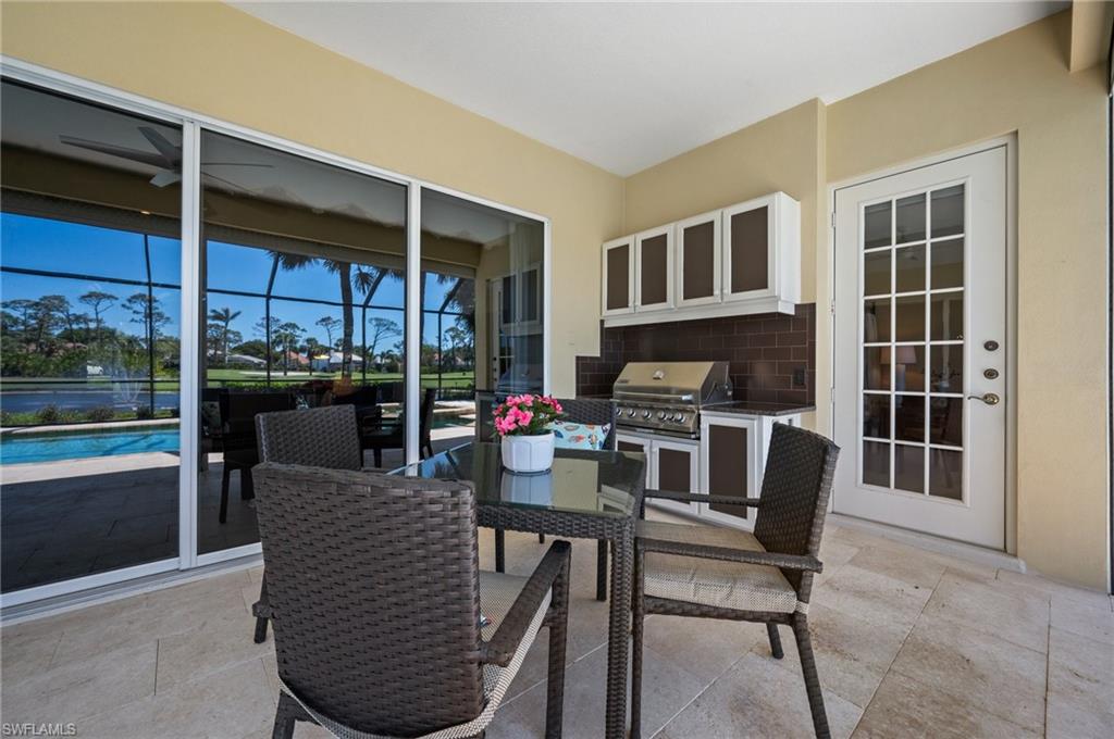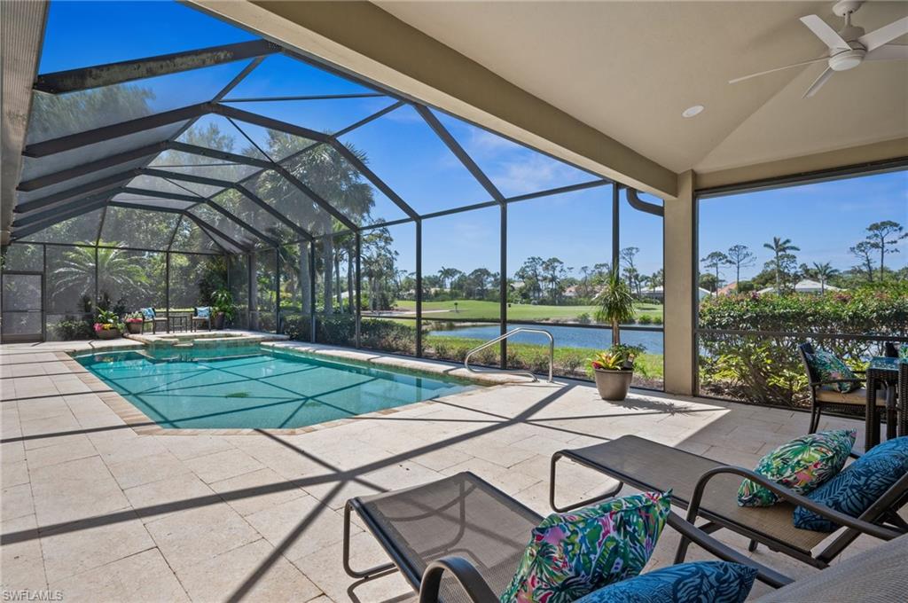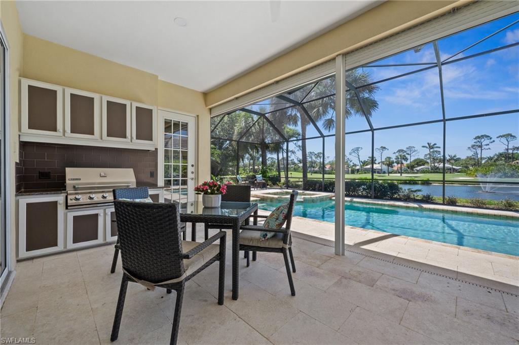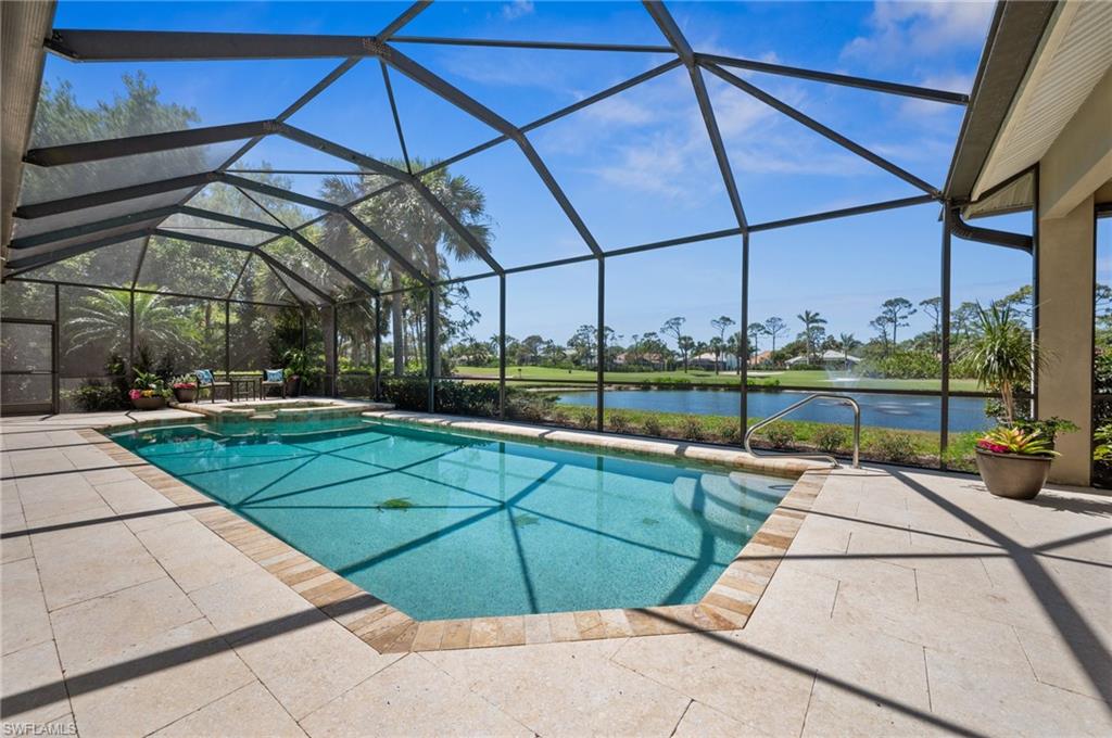 Virtual Tour Available | Welcome to 25090 Ridge Oak Drive, a custom-built Arthur Rutenberg masterpiece with unique poolside pavilion and designer finishes, featuring mesmerizing lake and golf views from oversize waterfront lot, located in The Ridge, one of Pelican Landing’s most intimate and esteemed estate home neighborhoods. Beyond decorative pavered circular drive and three-car garage, elegant glass-paneled front doors part to reveal a refreshingly open great room floor plan with cathedral ceilings and a wall of glass, through which one is immediately struck by the view: panoramic lake and golf views, with central decorative fountain and magnificent Florida wildlife. Distant golfers on Hurricane #2 provide a steady stream of entertainment, just far enough away so as not to sacrifice privacy. The lanai is especially noteworthy for its multiple seating areas including a covered lakefront pavilion, sheltered dining and outdoor kitchen, and extra-large pool deck with private pool and spa with Western sunset exposure—an entertainer’s dream. Luxurious shellstone paving tiles cover the entire outdoor living area, and pool is surfaced with desirable and upgraded Pebbletech finish. Inside, the floor plan revolves around a central great room open to lanai, kitchen, dining, and den/potential fourth bedroom. It features three generously sized suites with a split bedroom layout for additional privacy. Chef’s kitchen showcases all updated cabinetry throughout including decorative glass-faced uppers, dramatic butcher’s block central island, custom hood and tile work, 1 ½ wall oven, electric cooktop, and modern fridge with knock-on transparent door. Interior flooring is a combination of travertine, engineered hardwood, and plush carpeting. All three bathrooms have been tastefully updated. This move-in-ready home is currently being offered mostly furnished with only limited exclusions. ROOF (2017), HVAC (2020). Pelican Landing residents enjoy world-class amenities, including a 34-acre private island beach club, gulf access sailing, kayaking, and boat ramp, 12 Har-Tru tennis courts, pickleball, bocce, and a trainer-attended fitness center. Convenient location provides for a short ride to the South gate, community center, grocery store, pharmacy, and numerous casual and fine dining options without even venturing on to any major roads. Additionally, optional memberships are available at The Nest Golf Club, featuring 36 holes of championship golf and a newly renovated clubhouse. Waitlists due to high demand at The Nest may apply. This picturesque waterfront setting needs to be experienced in person to fully appreciate just how special it truly is. Schedule your private showing today.