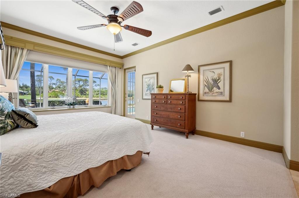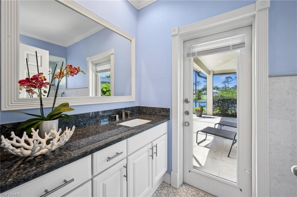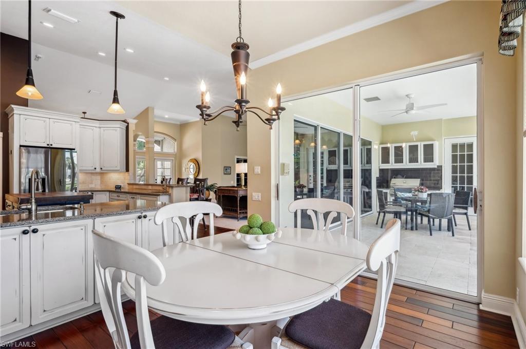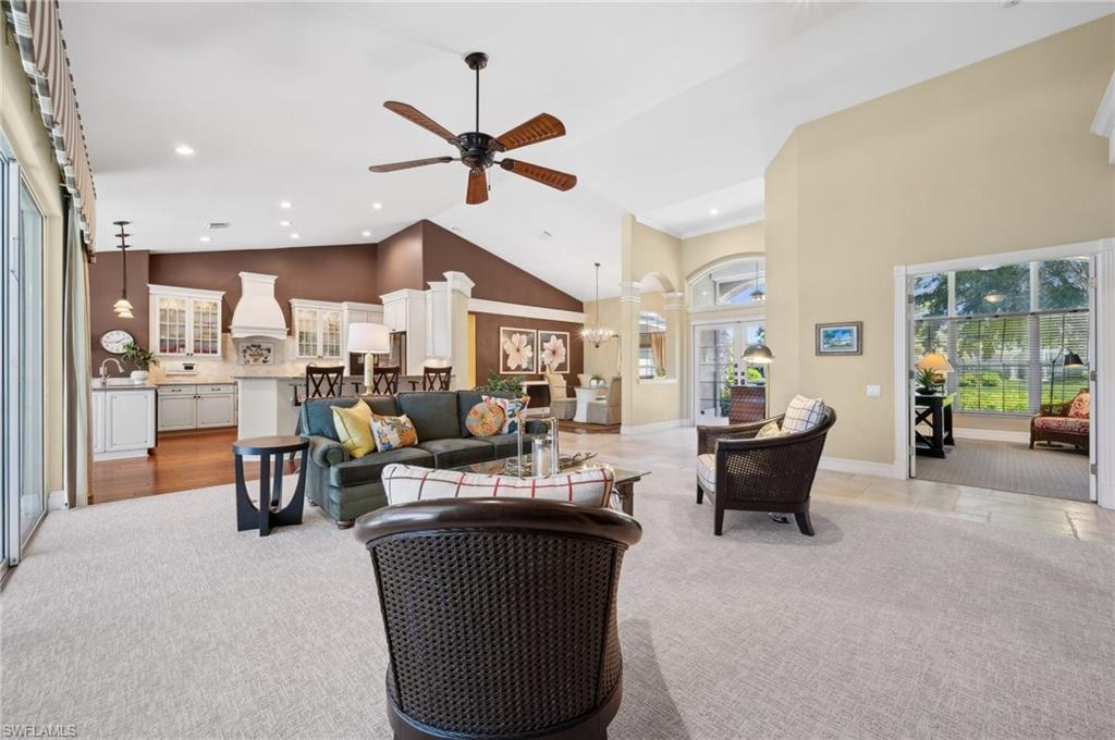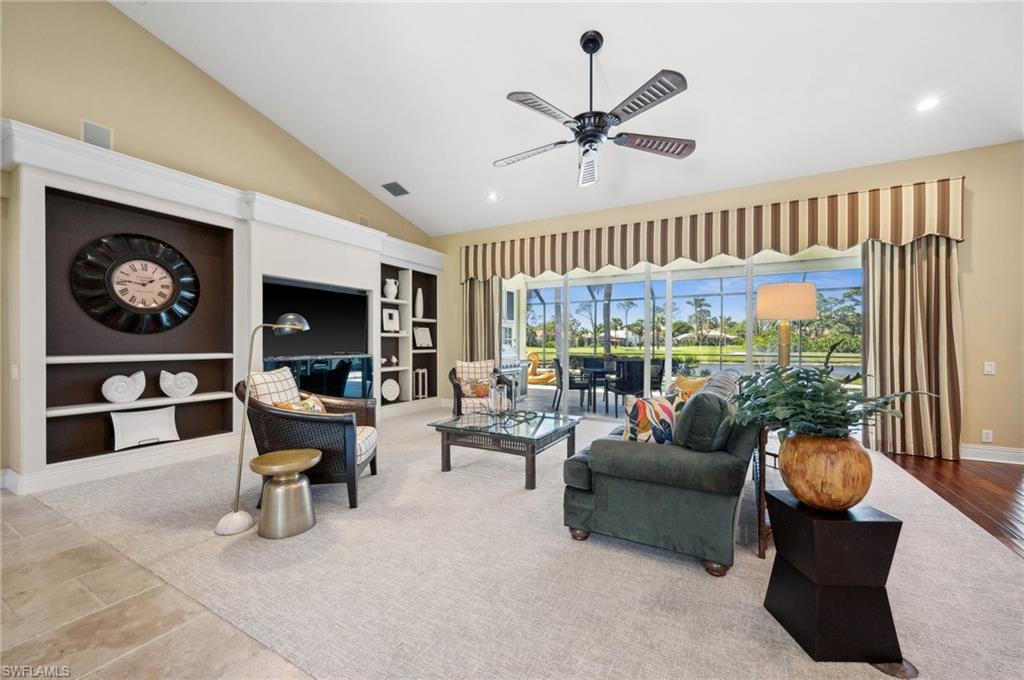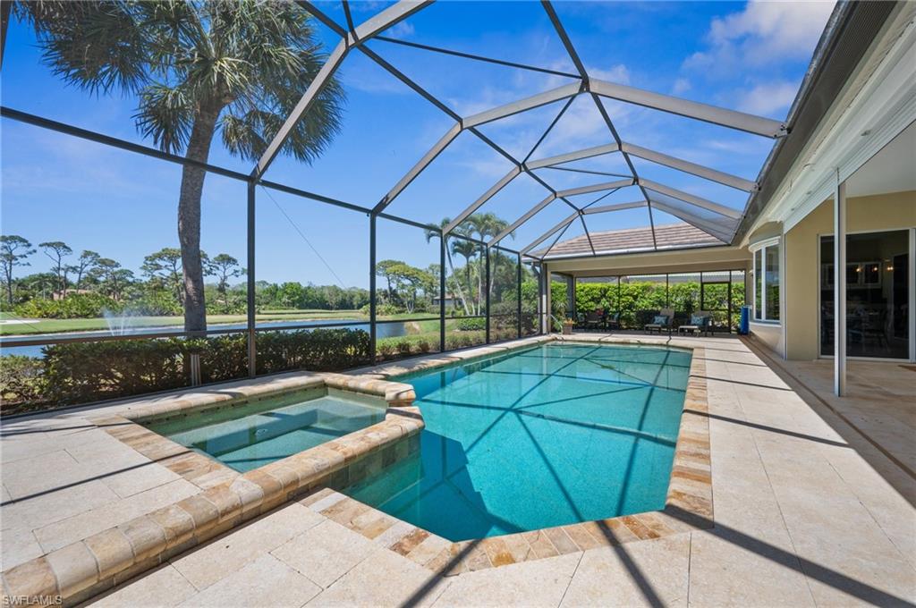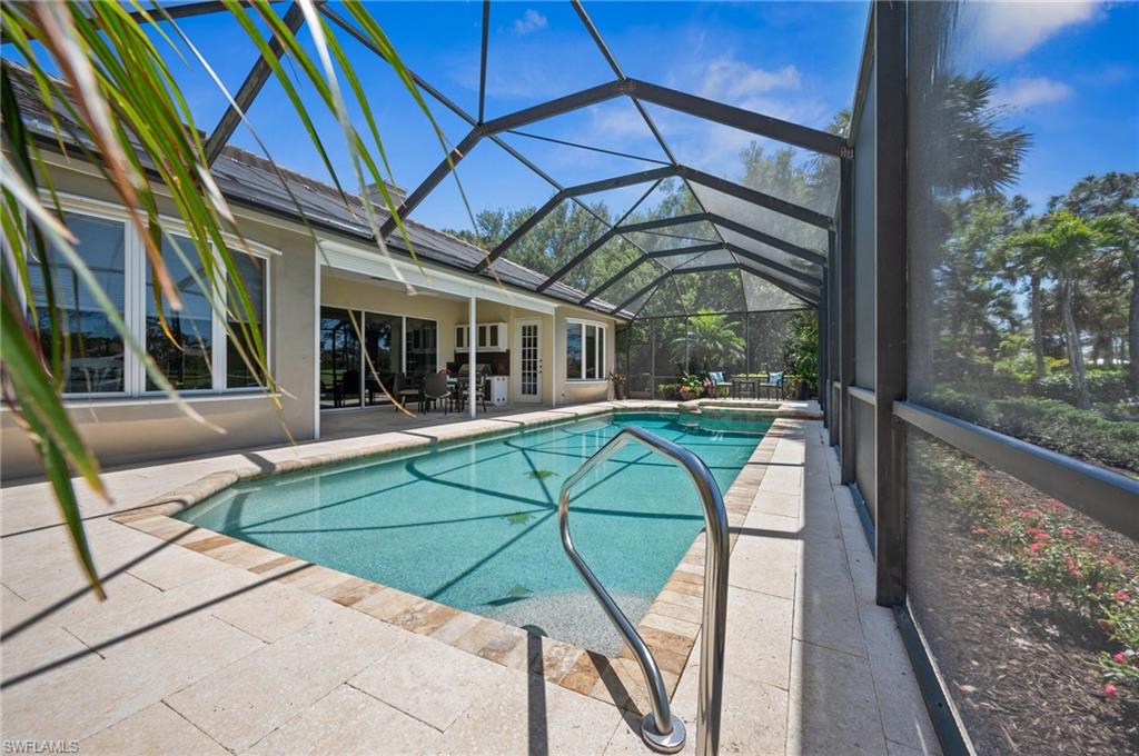 Virtual Tour Available | Welcome to 25090 Ridge Oak Drive, a custom-built Arthur Rutenberg masterpiece with unique poolside pavilion and designer finishes, featuring mesmerizing lake and golf views from oversize waterfront lot, located in The Ridge, one of Pelican Landing’s most intimate and esteemed estate home neighborhoods. Beyond decorative pavered circular drive and three-car garage, elegant glass-paneled front doors part to reveal a refreshingly open great room floor plan with cathedral ceilings and a wall of glass, through which one is immediately struck by the view: panoramic lake and golf views, with central decorative fountain and magnificent Florida wildlife. Distant golfers on Hurricane #2 provide a steady stream of entertainment, just far enough away so as not to sacrifice privacy. The lanai is especially noteworthy for its multiple seating areas including a covered lakefront pavilion, sheltered dining and outdoor kitchen, and extra-large pool deck with private pool and spa with Western sunset exposure—an entertainer’s dream. Luxurious shellstone paving tiles cover the entire outdoor living area, and pool is surfaced with desirable and upgraded Pebbletech finish. Inside, the floor plan revolves around a central great room open to lanai, kitchen, dining, and den/potential fourth bedroom. It features three generously sized suites with a split bedroom layout for additional privacy. Chef’s kitchen showcases all updated cabinetry throughout including decorative glass-faced uppers, dramatic butcher’s block central island, custom hood and tile work, 1 ½ wall oven, electric cooktop, and modern fridge with knock-on transparent door. Interior flooring is a combination of travertine, engineered hardwood, and plush carpeting. All three bathrooms have been tastefully updated. This move-in-ready home is currently being offered mostly furnished with only limited exclusions. ROOF (2017), HVAC (2020). Pelican Landing residents enjoy world-class amenities, including a 34-acre private island beach club, gulf access sailing, kayaking, and boat ramp, 12 Har-Tru tennis courts, pickleball, bocce, and a trainer-attended fitness center. Convenient location provides for a short ride to the South gate, community center, grocery store, pharmacy, and numerous casual and fine dining options without even venturing on to any major roads. Additionally, optional memberships are available at The Nest Golf Club, featuring 36 holes of championship golf and a newly renovated clubhouse. Waitlists due to high demand at The Nest may apply. This picturesque waterfront setting needs to be experienced in person to fully appreciate just how special it truly is. Schedule your private showing today.