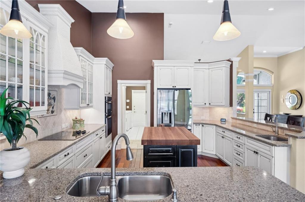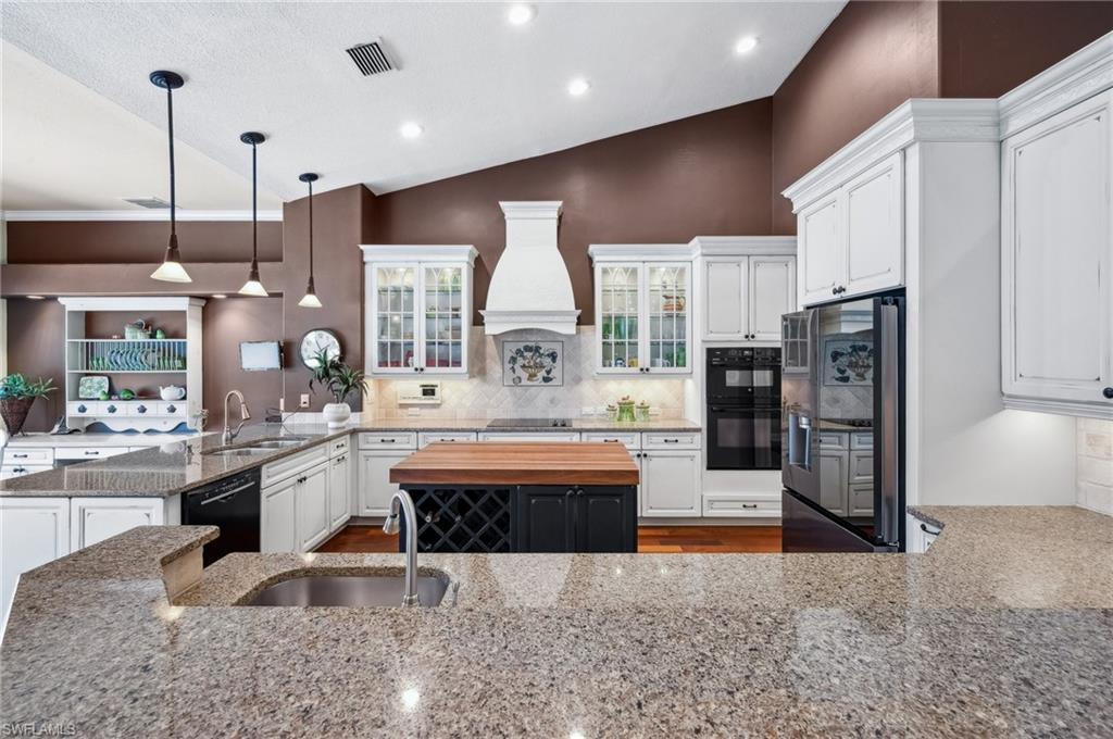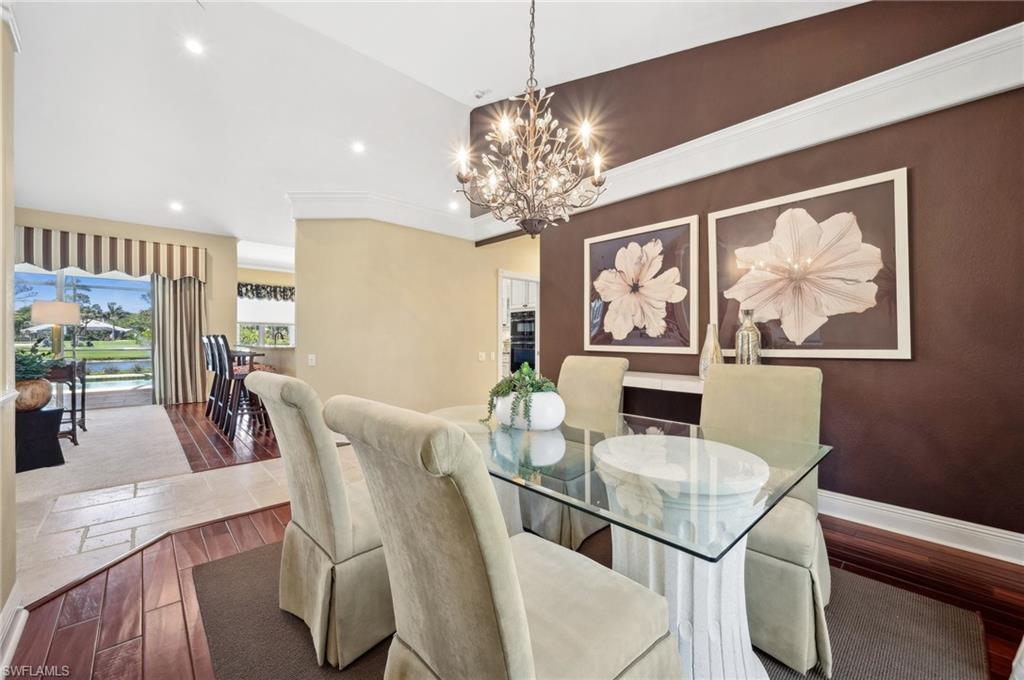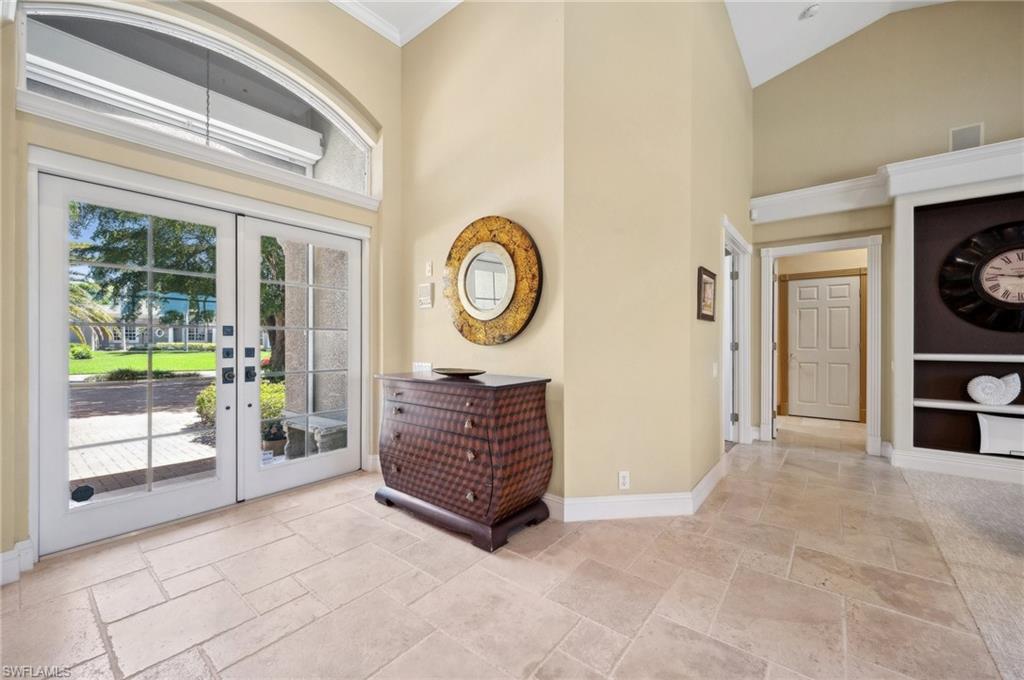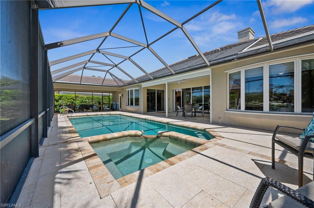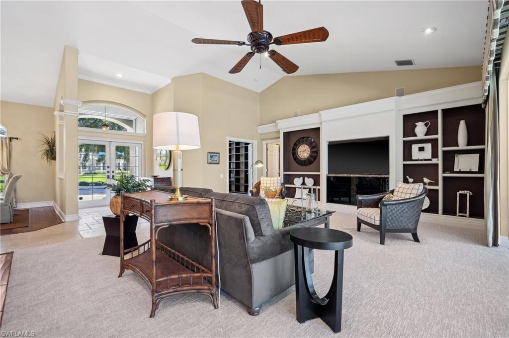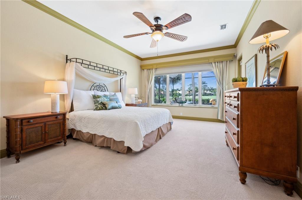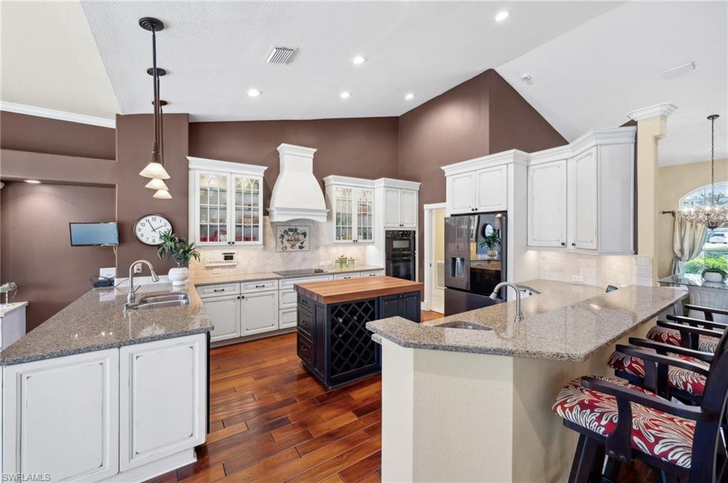 Virtual Tour Available | Welcome to 25090 Ridge Oak Drive, a custom-built Arthur Rutenberg masterpiece with unique poolside pavilion and designer finishes, featuring mesmerizing lake and golf views from oversize waterfront lot, located in The Ridge, one of Pelican Landing’s most intimate and esteemed estate home neighborhoods. Beyond decorative pavered circular drive and three-car garage, elegant glass-paneled front doors part to reveal a refreshingly open great room floor plan with cathedral ceilings and a wall of glass, through which one is immediately struck by the view: panoramic lake and golf views, with central decorative fountain and magnificent Florida wildlife. Distant golfers on Hurricane #2 provide a steady stream of entertainment, just far enough away so as not to sacrifice privacy. The lanai is especially noteworthy for its multiple seating areas including a covered lakefront pavilion, sheltered dining and outdoor kitchen, and extra-large pool deck with private pool and spa with Western sunset exposure—an entertainer’s dream. Luxurious shellstone paving tiles cover the entire outdoor living area, and pool is surfaced with desirable and upgraded Pebbletech finish. Inside, the floor plan revolves around a central great room open to lanai, kitchen, dining, and den/potential fourth bedroom. It features three generously sized suites with a split bedroom layout for additional privacy. Chef’s kitchen showcases all updated cabinetry throughout including decorative glass-faced uppers, dramatic butcher’s block central island, custom hood and tile work, 1 ½ wall oven, electric cooktop, and modern fridge with knock-on transparent door. Interior flooring is a combination of travertine, engineered hardwood, and plush carpeting. All three bathrooms have been tastefully updated. This move-in-ready home is currently being offered mostly furnished with only limited exclusions. ROOF (2017), HVAC (2020). Pelican Landing residents enjoy world-class amenities, including a 34-acre private island beach club, gulf access sailing, kayaking, and boat ramp, 12 Har-Tru tennis courts, pickleball, bocce, and a trainer-attended fitness center. Convenient location provides for a short ride to the South gate, community center, grocery store, pharmacy, and numerous casual and fine dining options without even venturing on to any major roads. Additionally, optional memberships are available at The Nest Golf Club, featuring 36 holes of championship golf and a newly renovated clubhouse. Waitlists due to high demand at The Nest may apply. This picturesque waterfront setting needs to be experienced in person to fully appreciate just how special it truly is. Schedule your private showing today.