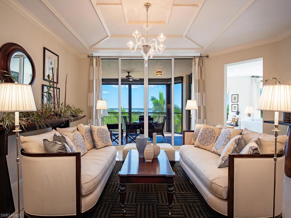 Discover elevated coastal living in this fully furnished 3-bedroom plus den, 3.5-bath residence in La Scala, one of Southwest Florida’s most prestigious high-rise towers. Located on the third floor with a private elevator lobby, this former model home offers over 3,500 square feet of air-conditioned space, blending timeless luxury with thoughtful design. The open-concept layout seamlessly connects the living, dining, and kitchen areas, surrounded by floor-to-ceiling glass that floods the interior with natural light and showcases stunning views of Estero Bay and beyond. Elegant white stone flooring, accented with dark wood in select areas, extends through the main living spaces and primary suite. The kitchen is outfitted with Siematic cabinetry, granite countertops, and stainless appliances—perfect for both daily living and entertaining. Each of the three en-suite bedrooms offers comfort and privacy, while the den provides flexible space for a home office or media room. Multiple lanais, both screened and open, invite quiet mornings and sunset evenings outdoors. High ceilings (9 feet 8 inches) and generous storage throughout add to the home's livability, and two assigned parking spaces and secure private storage is included in the under-building garage. La Scala offers world-class amenities including a grand formal lobby with twin marble staircases, 24-hour staffed front desk, resort-style pool and spa, fitness center, private theater, guest suites, and social rooms. Recent renovations include a new roof, updated stucco, fresh light exterior paint, fully refreshed garage and mechanicals, and all-new landscaping. As part of The Colony at Pelican Landing, residents also enjoy access to The Bay Club with two levels of waterfront dining, a private beach park accessible by boat shuttle, tennis, pickleball, a kayak park, optional Golf membership and a children’s playground