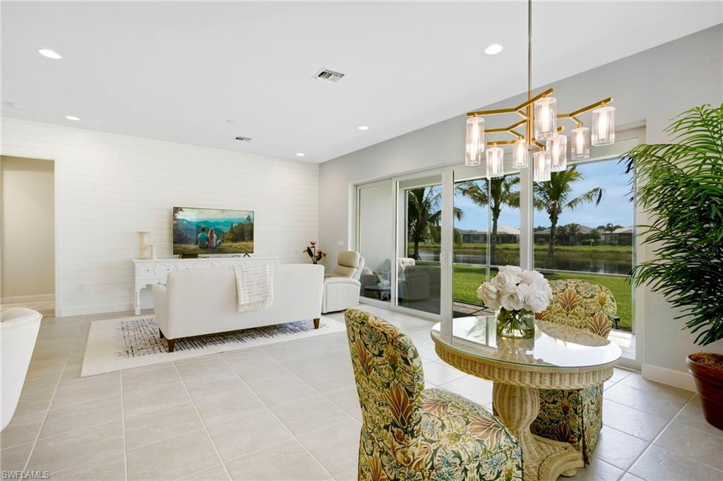 This stunning Pelican model home offers an unparalleled blend of luxury and comfort in the highly sought-after Valencia Trails, Naples’ premier 55+ community. From the moment you step inside, the soaring 14-foot ceilings and custom shiplap detailing create an immediate sense of sophistication. The open-concept design seamlessly connects the kitchen and living areas, making it ideal for both everyday living and elegant entertaining. The chef’s kitchen is a true showpiece, featuring quartz countertops, a gorgeous marble backsplash, a natural gas stove, premium stainless steel appliances, and an upgraded pantry with pullout trash bins. Level 3 wood cabinetry with soft-close functionality and elegant molding adds a touch of refinement, while ample recessed lighting enhances the space. The living area is further elevated by a striking shiplap accent wall, providing warmth and charm. Step outside to your private screened lanai and take in the breathtaking lake views that set this home apart. Whether you’re enjoying a quiet morning coffee or hosting guests for an evening gathering, this tranquil retreat offers a seamless blend of indoor-outdoor living. With ample yard space to accommodate a custom pool, which is pre-plumb for and a lanai pre-plumbed for an outdoor kitchen, this home is designed for relaxation and entertaining at its finest. The combination of tile flooring throughout and cozy carpeting in the bedrooms ensures both style and comfort. Beyond your doorstep, Valencia Trails offers world-class amenities designed to enhance an active and social lifestyle. The impressive 43,000-square-foot clubhouse features a full-service restaurant and bar, a state-of-the-art fitness center, a full-service salon and spa, and multiple recreational spaces, including card rooms, an art studio, and a learning kitchen. For those who love outdoor activities, the community boasts a resort-style pool, a lap pool, a resistance pool, six tennis courts, eight pickleball courts, and scenic walking and biking trails. Even your four-legged companions will feel at home with two dedicated dog parks. This is more than just a home—it’s an opportunity to embrace a luxurious, resort-style lifestyle in one of Naples’ most exclusive communities. Homes like this are rare, and demand for Valencia Trails continues to grow. Don’t miss your chance to own a piece of paradise. Call today to schedule your private tour and experience the elegance, comfort, and breathtaking lake views for yourself."