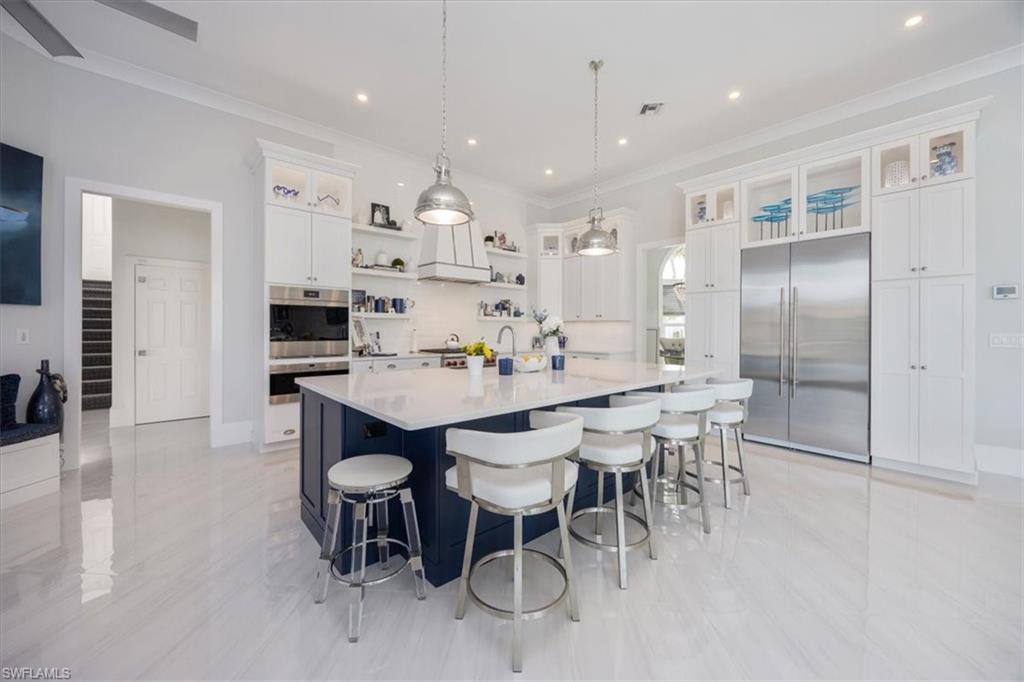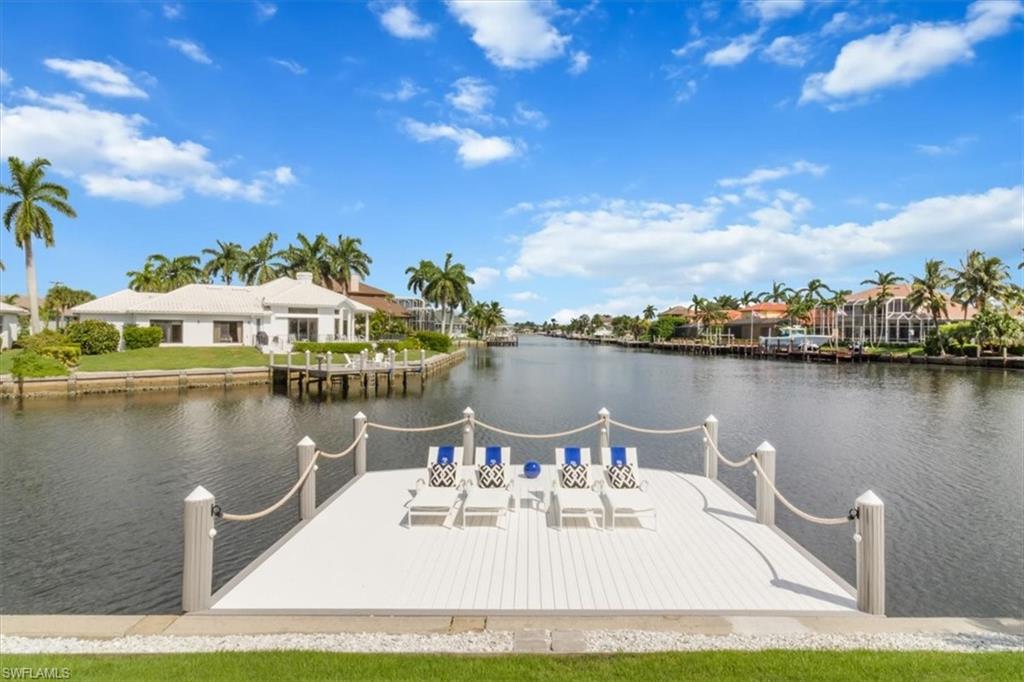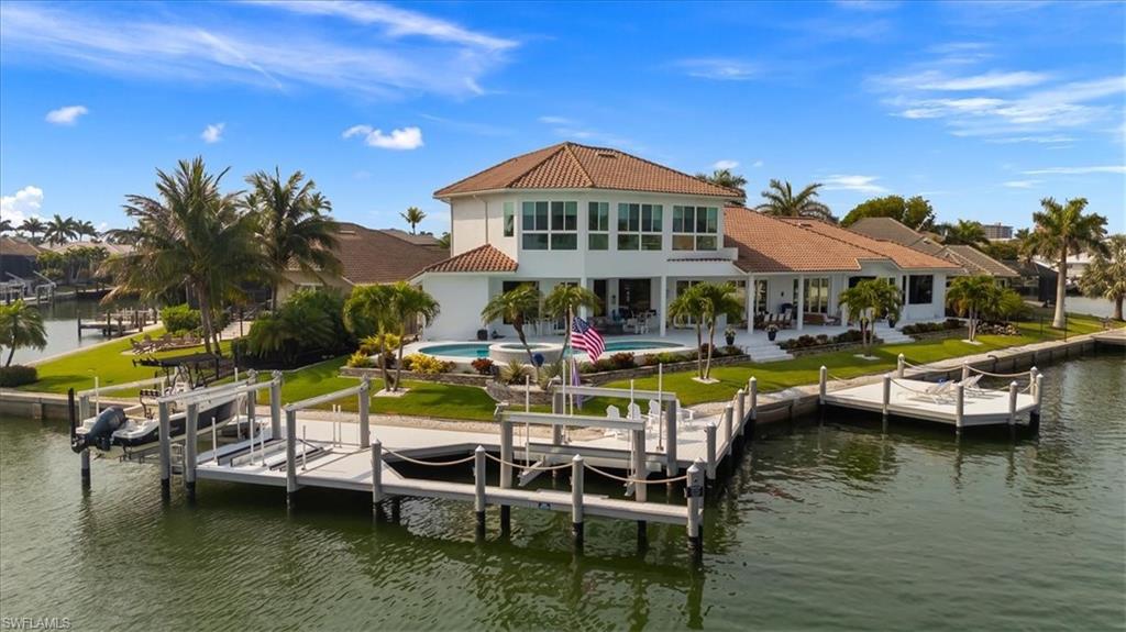 Experience waterfront luxury at its pinnacle! Twin Palms is a spectacular estate, set on a prized tip lot with 217 ft of water frontage. This breathtaking designer home was renovated and redesigned in 2022. You’ll entertain in style with an open-concept living space with soaring ceilings. Most rooms feature jaw-dropping views of the converging waterways. The gourmet kitchen features a center island, Wolf range and custom waterfront window seat. There is a linear fireplace and multiple sliders in the living room. The waterfront wet bar is a special place to celebrate life on Marco Island. The primary suite rivals a boutique hotel with beautiful views and custom walk-in closets. The bath is spa-like and boasts dual shower panels, a designer tub, and floating vanity. A spacious first floor guest suite overlooks the glistening pool and features a custom closet and new bath. The remaining bedrooms are king-sized with oversized closets. The expansive lanai situated so you’ll enjoy both sunrises and sunsets. The saltwater pool and spa are sun-drenched. Boating enthusiasts will love the new dock featuring two lifts plus a Jet Ski platform. The new 24x24 sun deck perfect for soaking up the endless Marco sunshine. The lush landscaping wraps around the property like a private resort. Luxurious dolomite floors, an ice maker, Navian hot water heater and whole-house generator are just some of the special features of this estate. Designer furnishings are available. Twin Palms is a very special luxury property.