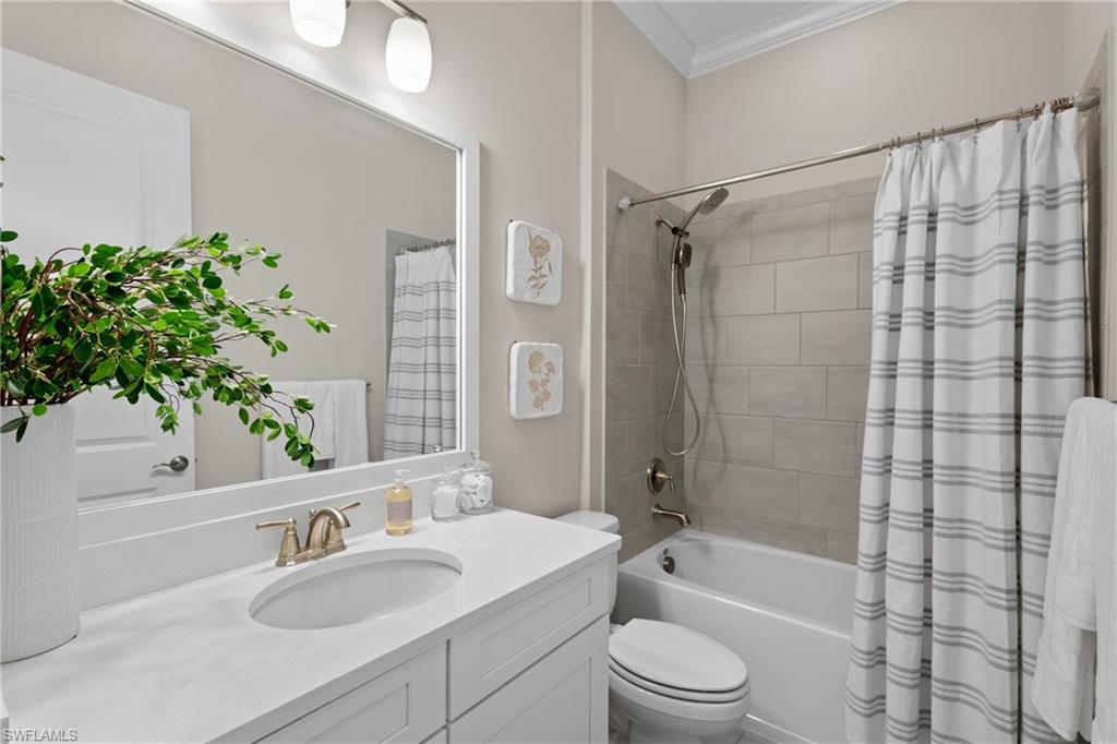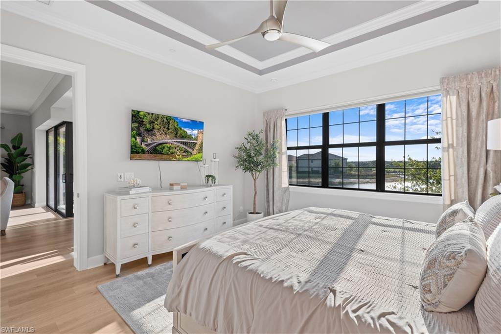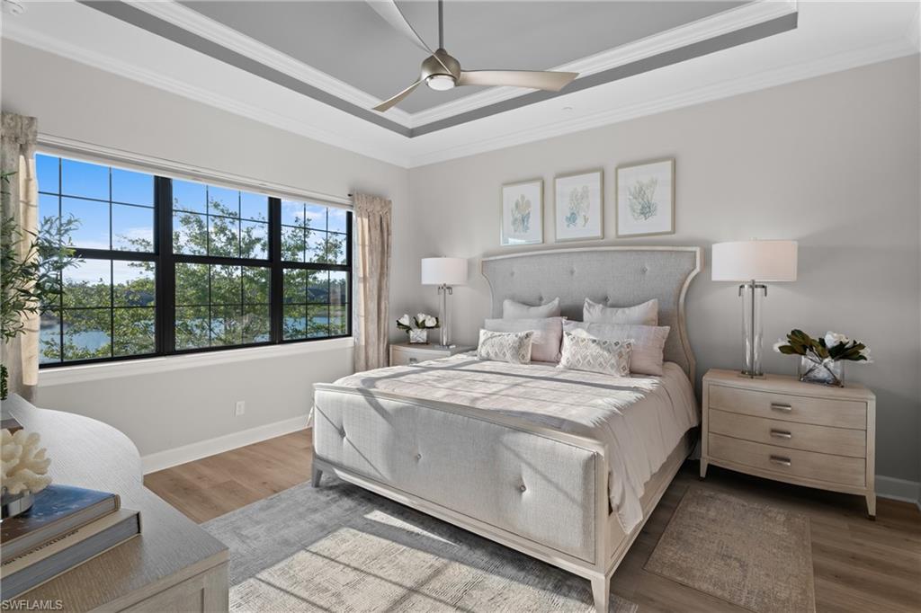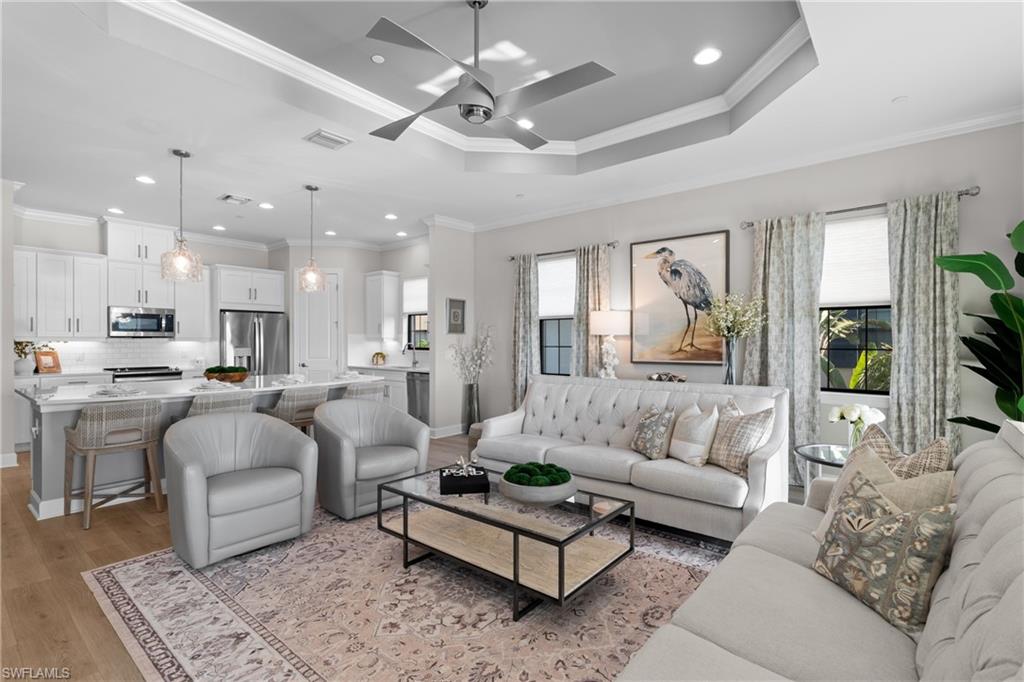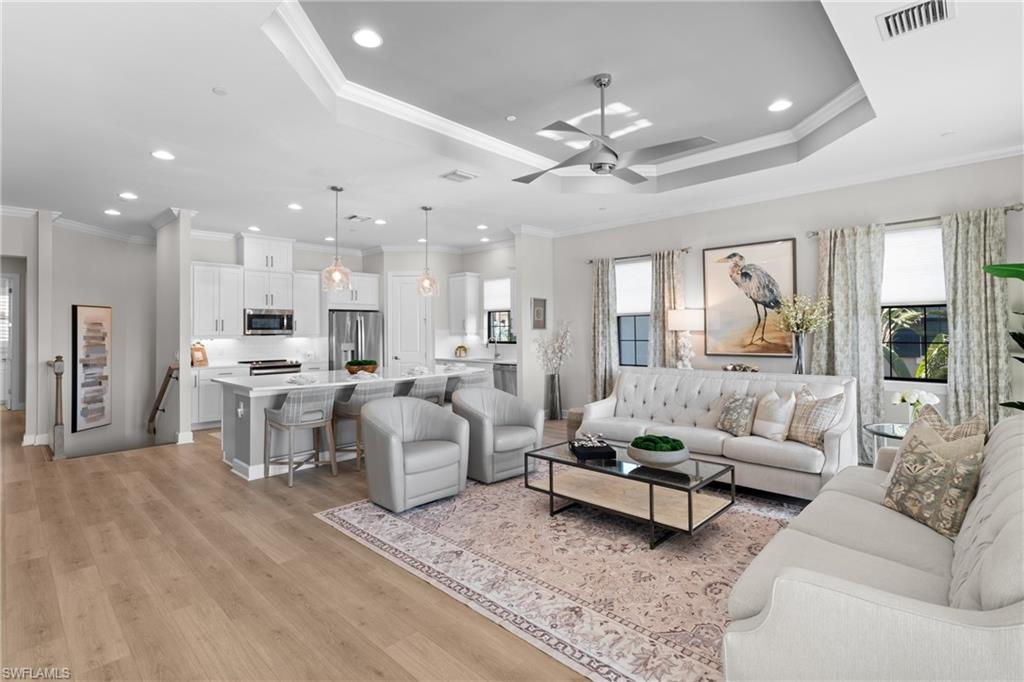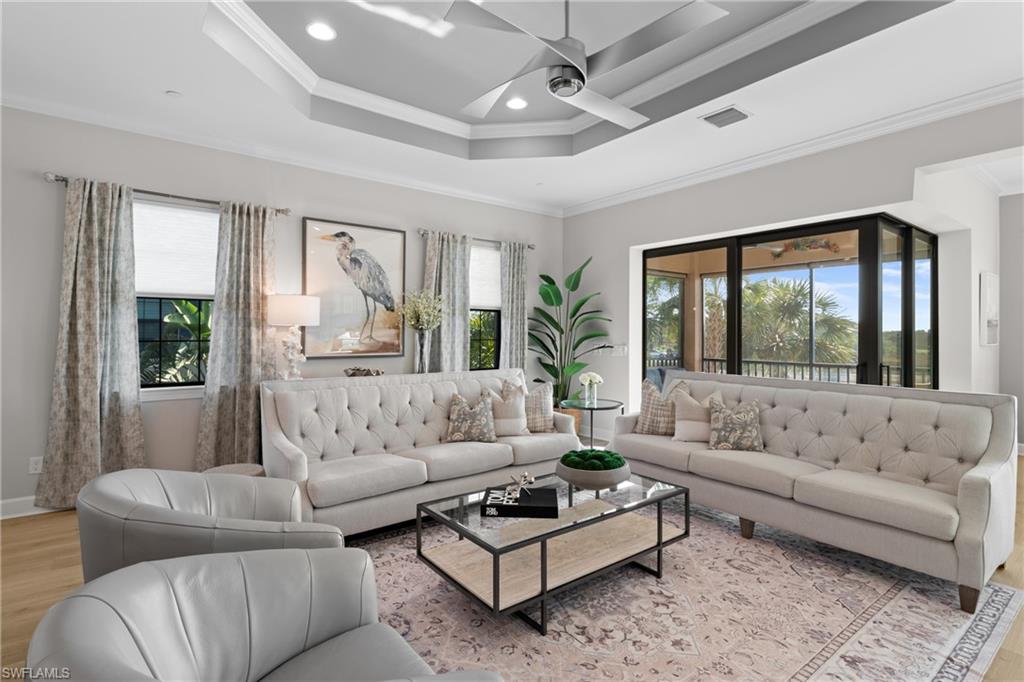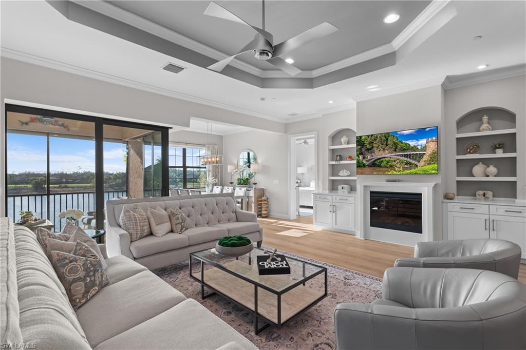 Live a Vacation Lifestyle in Esplanade – When Only the Best Will Do! Step into luxury with this highly upgraded “Romano” floorplan second-floor end unit coach home, located in the prestigious Esplanade Golf & Country Club. Offering 3 bedrooms plus an enclosed den and 3 full baths, this spacious condo spans 2,393 square feet under air and lives like a single-family home. The open-concept design features a generously sized great room with south and west-facing windows, flooding the space with natural light. The kitchen is a chef’s dream, showcasing quartz countertops, ample cabinetry, under-cabinet lighting, and stainless steel appliances. Enjoy stunning sunsets from the west-facing corner lanai, offering panoramic views of the lake, golf course, and a picturesque bridge. The master suite is a true retreat, with three windows overlooking the serene views, and a luxurious bath featuring dual sinks, a large walk-in shower with a frameless glass enclosure, and a custom-built shelving unit in the closet for maximum storage. The two guest suites are thoughtfully located at the front of the condo, each featuring custom closets with built-in shelving, and one of the bathrooms is an ensuite with a walk-in shower for added privacy. This home is packed with upgraded features, including hurricane impact windows and doors, zero-corner pocketing sliding glass doors leading to the lanai with non-skid tile flooring and roll-down sun shades, and luxury laminate flooring throughout. The stairwell has a brand-new carpet runner, and the great room is enhanced by a stunning feature wall with an LED fireplace, built-in cabinetry, and shelving. White shaker-style cabinetry and quartz countertops are found throughout, with plantation shutters and pull-down shades enhancing the windows. Other details include an enclosed den with pocket doors, upgraded lighting and fans, crown molding throughout (including bedrooms and baths), framed bath mirrors, built-in shelving and storage in the garage, new custom closets in all three bedrooms, and three tray ceilings adding a touch of elegance. Just two buildings away from the Montelanico pool, this condo offers a prime location within the community. Esplanade Golf & Country Club is the ultimate "Lifestyle Community," offering a wealth of amenities including a resort pool with cabanas and the popular Bahama Bar, tennis, pickleball, bocce, a Koquina Day Spa, fitness center, dog park, and 14 miles of scenic trails. Enjoy dining at the clubhouse, which features a restaurant, bar, wine tasting room, wine lockers, and a Starbucks-style café. The 18-hole private golf course offers limited golf opportunities (2-day advanced tee times throughout the year) with a Club/Sports Membership, which is included with this home. The total quarterly dues of just $3,158 includes water/sewer, building insurance, building maintenance, and access to all of the resort-style amenities of Esplanade G&CC.