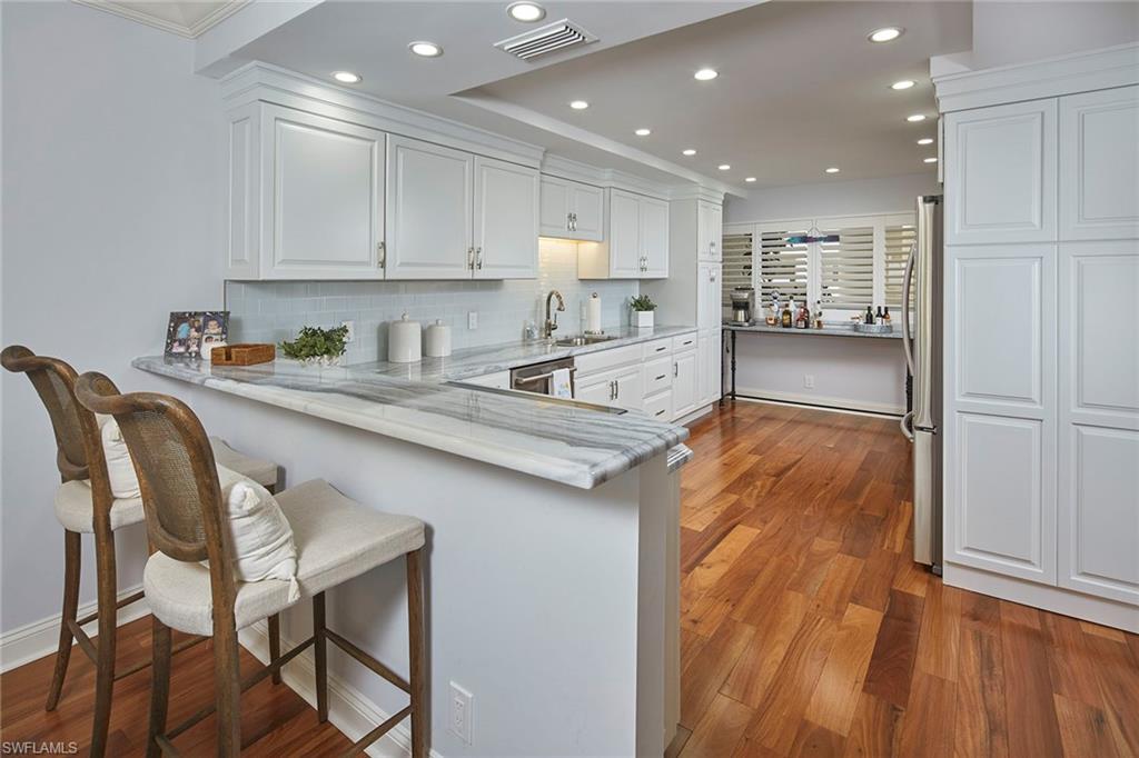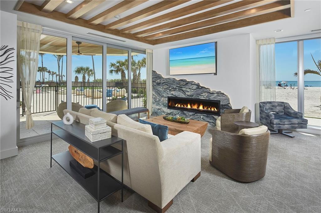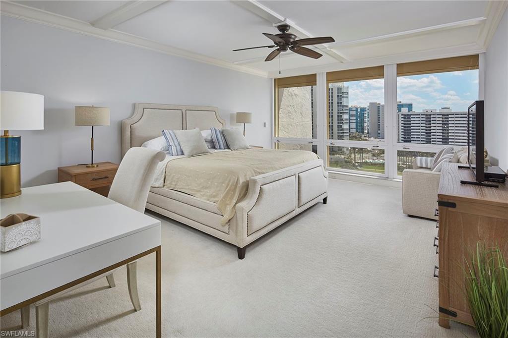 Stunning long range southerly Gulf and Park Shore beach views can be seen from nearly every room in this updated luxurious La Mer residence. The ideally located 12th-floor home was tastefully remodeled including wood flooring in the main living areas, a new kitchen with white cabinets and quartzite countertops along with stainless-steel appliances. The large great room has an adjacent dining area and two sets of sliding glass doors that open to a spacious screened-in lanai ideal for enjoying the Naples mild winters and picturesque beach views. The owner's suite has a spacious custom walk-in closet, a completely updated bath with dual sinks, quartzite countertops, large walk-in shower and endless beach and water views from the bedroom through three floor-to-ceiling windows. Additional features include electric storm shutters throughout, newer air-conditioning unit, an updated guest bath, in-residence laundry room and exterior storage closet. La Mer amenities include a modern coastal common area decor, 24-hour staffed front door, beachside resort pool and spa, direct beach access, newly remodeled fitness center, tennis and pickleball courts, gas grills, three guest suites and rooftop observation terrace. La Mer is in distance of upscale shopping and waterfront dining at Venetian Village. Also in proximity is the Venetian Bay Yacht Club which features boat docks for lease or purchase.