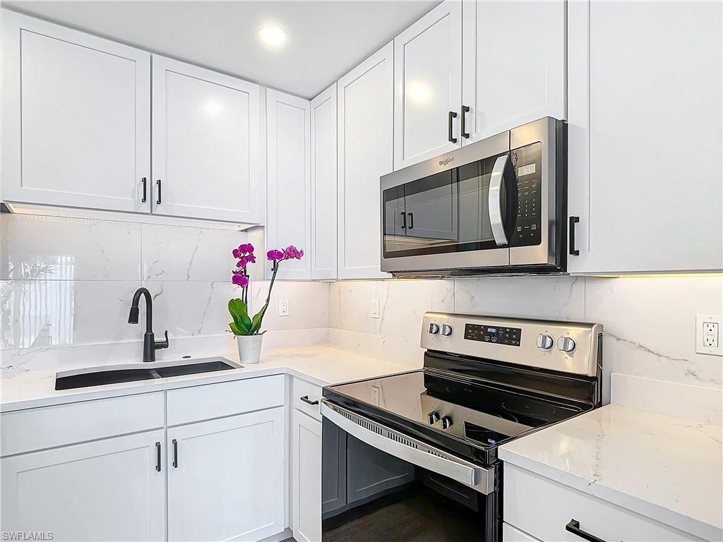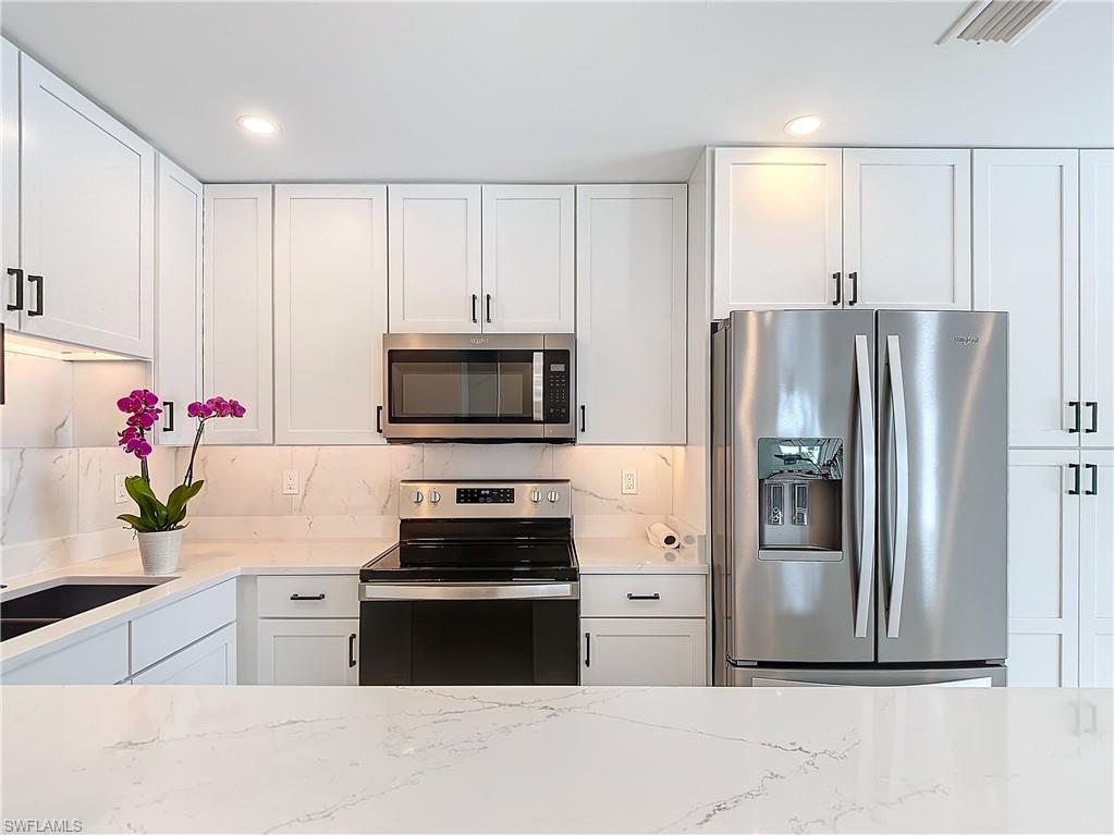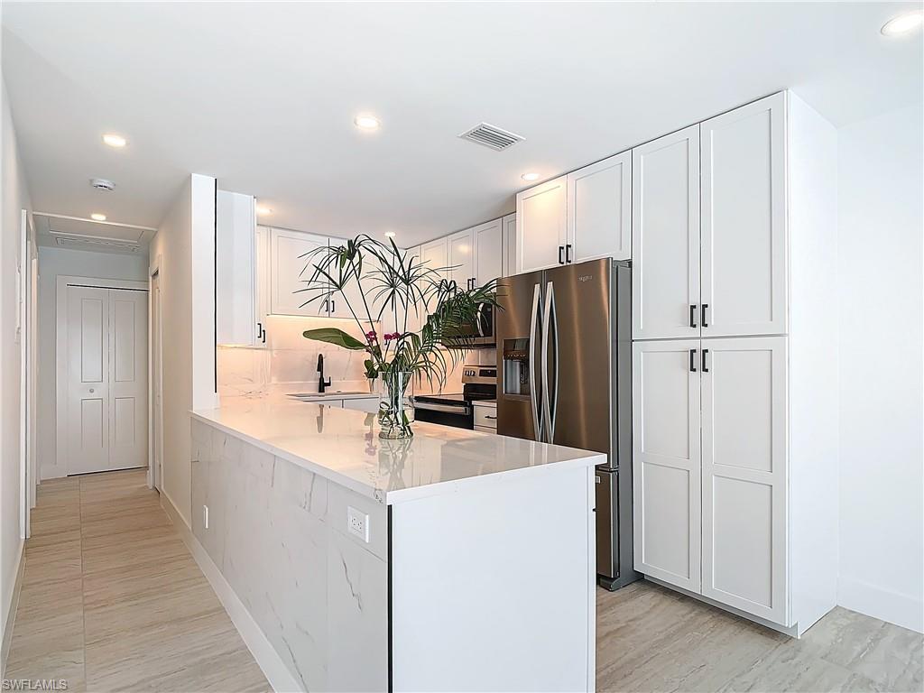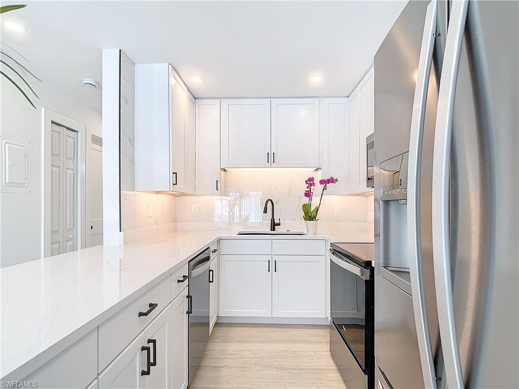 Calling all Boaters! This charming, Completely Renovated, first-floor, single-story 2-bedroom, 2-bath end-unit condo comes with a private boat dock for up to a 25” boat, perfect for those seeking a serene escape. The contemporary kitchen features new bright white cabinetry, sleek quartz countertops, modern cabinet pulls, custom lighting, and stainless steel appliances. Updates throughout include Impact Windows, tile flooring, new interior doors and trim and modern luxurious finishes in the updated baths. Enjoy endless aquatic adventures with direct access for boating and fishing enthusiasts, right at your doorstep, adding a new dimension to your Naples, FL lifestyle. Located close to pristine beaches, renowned downtown restaurants, and shopping, with boat rentals and adventures available at the nearby Naples Bay Resort and Marina
