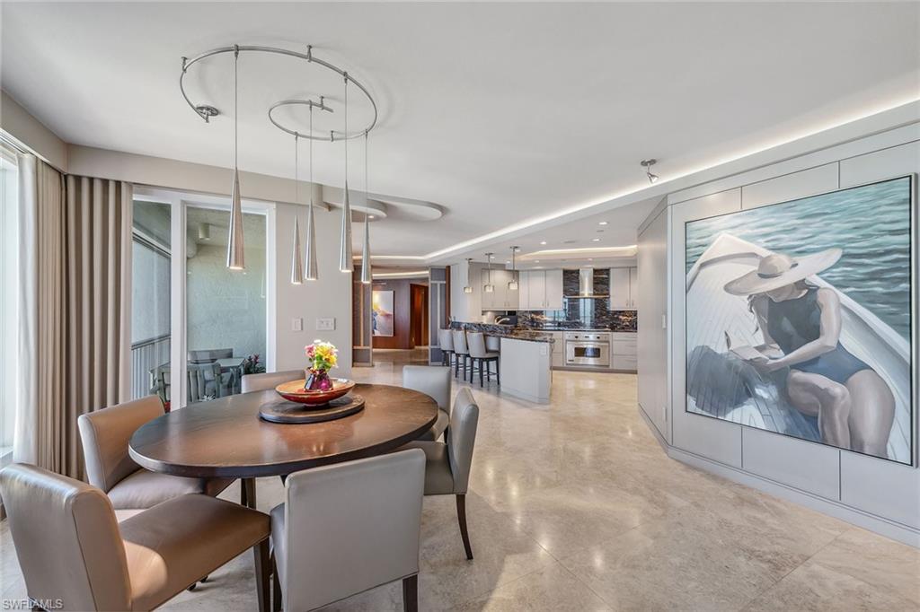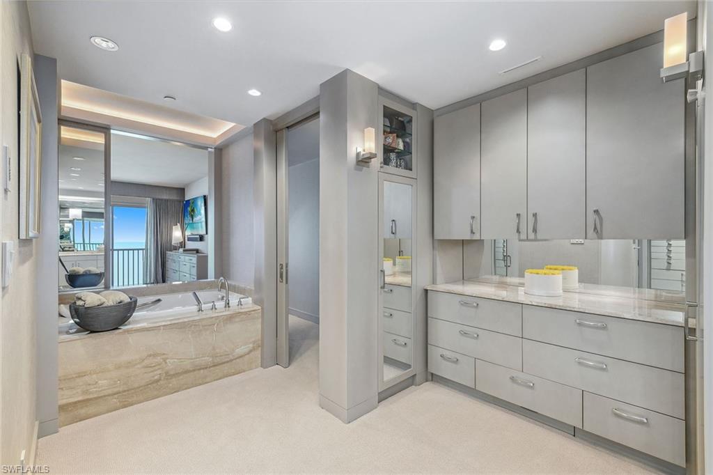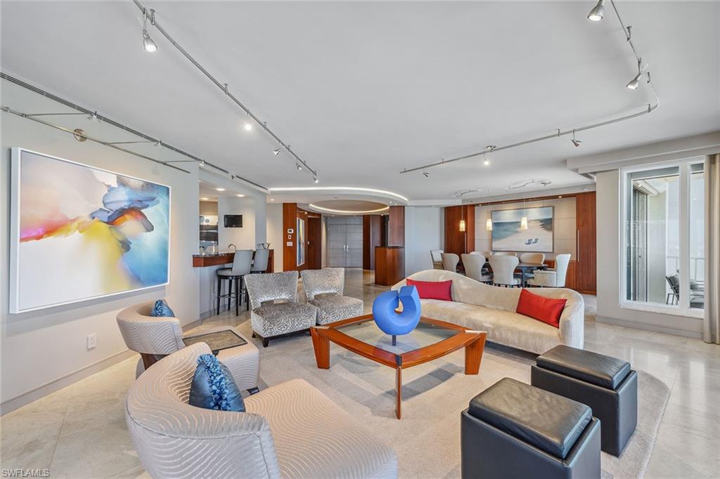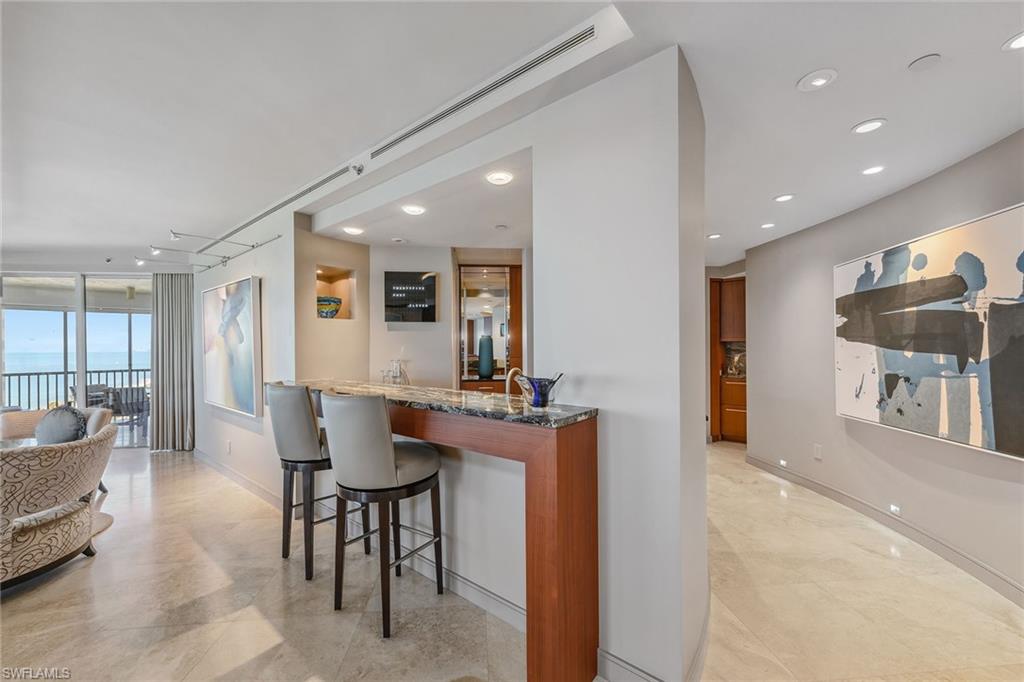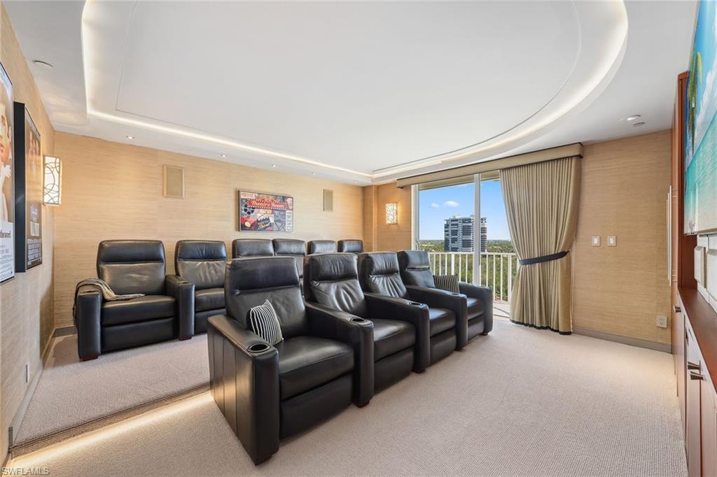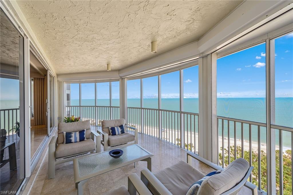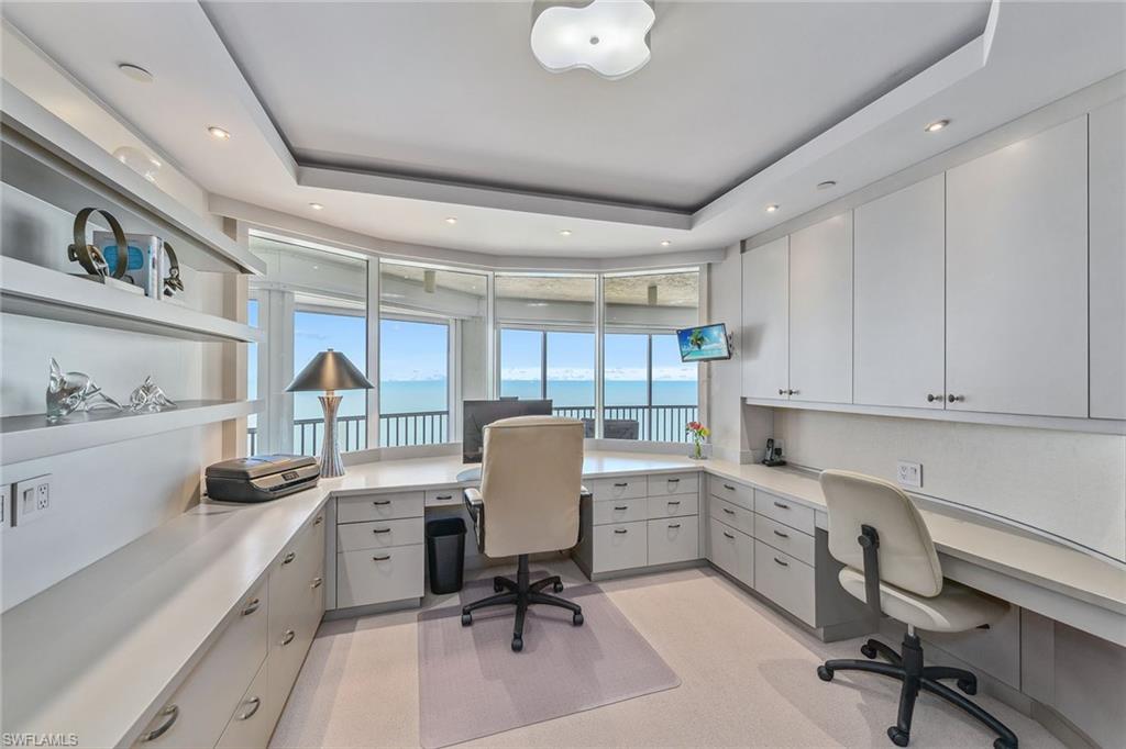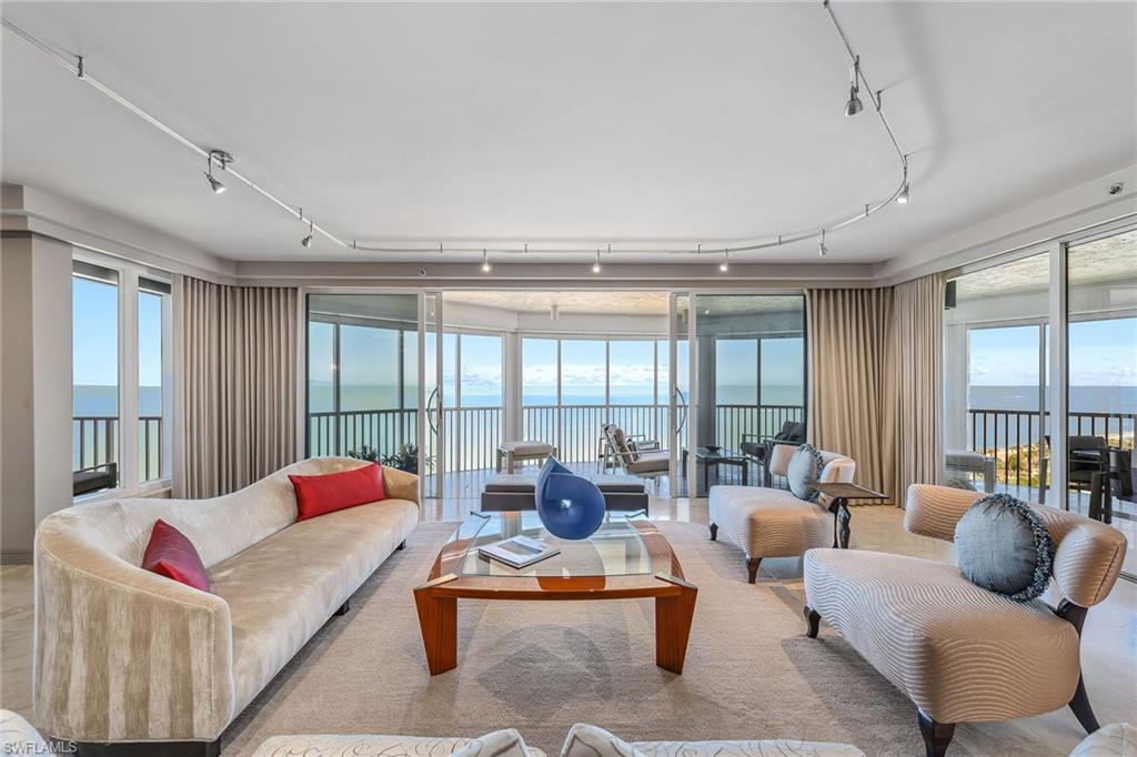 Discover a one-of-a-kind luxury residence with year-round sunsets and panoramic views stretching from Sanibel to Park Shore. Masterfully renovated by Kurtz Homes, this four-bedroom, 5.5-bathroom is a rare double unit in Bay Colony. A 10th floor, mid rise penthouse that blends elegance, functionality and awe-inspiring vistas. Exquisite craftsmanship includes custom millwork by Thomas Riley Artisans Guild throughout and in dual private offices/dens. Dramatic floor to ceiling glass doors lead to 5 expansive waterfront patios. The Gulf front owners suite offers dual baths with walk-in closets, a sliding mirrored wall pockets to extend the natural light and gulf views into the bath and dressing rooms. Stunning stone surfaces cover custom designed cabinets, showers, and jacuzzi bath. Entertain effortlessly in the open-concept chef's kitchen, showcasing striking granite countertops, custom cabinetry and high-end appliances, along with a secondary prep kitchen for seamless hosting. A 340-bottle wine room and private home theater with 10 leather recliners and a 75-inch TV complete the space. The largest available poolside cabana, newly renovated in 2024, is designer-furnished for ultimate relaxation. With four parking spaces, two storage units, and access to beachside pool/spa, fitness center, exclusive tennis courts, guest suites and 24-hour security, this Bay Colony retreat is simply unmatched.