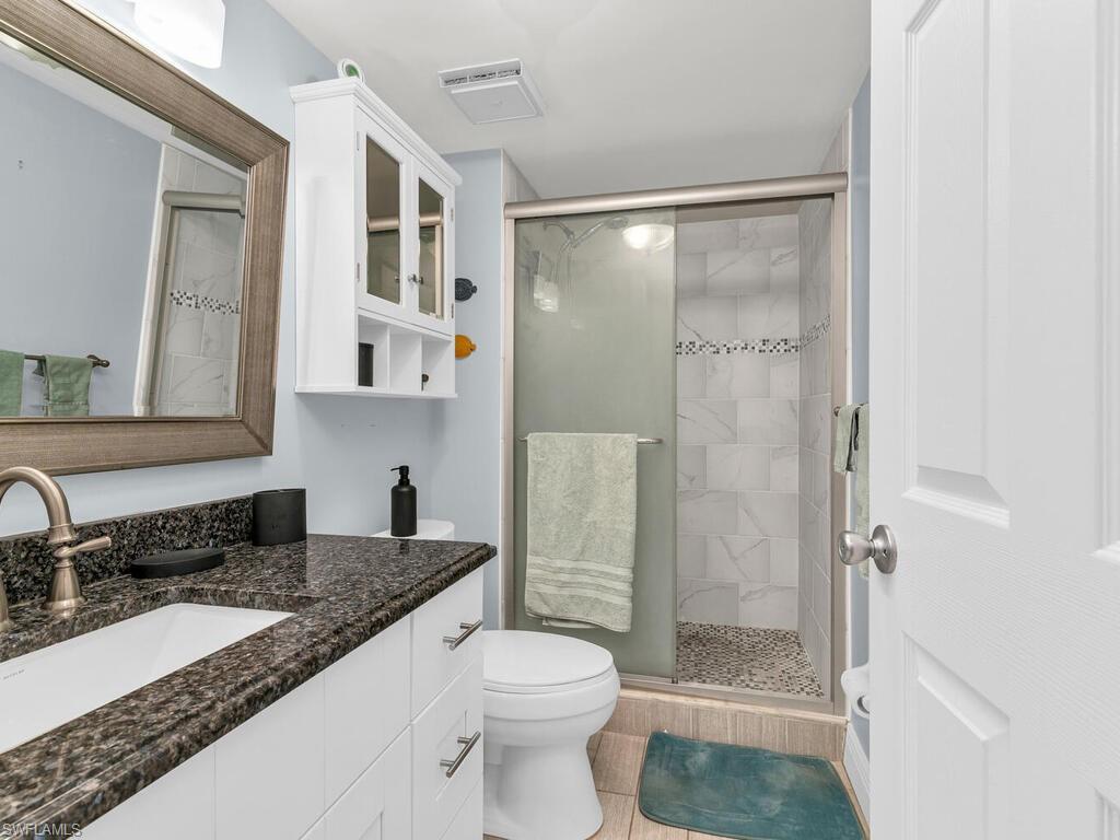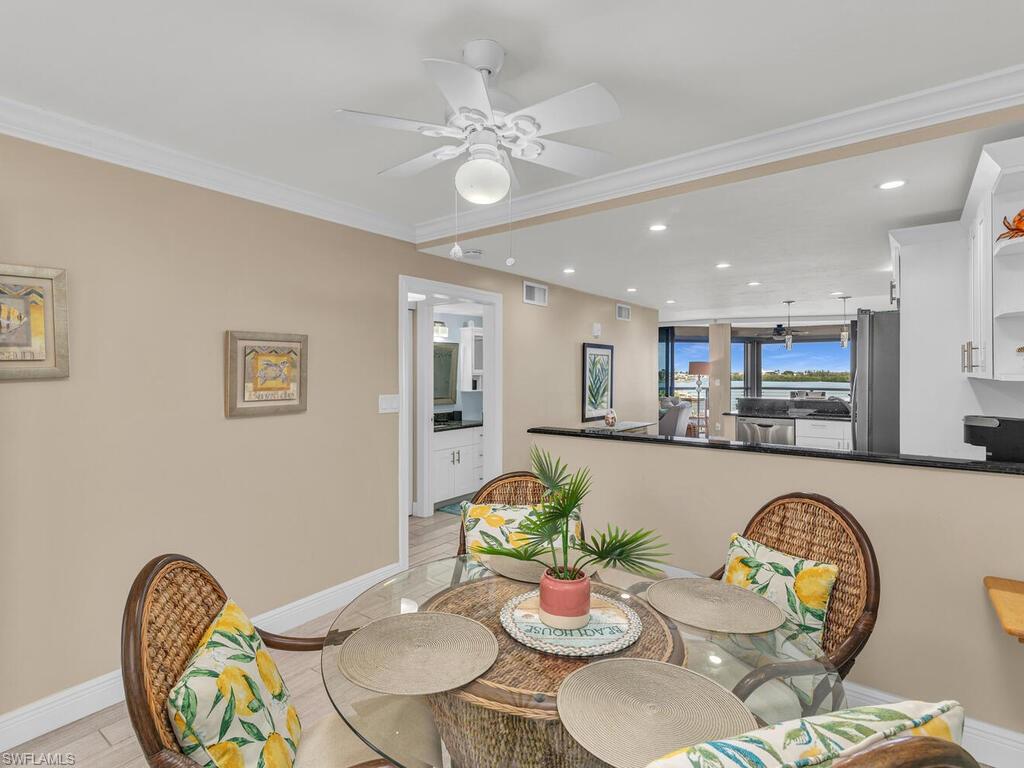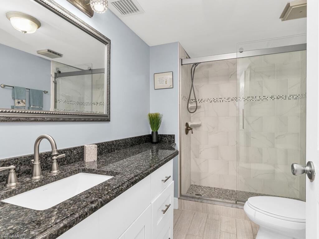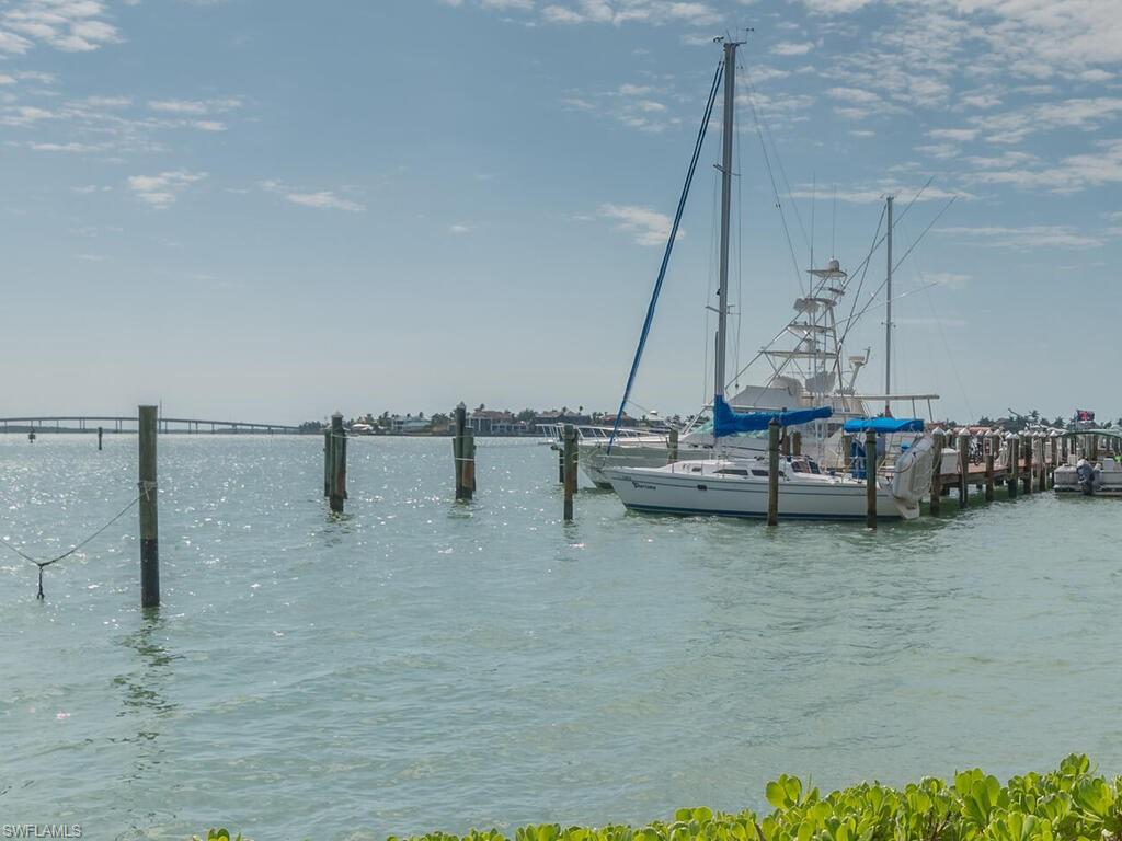 Completely renovated with amazing updates on this rare over-sized 2 bath condo located at Riverside Club in Old Marco.This high 5th floor condo in a quiet gated community has it all. Offering 1 bed and 2 baths and big views of the Marco River leading into the Gulf of America in just minutes. Amenities are endless; on site Marina with boat slips available for lease only $600 per year, tennis / pickleball courts, 2 pools and hot tubs, fishing pier and close proximity to restaurants and shopping. Remodel upgrades include custom driftwood ceramic flooring throughout, custom crown and base molding, freshly painted, new lighting and fans, A/C replaced in 2020, all new doors, custom kitchen cabinets with blue pearl granite kitchen counter tops, stainless kitchen appliances, washer/dryer in unit, new custom showers with tile and glass doors in both baths, all new hurricane impact windows along with electric roll down shutter, new updated lanai railings and screens. New community clubhouse at marina and so much more! Great investment unit with electric included in fees and nightly or weekly rentals allowed.