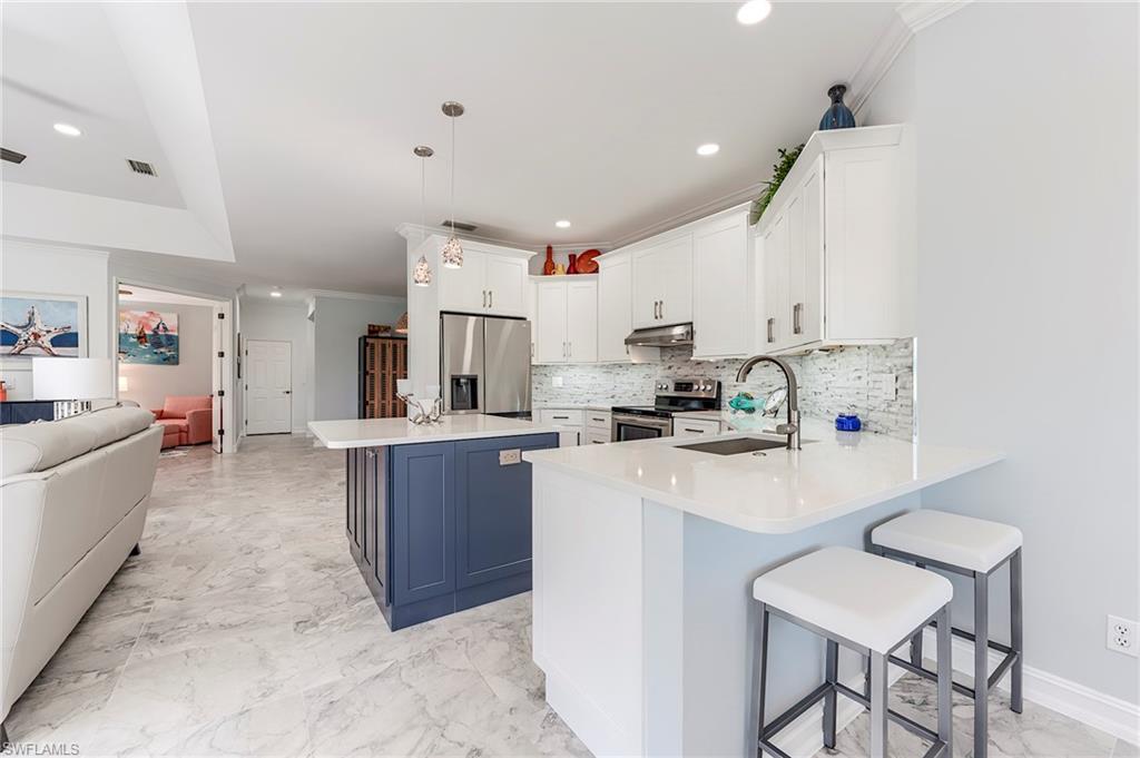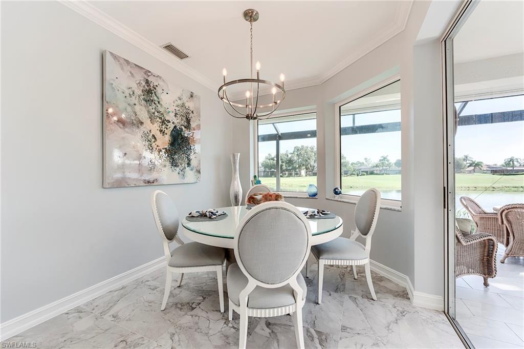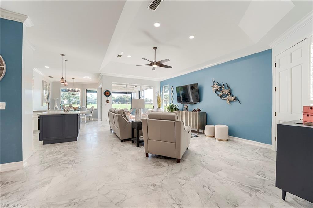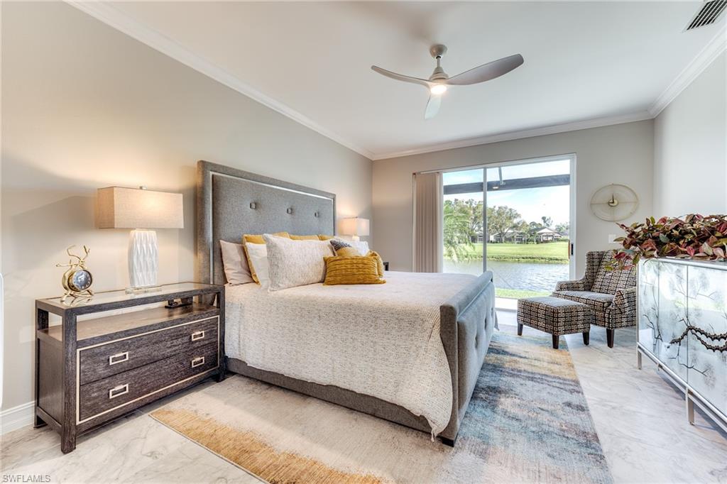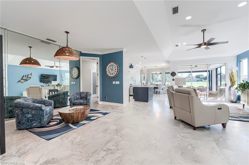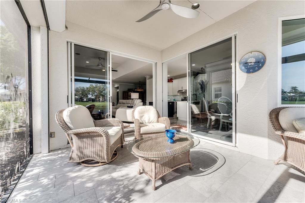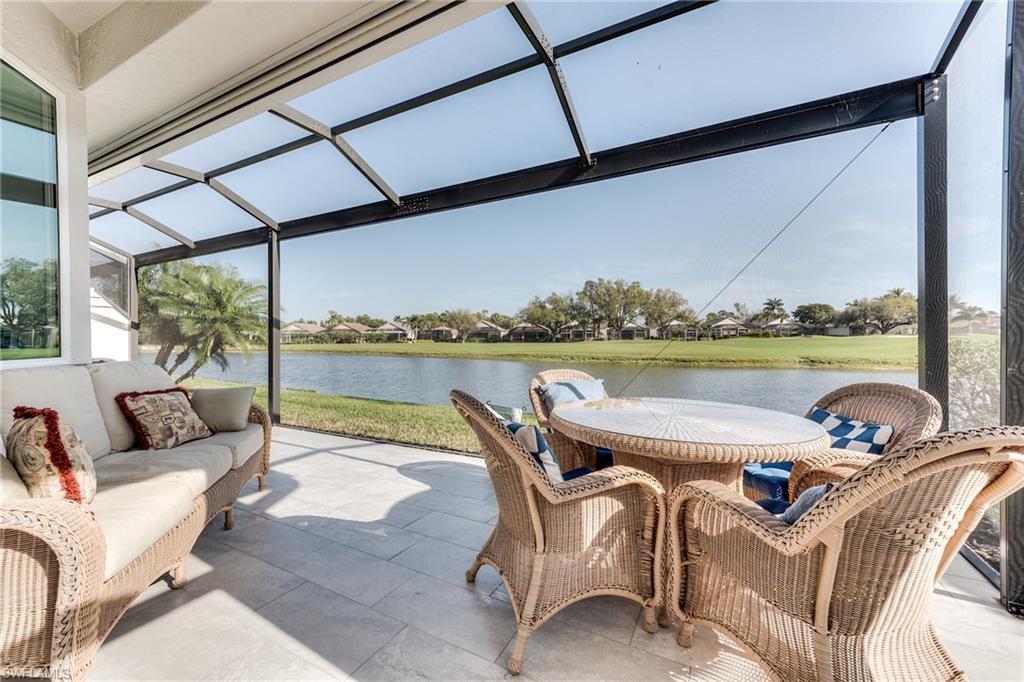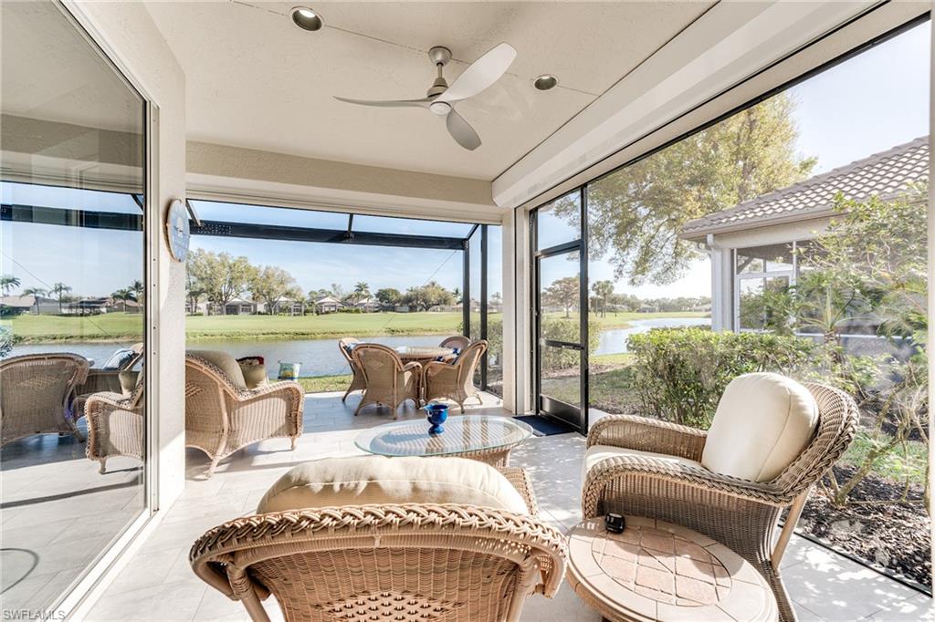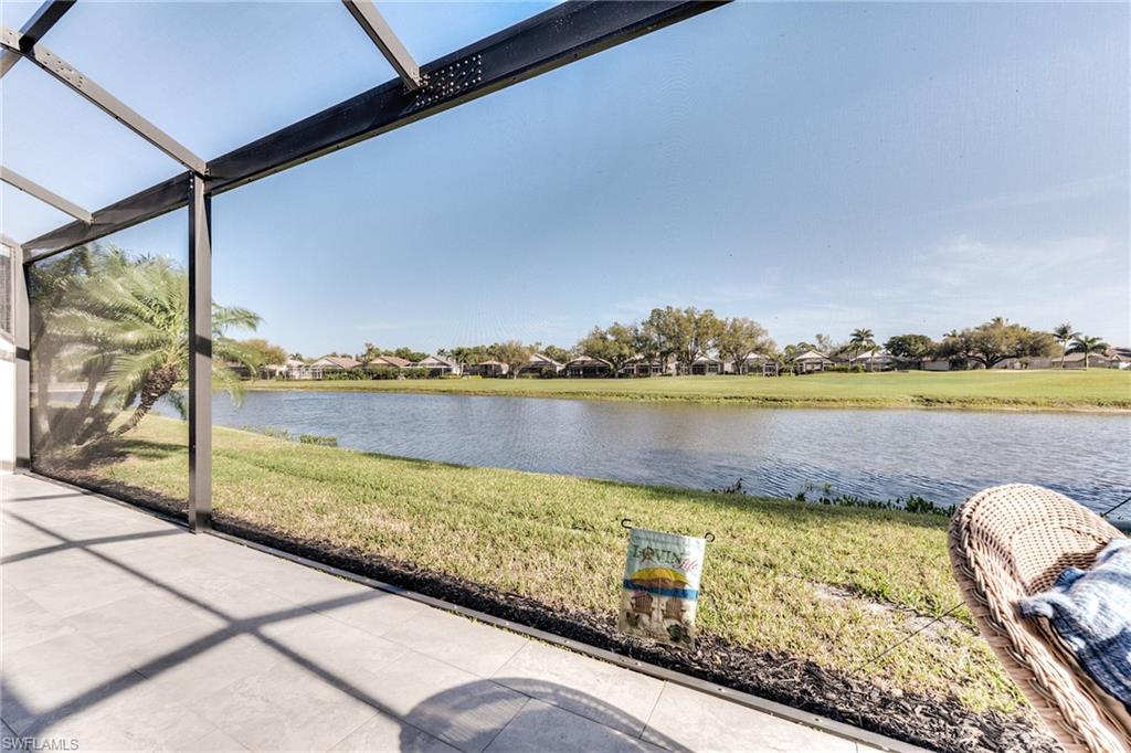 Amazingly gorgeous villa has been fully updated! It features an open floor plan with stunning 24 x 24 tile and elegant crown molding. The spacious kitchen boasts a large island, perfect for gatherings, while the cozy sitting area can serve as a formal dining space. Step out to the lanai, where you can enjoy breathtaking golf course and water views through a new panoramic screen. The primary bath is a luxurious retreat, complete with dual sinks featuring backlit mirrors and a roomy shower with an accent wall. Recent updates and extras include HVAC (2024), roof (2019), lanai screen (2021), interior doors, garage door & opener (2025), water softner, and replacement windows in the kitchen nook. All owners will need a social membership to the Estero Country Club, where you'll enjoy pickleball, tennis, bocce, multiple dining venues, fitness, and social activities. Golf memberships, including an executive membership for under 56, are also available for this fantastic 18 hole Gordon Lewis championship course that was just voted The BEST in Lee county. Don’t miss the opportunity to call this beautiful home your own!