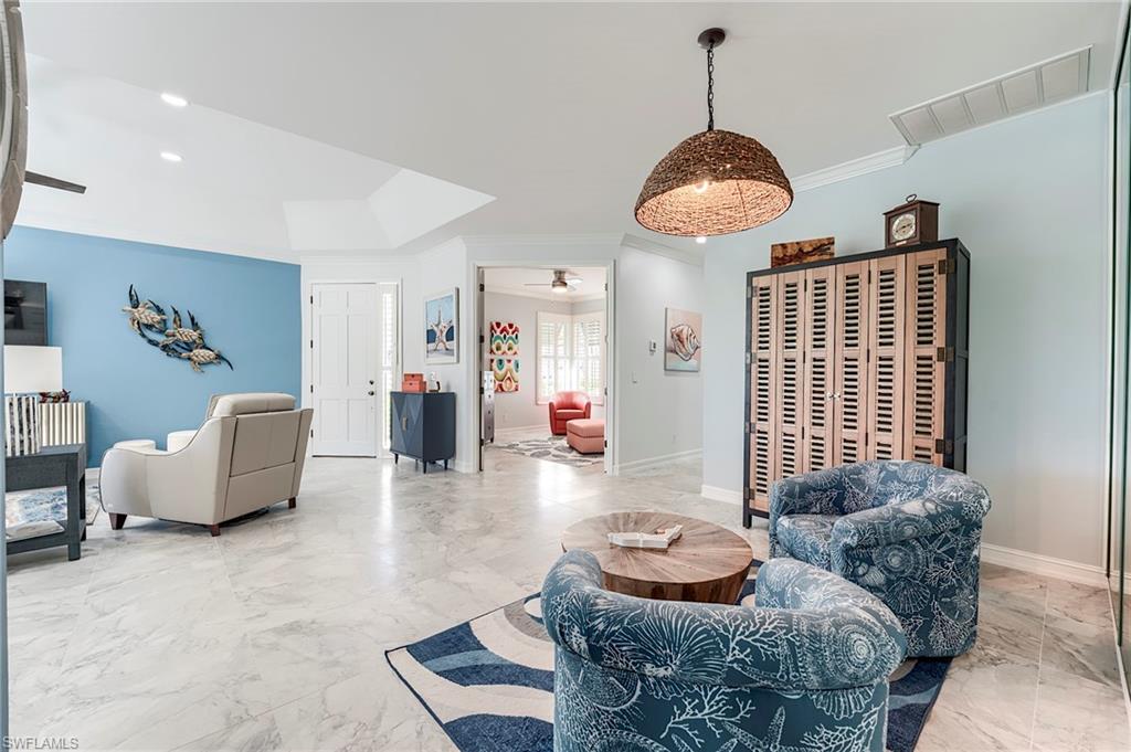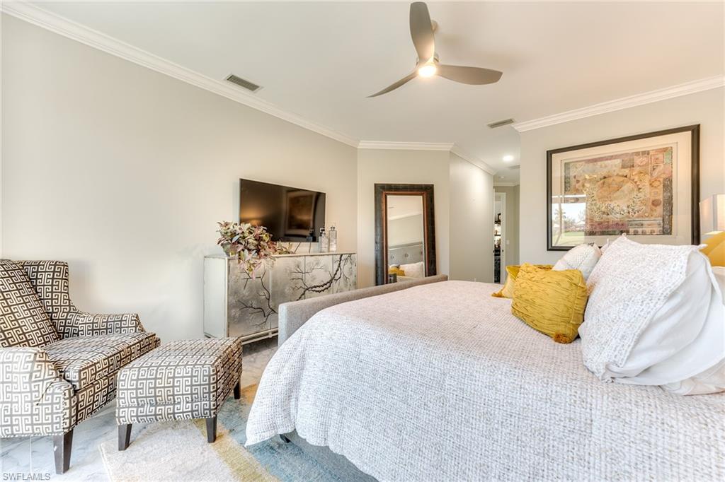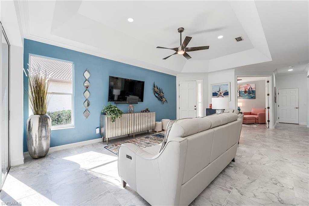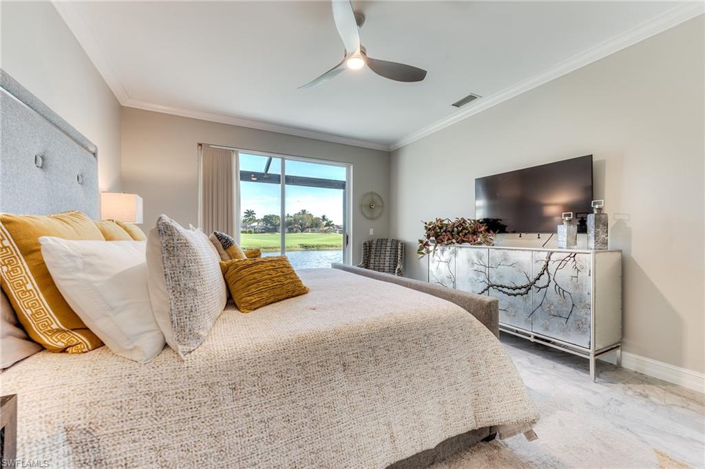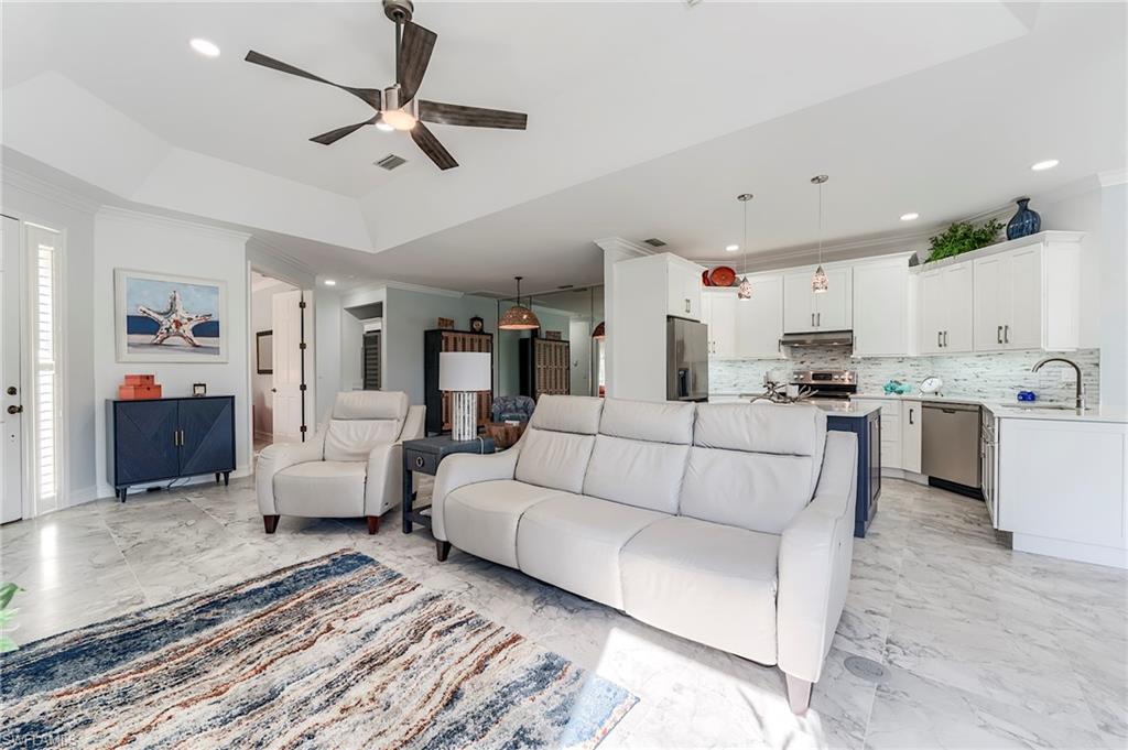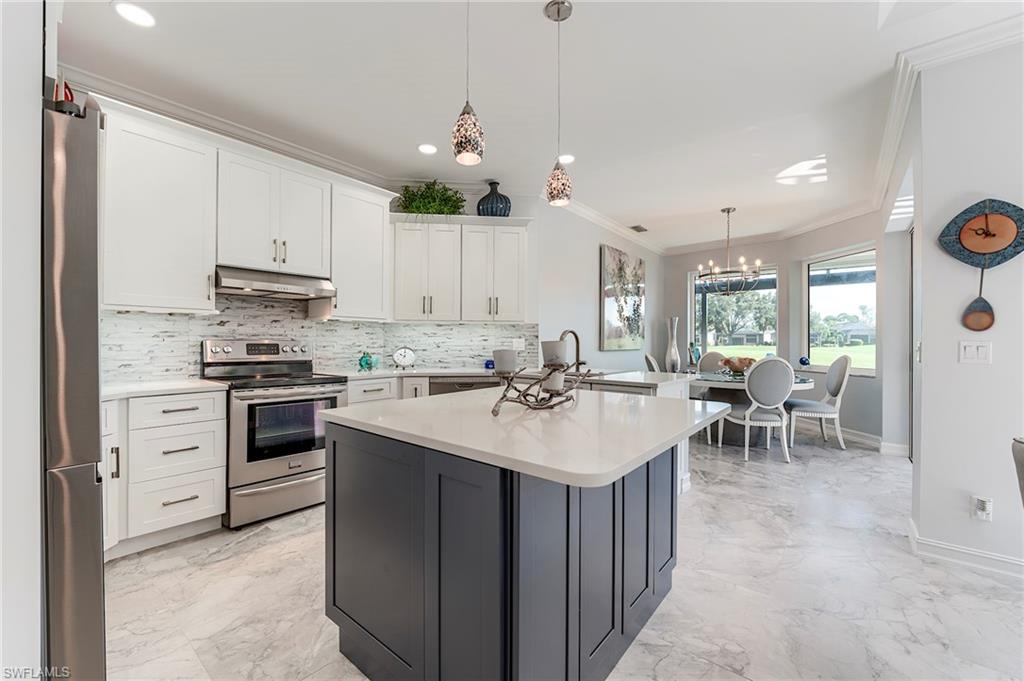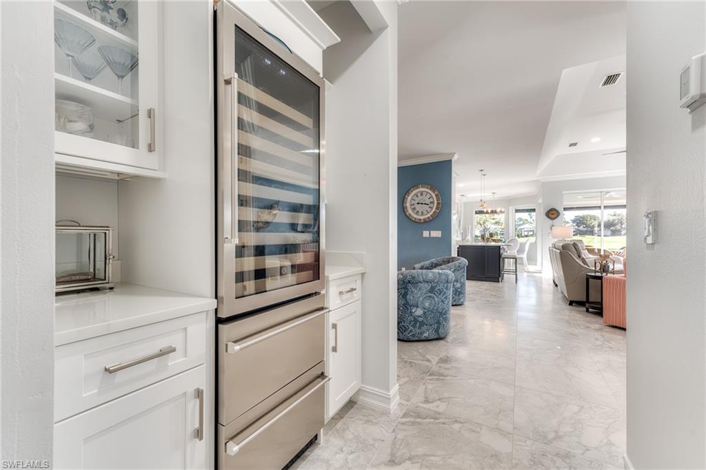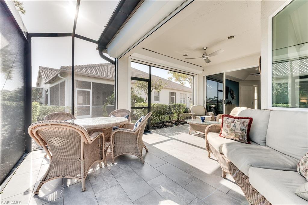 Amazingly gorgeous villa has been fully updated! It features an open floor plan with stunning 24 x 24 tile and elegant crown molding. The spacious kitchen boasts a large island, perfect for gatherings, while the cozy sitting area can serve as a formal dining space. Step out to the lanai, where you can enjoy breathtaking golf course and water views through a new panoramic screen. The primary bath is a luxurious retreat, complete with dual sinks featuring backlit mirrors and a roomy shower with an accent wall. Recent updates and extras include HVAC (2024), roof (2019), lanai screen (2021), interior doors, garage door & opener (2025), water softner, and replacement windows in the kitchen nook. All owners will need a social membership to the Estero Country Club, where you'll enjoy pickleball, tennis, bocce, multiple dining venues, fitness, and social activities. Golf memberships, including an executive membership for under 56, are also available for this fantastic 18 hole Gordon Lewis championship course that was just voted The BEST in Lee county. Don’t miss the opportunity to call this beautiful home your own!