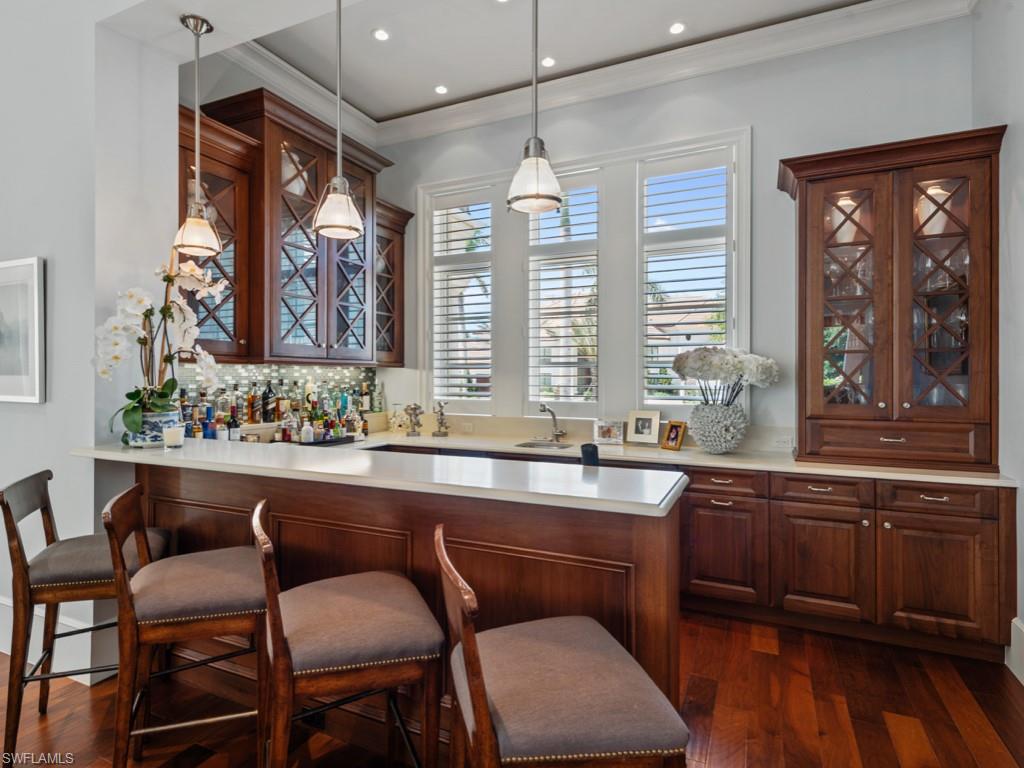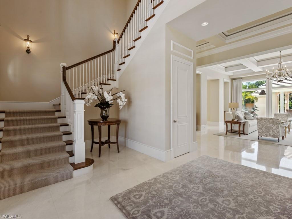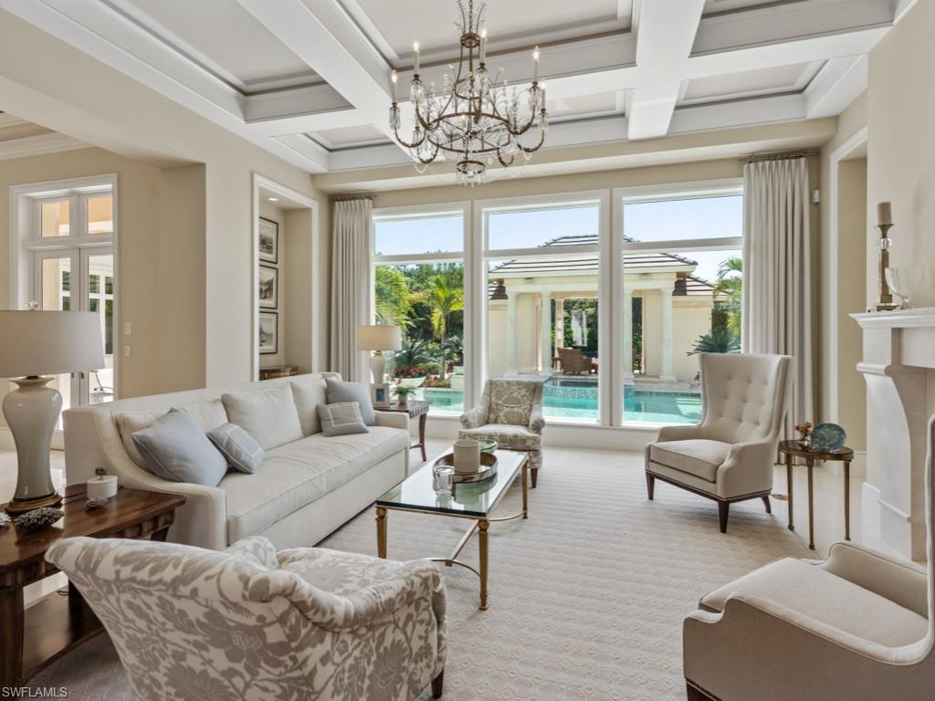 A 2013 Masterpiece nestled on a private acre-plus lot with lake views, this elegant custom home designed by Stofft Cooney Architects, built by Vincent Borelli, and with interior design and decor by Collins and Dupont, is a superb example of refined, timeless luxury. The home has every detail your heart desires, with a beautifully connected floor plan perfect for all types of entertaining, while still intimate enough to enjoy as a family home. With many luxurious details, including intricate ceiling millwork, a temperature-controlled wine-room, walk-in wet-bar with beverage refrigerator, butler's pantry and an elevator. The home features a primary suite plus 4 guest suites plus an attached, but separate, guest retreat with a 6th bedroom and sitting room, which could be an exercise studio, mother-in-law suite or a variety of other possibilities. The exterior spaces are perfect, benefiting from the oversized lot with lake views with an outdoor kitchen and extensive lanais for relaxing and dining, all featuring motorized screens and shutters, and a gas fire-pit for relaxing on chillier evenings. The pool and spa area has a shady cabana with pool bathroom, outdoor shower and storage, and there is a Kohler whole home generator for peace of mind. Located in Flood Zone X.500 with a 12.5' elevation, the home was a safe refuge in recent storms and suffered no damage or flooding. Bay Colony is Naples' luxury living at its finest, with its private beach club renowned for elegant 5-star dining, a sparkling beach-side pool with poolside bar, extensive beach services, and is available to Bay Colony residents and guests only.