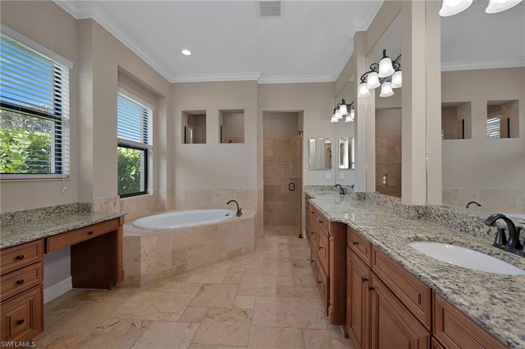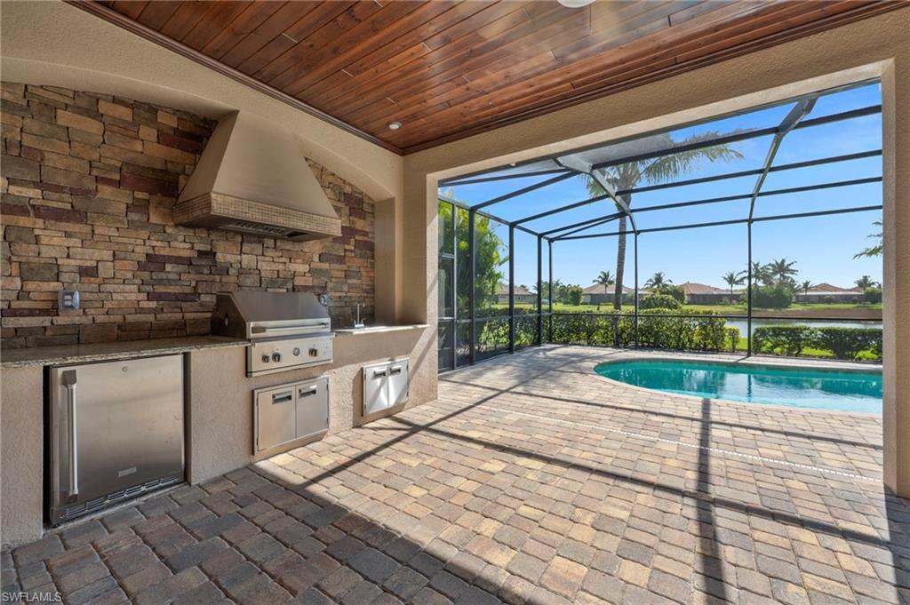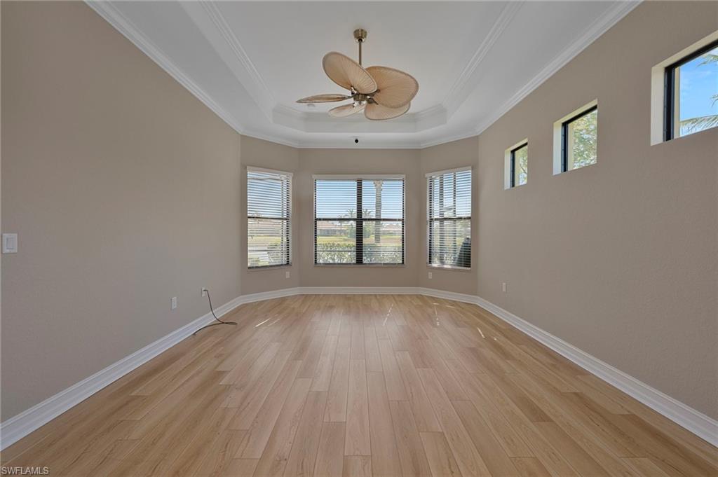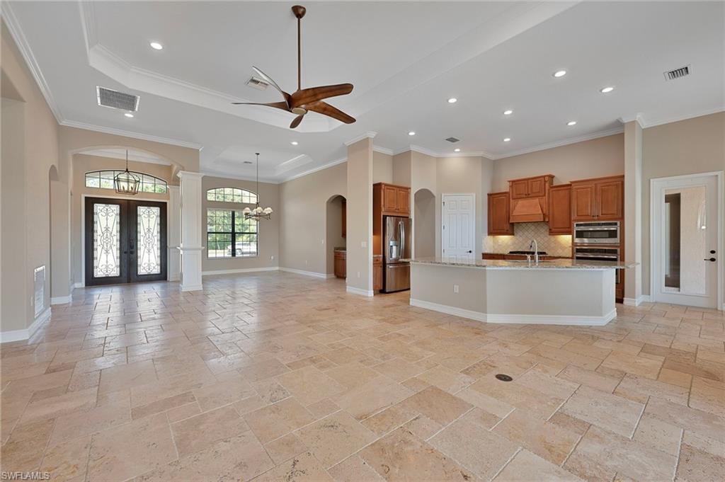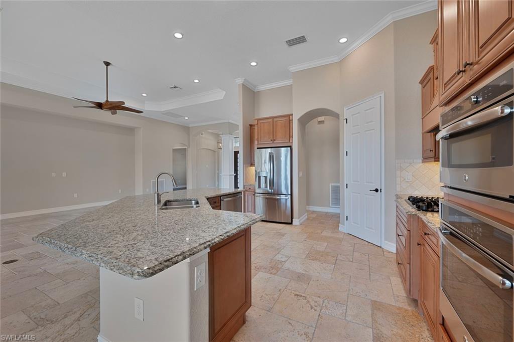 Motivated Seller, just made a HUGE $100,000.00 PRICE IMPROVEMENT! Presenting The Bougainvillea II located in prestigious Lagomar at Fiddler's Creek. Solid bones and an excellent foundation make it the perfect blank canvas to create the home of your dreams. Whether you envision modern updates or timeless charm, this property is brimming with possibilities. With an airy open-concept design, this spacious, freshly painted interior, 3 bedroom plus den, 3 bath home offers high coffered ceilings, crown molding, with an abundance of natural light. Neutral travertine flooring throughout, complemented by brand-new neutral carpets in the guest bedrooms. High-end stainless steel appliances, including a five-burner gas cooktop with a hood, wall oven, microwave, french door refrigerator and dishwasher, make meal prep effortless. A charming breakfast nook overlooks the pool and spa. The outdoor lakefront space boosts an extended lanai, oversized pool, and spa, pool bath, and built-in barbeque, ideal for hosting and relaxation. The owner's suite is a private retreat, offering hardwood flooring, lanai access, custom walk-in his and hers closets. The en-suite bath boasts a dual-sink vanity, bathtub and a walk-in shower. Two spacious guest bedrooms, each with an en-suite bath, provides privacy and comfort. A versatile den with a double-door entry is ideal as a private office or study. Fiddler's Creek offers resort-style amenities, including immediate golf membership to purchase at the Fiddler's Creek Golf and Country Club with 100% equity, fully refundable, pools, dining, a spa, fitness center and sports courts, with optional beach and marina memberships. Come experience timeless luxury just minutes from Marco Island and Naples 5th Avenue. Dream where you live at Fiddler's Creek!