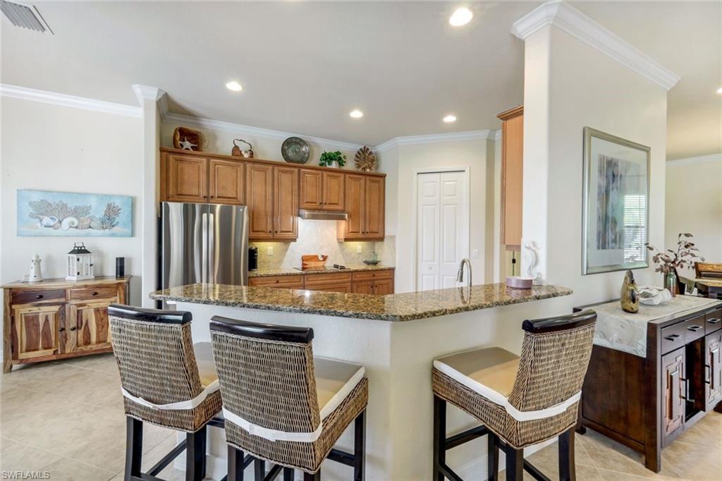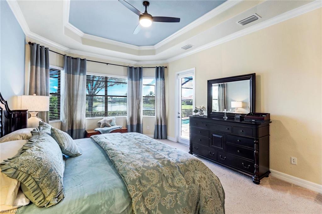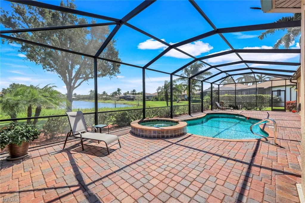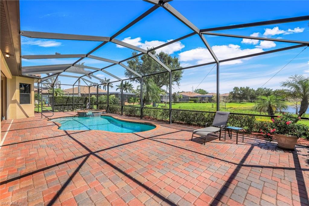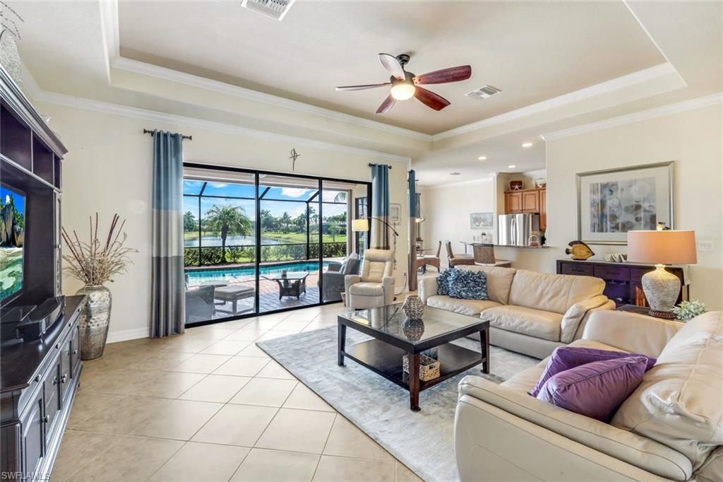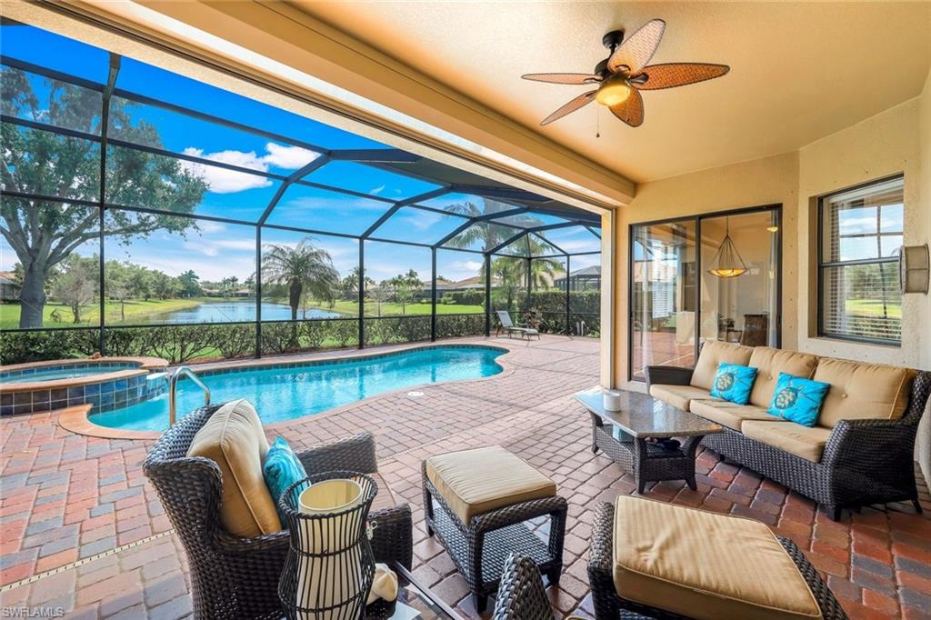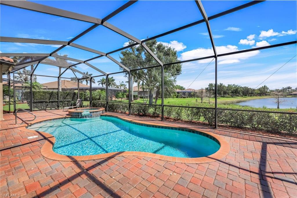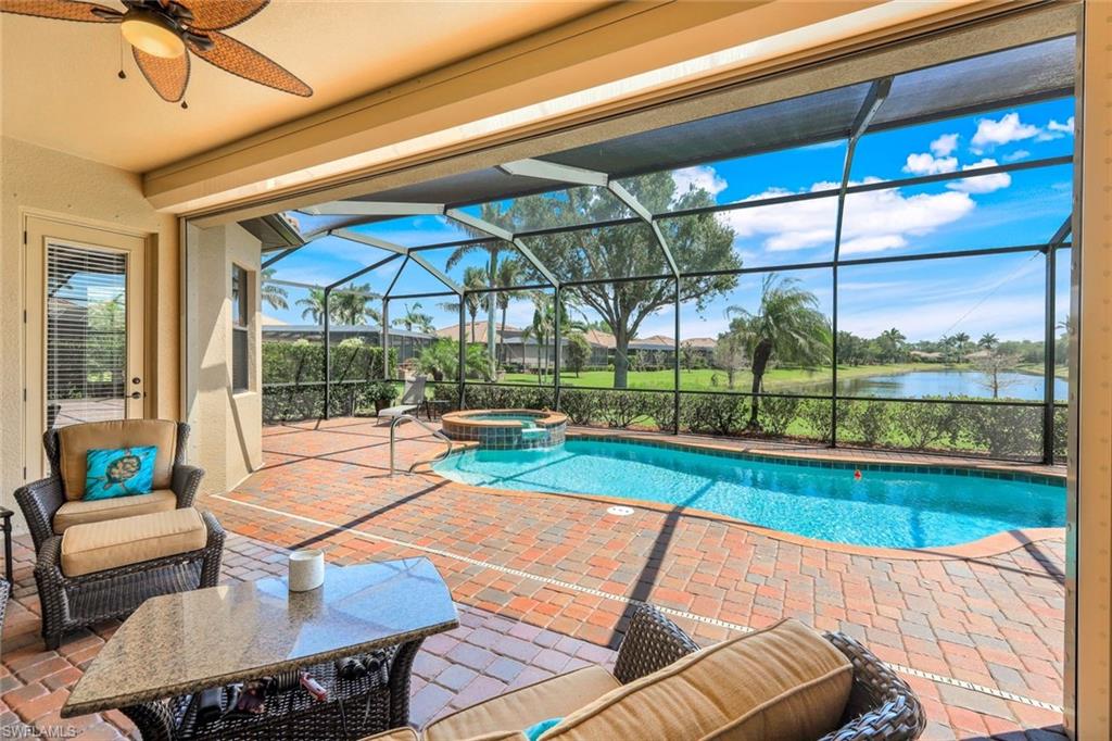 The Oakmont floor plan is one of the most desirable layouts in Copper Cove, featuring 4 bedrooms, 2.5 baths, and an expanded lanai with pool and spa overlooking serene lake views with ideal eastern exposure. Inside, the gourmet kitchen is equipped with upgraded stainless steel appliances, a wall oven, and a spacious pantry, while the laundry room offers convenience with an upgraded LG washer and dryer, utility sink, and upper cabinets for extra storage. Elegant details include tray ceilings in both the great room and primary suite. The 3-car garage is finished with epoxy floors and a second refrigerator, adding functionality and style. For peace of mind, the home is fitted with electric storm shutters on the lanai and front door, with manual shutters on all windows. Meticulously maintained inside and out, this furnished residence is move-in ready. Perfectly situated just a short drive to Marco Island and Downtown Naples, you’ll enjoy world-class beaches, boating, golf, dining, and entertainment right at your fingertips. This home is truly a must-see!