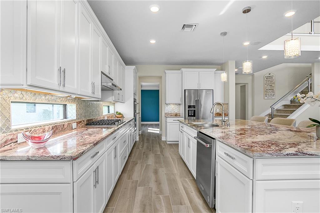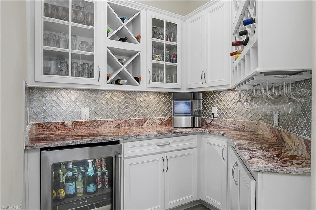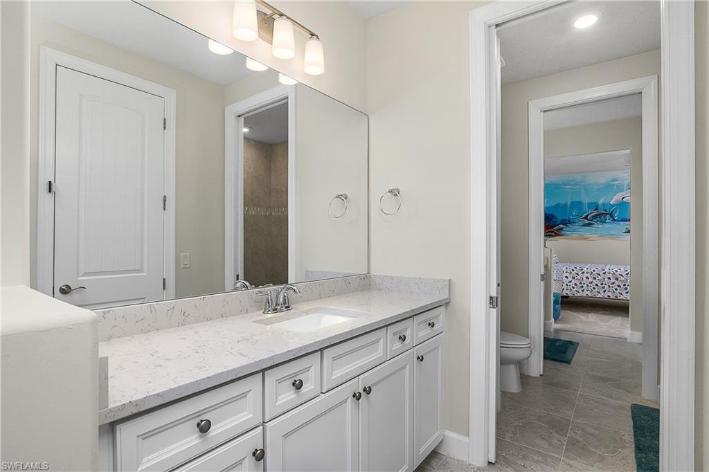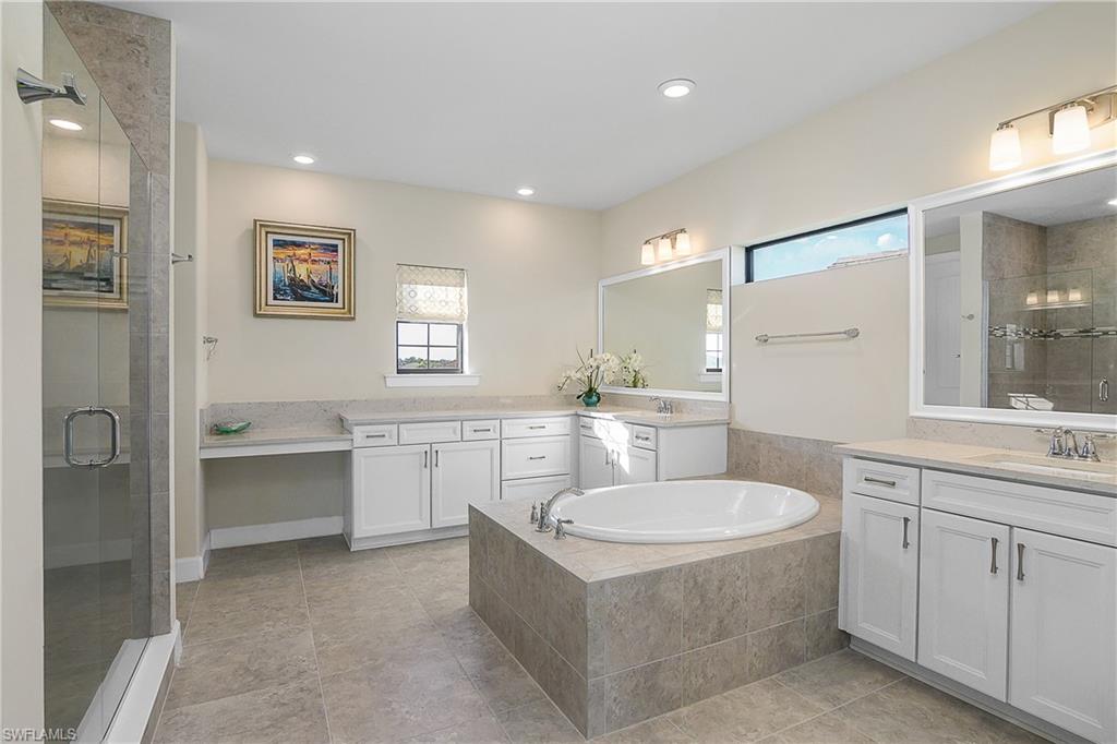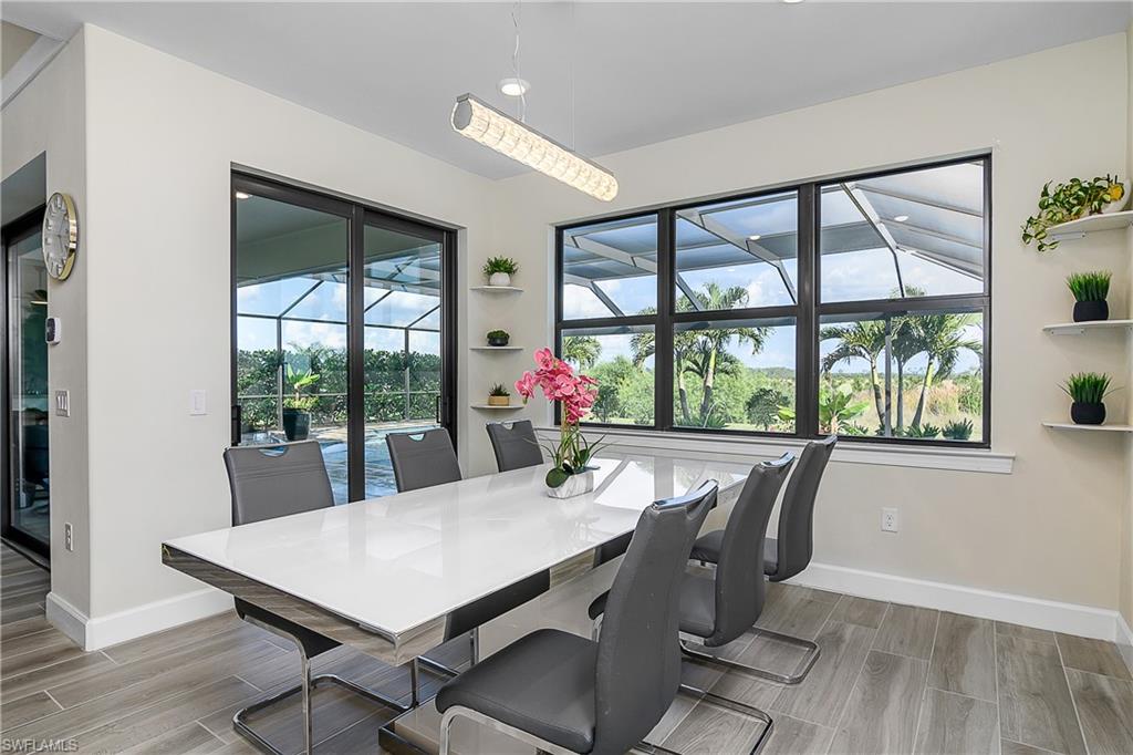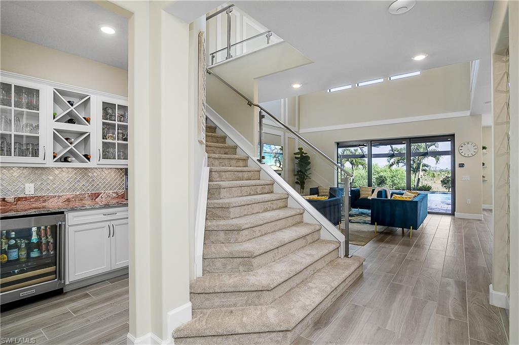 LARGEST CUSTOM POOL HOME IN THE PLACE AT CORKSCREW – MOVE-IN READY! This stunning Pulte Heatherton offers 5 bedrooms + flex/bonus space, 4 full baths (including a pool bath), soaring two-story ceilings, and a rare 4-car air-conditioned garage on a private preserve lot. Inside, discover an elegant open-concept layout with a dramatic glass staircase, custom feature TV wall in the luxurious custom family room with triple hurricane-impact sliders flooding the family room with natural light and providing endless views of the pool and lanai. The gourmet kitchen is a showstopper with an extra-large oversized quartzite kitchen island, wall oven, butler’s pass with wet bar, walk-in pantry, and formal dining room. A first-floor bedroom + bath, custom wine bar, and built-in bookcase flex room adds versatility to this sprawling two-story home. Upstairs, the luxury owner’s suite includes a sitting area, spa bath with soaking tub + dual vanities, and two walk-in closets and stunning views of the private preserve. Secondary bedrooms include a jack-and-jill with custom murals and a private en-suite, and another guest bedroom with ensuite. Step outside to your magnificent custom built oasis: a 40' heated saltwater sport pool with recessed spa, waterfalls, fountains, dual sun decks, and lighting—enclosed by a panoramic screen overlooking the preserve. A custom outdoor kitchen and extended lanai make entertaining effortless. Additional upgrades: whole-house generator, 9-car paver driveway, solid-core 8' doors, custom laundry, water softener + R/O system, Sonos 4-zone speakers, hurricane-impact windows/doors, and epoxy garage flooring and tons of storage! The Place at Corkscrew offers resort-style living with an abundance of amenities including a resort lagoon pool with a 100' waterside, two waterfalls, 40-person, two zero entry points, splashpad, cabanas, sand volleyball, indoor and outdoor restaurant and bars, café and market place, adult-only bourbon bar, two-story fitness center, yoga room, spa room, kids care center, pickleball, tennis, basketball, dog park, sidewalks, street lights and so much more. Luxury! Lifestyle! Location! This is Florida living at its finest!!