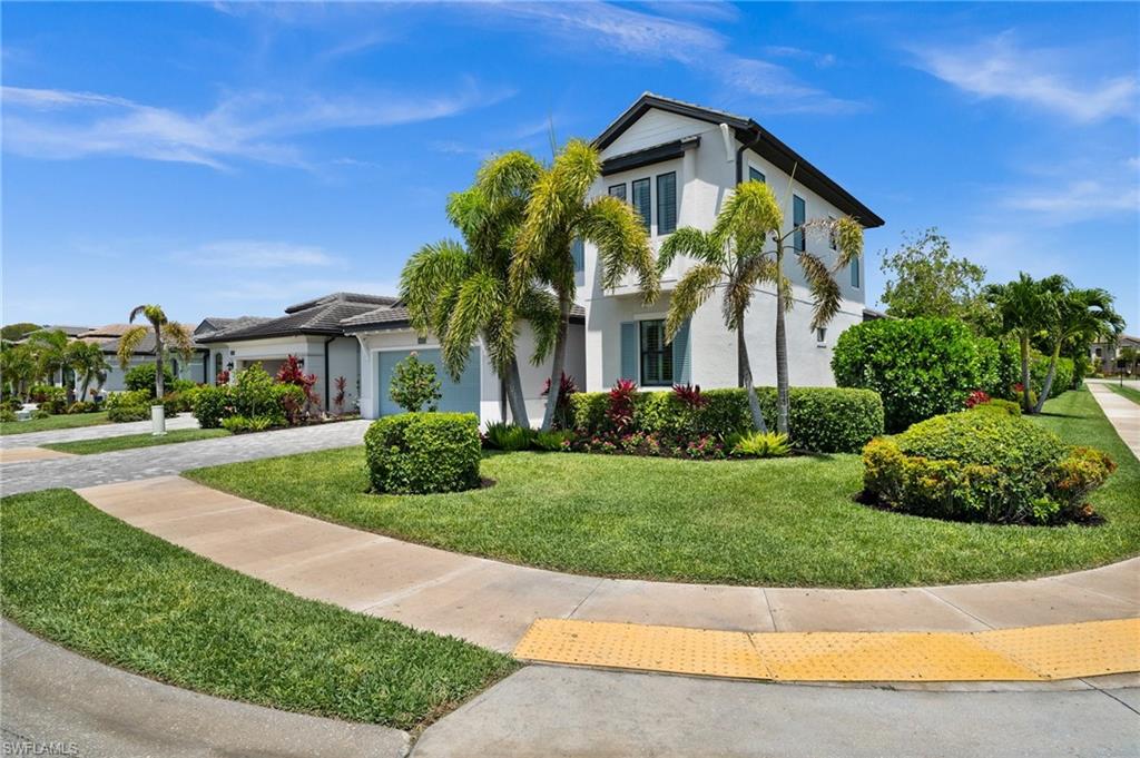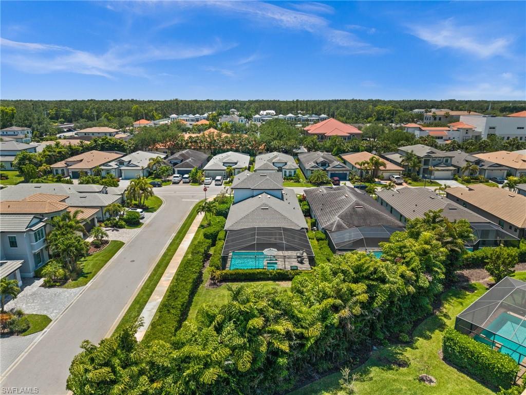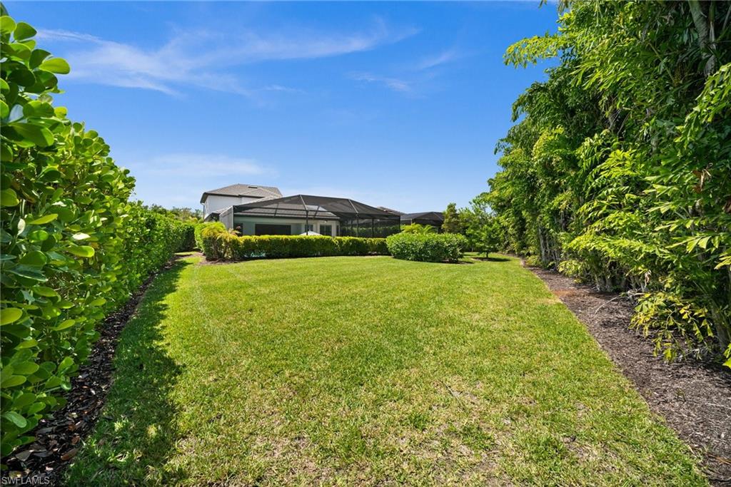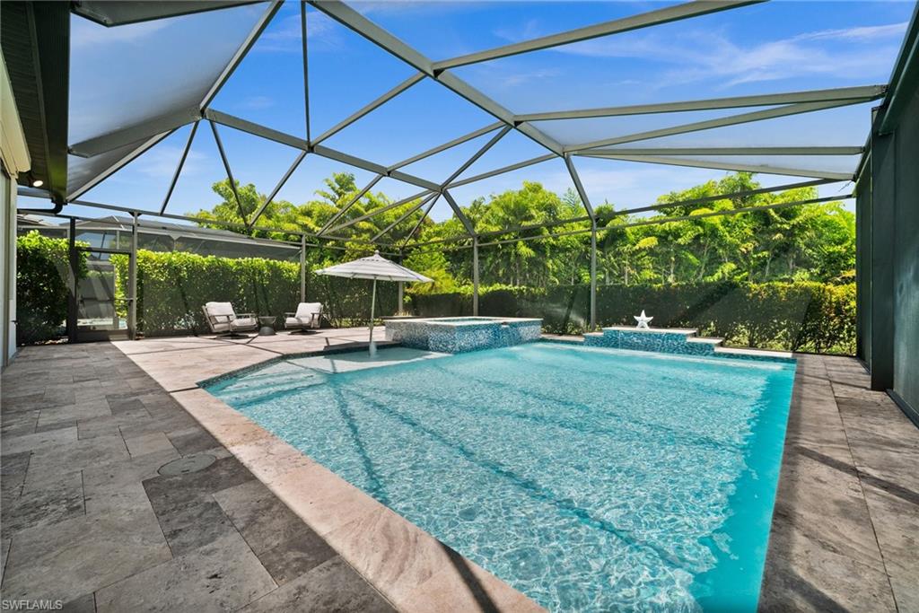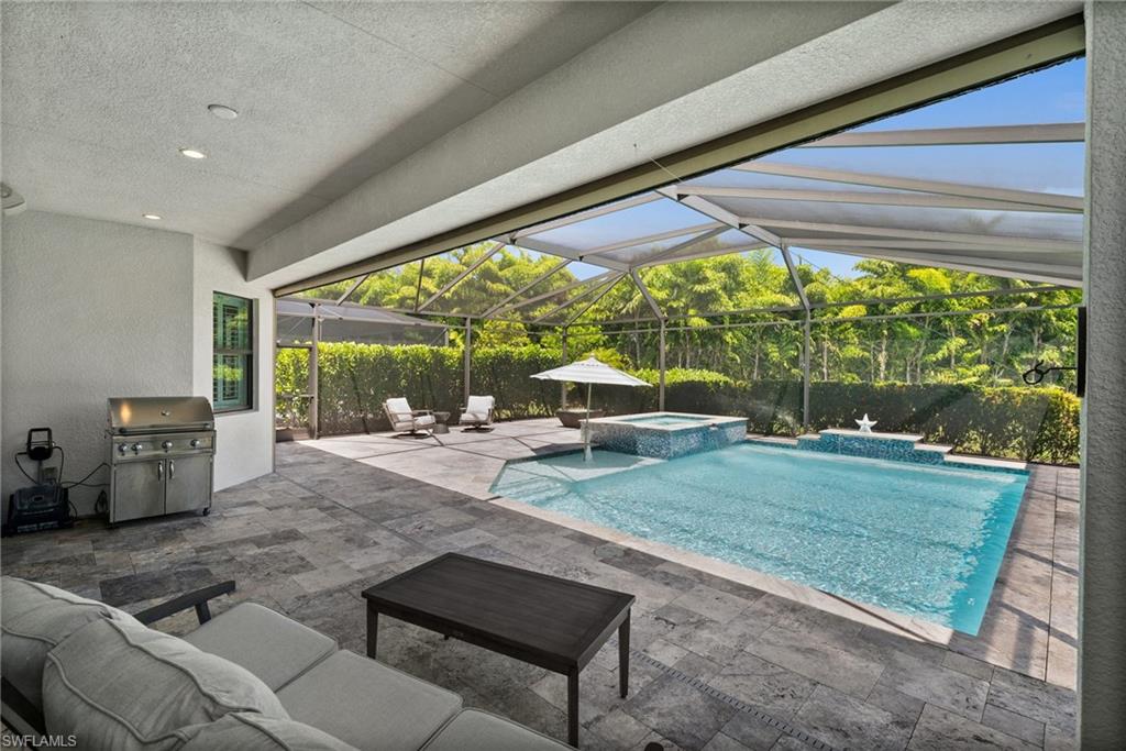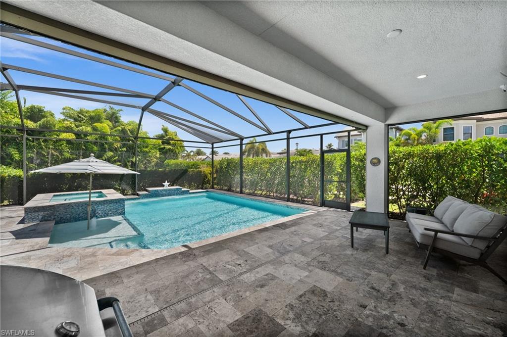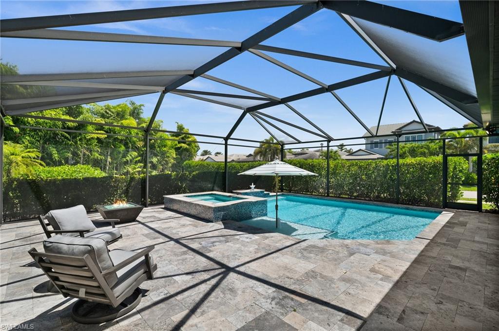 Tucked behind privacy hedges on a desirable corner lot, this residence in Palazzo at Naples boasts the largest lot with a rare rear yard. This beautifully appointed furnished 4 bed 4 bath plus loft home provides an exceptional blend of elegance, comfort, and indoor-outdoor living. Be sure to click on the lifestyle video! The extended screened lanai is a private paradise, showcasing a sparkling pool with a waterfall feature, spa, built-in gas fire pit, and multiple covered and open-air lounging and dining areas—ideal for sunset cocktails or starlit dinners. Inside, Sonos sound system surrounds you, the timeless tile floors flow throughout the open-concept layout. The soaring two-story design includes a great room that seamlessly connects to the gourmet kitchen, complete with a gas range, sprawling island, chic pendant lighting, and a walk-in pantry. Upstairs, a versatile loft/family room convertible to 5th bedroom accompanies a 4th guest bedroom and 4th full bath, while two additional guest bedrooms are downstairs, each of which enjoys its own bath. The spacious primary suite offers serenity and seclusion, featuring two walk-in closets and an ensuite bath with dual vanities, a soaking tub, and a separate glass-enclosed shower for a spa-like retreat. Designed with versatility in mind, this home provides ample space for work, relaxation, and entertainment and a home generator. Located in the gated enclave of Palazzo at Naples, residents enjoy proximity to white sand Gulf beaches, upscale shopping and dining at Mercato, world-class golf, and Southwest Florida International Airport. With only 85 architecturally distinctive homes, Palazzo is a tranquil, low-maintenance community that defines upscale Naples living. Memberships to nearby country clubs are available & not mandatory, making Palazzo a great choice.