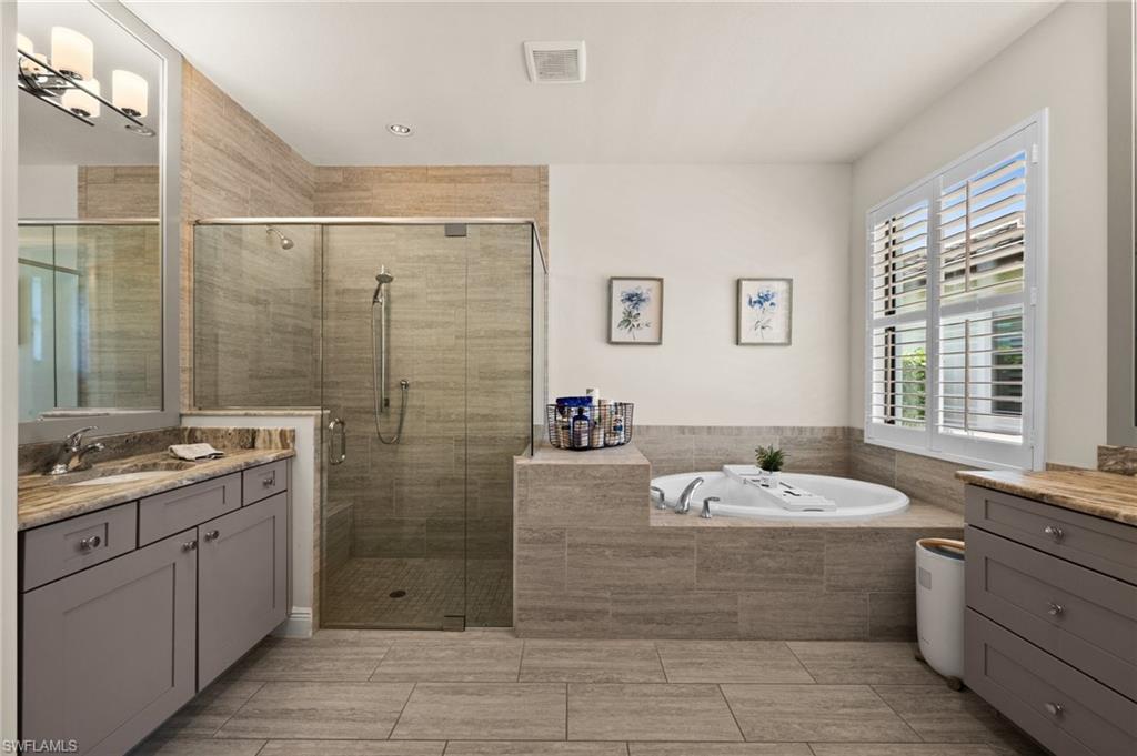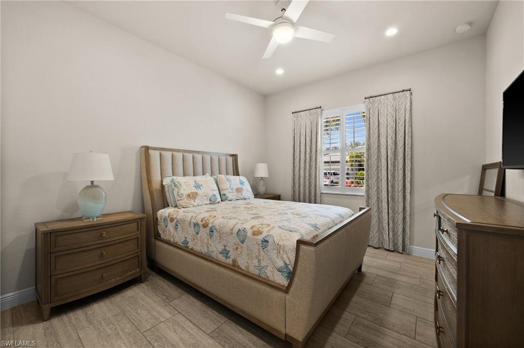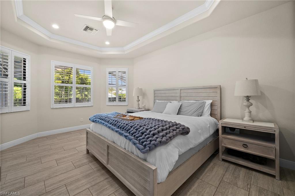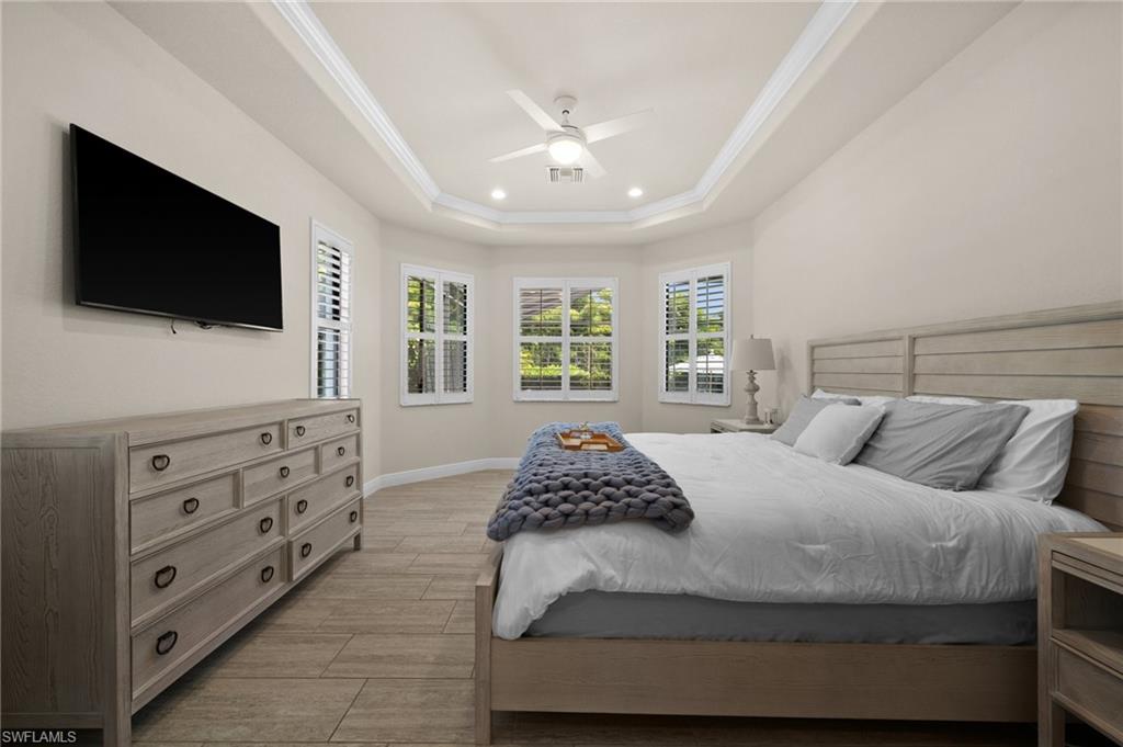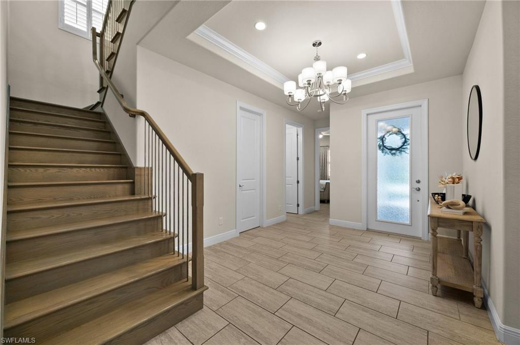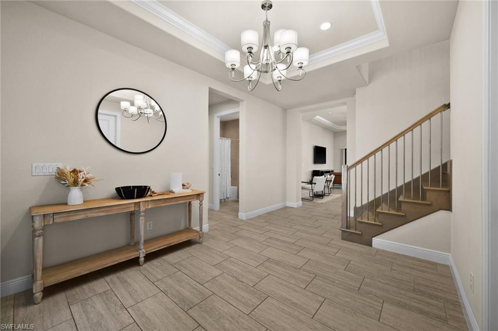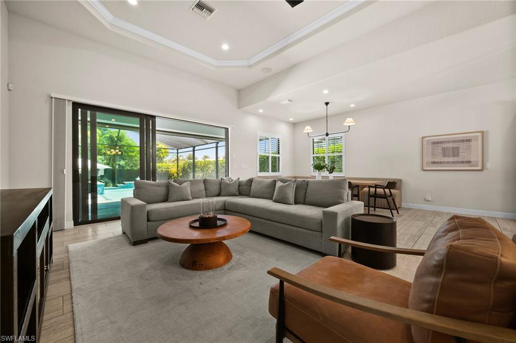 Tucked behind privacy hedges on a desirable corner lot, this residence in Palazzo at Naples boasts the largest lot with a rare rear yard. This beautifully appointed furnished 4 bed 4 bath plus loft home provides an exceptional blend of elegance, comfort, and indoor-outdoor living. Be sure to click on the lifestyle video! The extended screened lanai is a private paradise, showcasing a sparkling pool with a waterfall feature, spa, built-in gas fire pit, and multiple covered and open-air lounging and dining areas—ideal for sunset cocktails or starlit dinners. Inside, Sonos sound system surrounds you, the timeless tile floors flow throughout the open-concept layout. The soaring two-story design includes a great room that seamlessly connects to the gourmet kitchen, complete with a gas range, sprawling island, chic pendant lighting, and a walk-in pantry. Upstairs, a versatile loft/family room convertible to 5th bedroom accompanies a 4th guest bedroom and 4th full bath, while two additional guest bedrooms are downstairs, each of which enjoys its own bath. The spacious primary suite offers serenity and seclusion, featuring two walk-in closets and an ensuite bath with dual vanities, a soaking tub, and a separate glass-enclosed shower for a spa-like retreat. Designed with versatility in mind, this home provides ample space for work, relaxation, and entertainment and a home generator. Located in the gated enclave of Palazzo at Naples, residents enjoy proximity to white sand Gulf beaches, upscale shopping and dining at Mercato, world-class golf, and Southwest Florida International Airport. With only 85 architecturally distinctive homes, Palazzo is a tranquil, low-maintenance community that defines upscale Naples living. Memberships to nearby country clubs are available & not mandatory, making Palazzo a great choice.