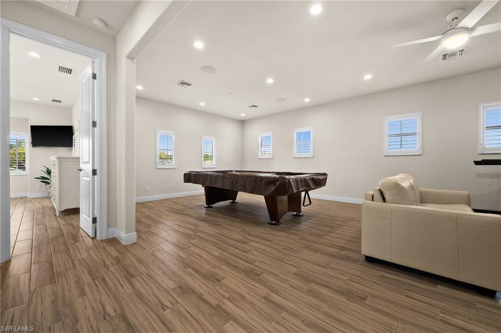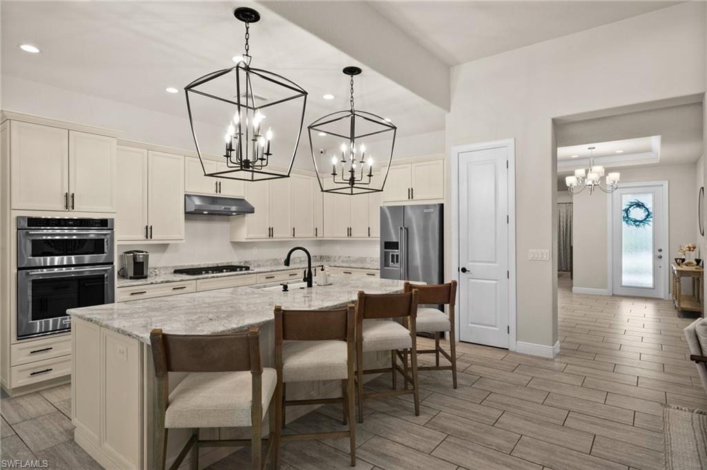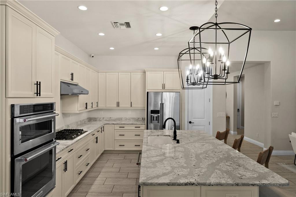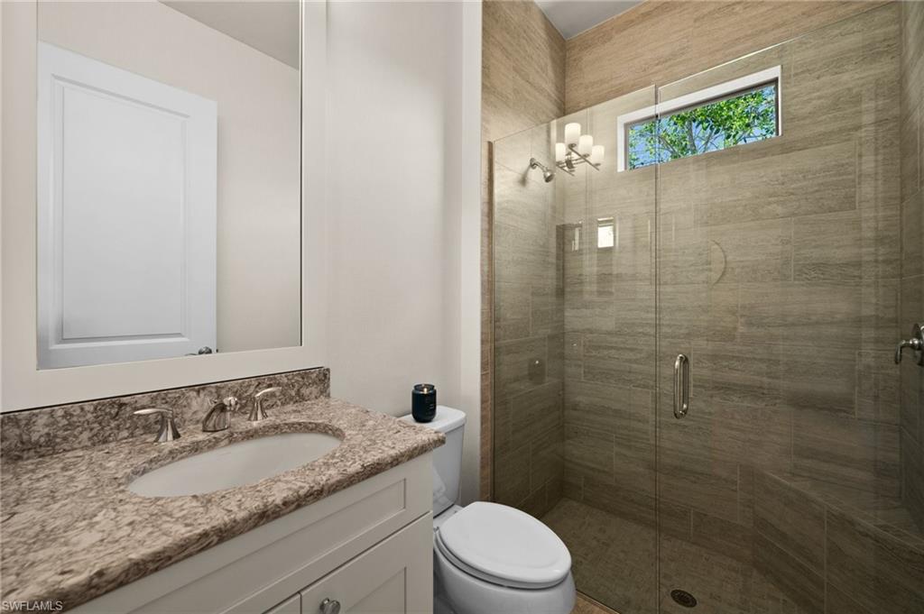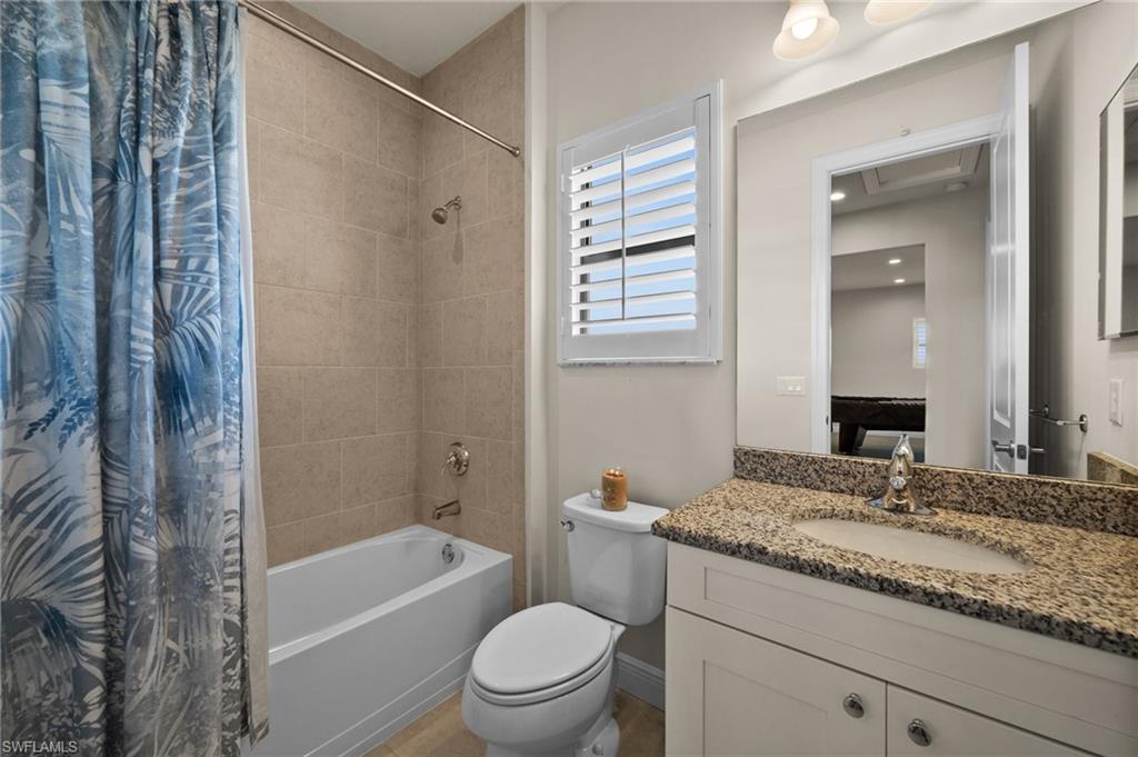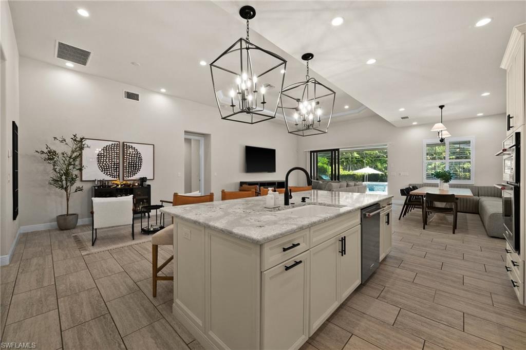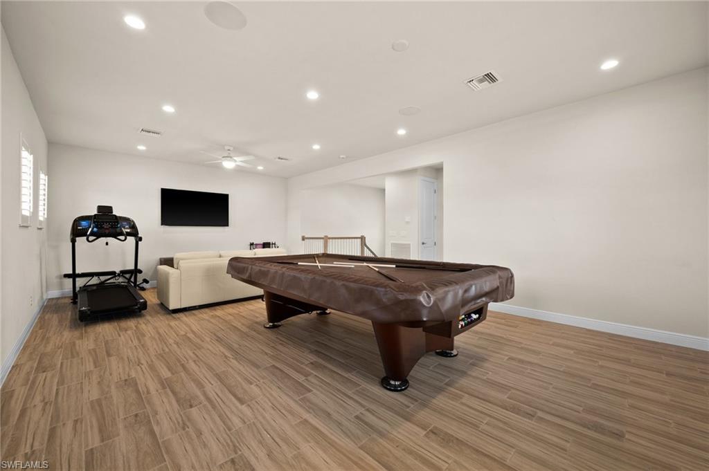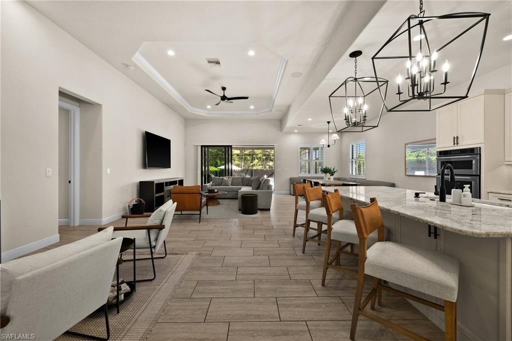 Tucked behind privacy hedges on a desirable corner lot, this residence in Palazzo at Naples boasts the largest lot with a rare rear yard. This beautifully appointed furnished 4 bed 4 bath plus loft home provides an exceptional blend of elegance, comfort, and indoor-outdoor living. Be sure to click on the lifestyle video! The extended screened lanai is a private paradise, showcasing a sparkling pool with a waterfall feature, spa, built-in gas fire pit, and multiple covered and open-air lounging and dining areas—ideal for sunset cocktails or starlit dinners. Inside, Sonos sound system surrounds you, the timeless tile floors flow throughout the open-concept layout. The soaring two-story design includes a great room that seamlessly connects to the gourmet kitchen, complete with a gas range, sprawling island, chic pendant lighting, and a walk-in pantry. Upstairs, a versatile loft/family room convertible to 5th bedroom accompanies a 4th guest bedroom and 4th full bath, while two additional guest bedrooms are downstairs, each of which enjoys its own bath. The spacious primary suite offers serenity and seclusion, featuring two walk-in closets and an ensuite bath with dual vanities, a soaking tub, and a separate glass-enclosed shower for a spa-like retreat. Designed with versatility in mind, this home provides ample space for work, relaxation, and entertainment and a home generator. Located in the gated enclave of Palazzo at Naples, residents enjoy proximity to white sand Gulf beaches, upscale shopping and dining at Mercato, world-class golf, and Southwest Florida International Airport. With only 85 architecturally distinctive homes, Palazzo is a tranquil, low-maintenance community that defines upscale Naples living. Memberships to nearby country clubs are available & not mandatory, making Palazzo a great choice.