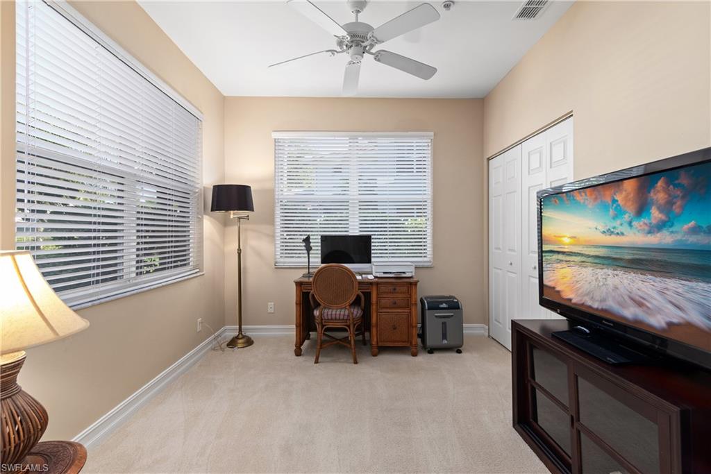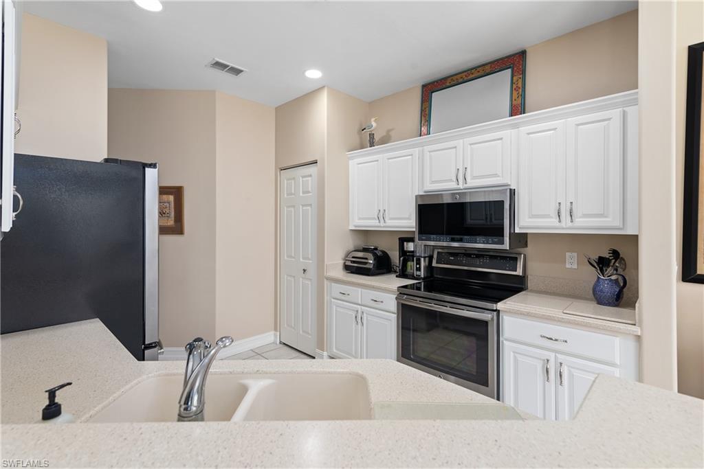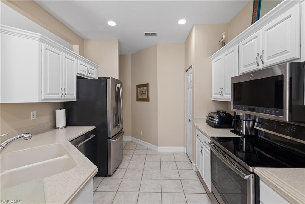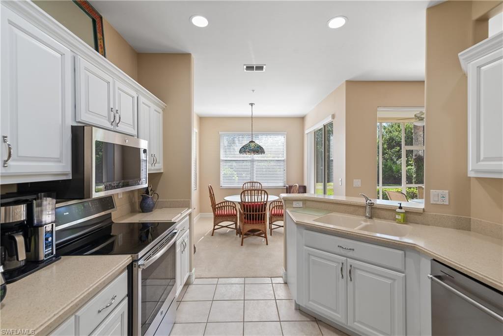 This sought-after 3-bedroom end unit residence with adjacent 1-car garage is ready for a new owner! It offers an open floor plan, with split bedrooms for peaceful retreats, neutral colors throughout and a private lanai overlooking a tranquil preserve area that showcases beautiful wildlife and a serene spot to start or end your day in Naples. The kitchen has a comfortable layout & plenty of storage; white cabinetry & countertops, and stainless-steel appliances. Tarpon Cove is a gated North Naples community known for its coastal charm, low density, pools and walking paths for outdoor fitness, and is located West of US-41. The best of all worlds, and, a "high and dry" location, too! This is just a short distance from the pristine Gulf beaches, Island Marina, and the many vibrant dining and shopping options of Mercato, in addition to Waterside Shops and other popular destinations. It is also directly adjacent to the new and acclaimed Kinsale Golf Club. The community has a wonderful variety of nature, preserve & lake views with benches should you enjoy many moments venturing out or returning home from a walk or visits with friends and neighbors. Enjoy access to amenities such as three resort-style pools, a spa, and a community center for gatherings. Tarpon Cove Yacht & Racquet Club is just a short distance away with added amenities for members, including a private pontoon boat that shuttles to Delnor-Wiggins State Beach Park. The new Kinsale Golf Club is immediately to the west. Interested in a property that combines comfort, sought-after amenities, security, and a prime Naples location? This wonderful end unit, ground floor residence is ready for you! Presently, one bedroom is in use as an office. Note, larger pets (dogs) are permitted with approval - truly, hard to find in many Naples condo lifestyle options