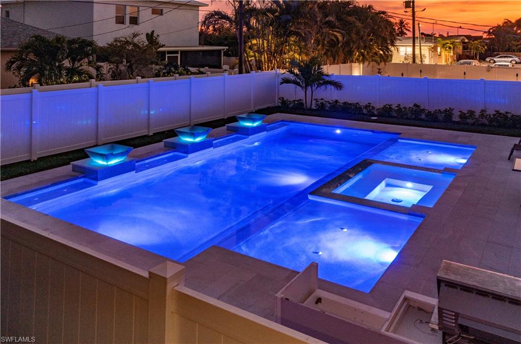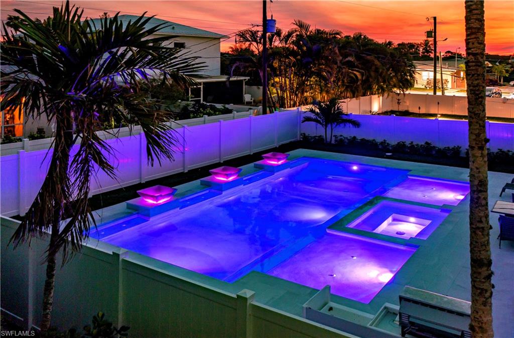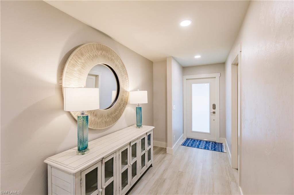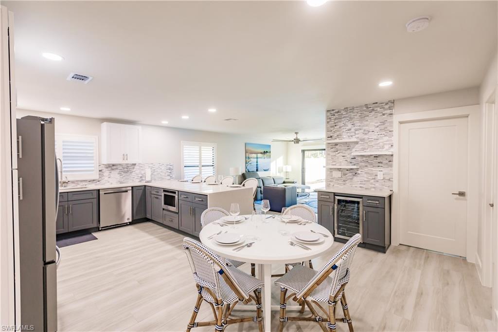 This fully remodeled and turnkey furnished 4-bedroom, 2-bath home offers stylish comfort in one of Naples’ most desirable neighborhoods—west of 41, just minutes from Vanderbilt Beach, Mercato, The Ritz-Carlton, LaPlaya Beach & Golf Club, and more. Step into a light, open floor plan with plank tile flooring throughout, custom closets, wide baseboards, updated lighting, and fresh paint. The home features a fully renovated kitchen with waterfall-edge breakfast bar, stainless steel appliances, built-in cabinetry, and a wine bar with cooler, perfect for everyday living or entertaining. The primary suite includes a walk-in closet, and the entire home is protected by impact-resistant windows and sliders for added peace of mind. Step outside to enjoy your private backyard retreat featuring a smart saltwater pool with bubblers, water bowls, two sun shelves, a sunken spa, LED lighting, and a fully installed outdoor kitchen with built-in grill and prep space, all set on a new marble entertainment deck. Recent exterior upgrades include a newer roof, fresh landscaping with irrigation and sod, new vinyl fencing, and a modern overhead garage door. With no HOA fees, no rental restrictions, and no flood insurance required, this home is ideal for full-time residents, seasonal use, or as a high-performing rental. Don’t miss this great opportunity in Naples Park—move-in ready and designed for easy, coastal living.