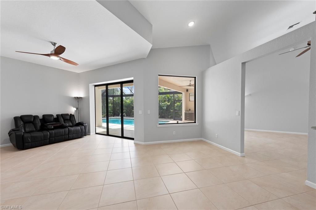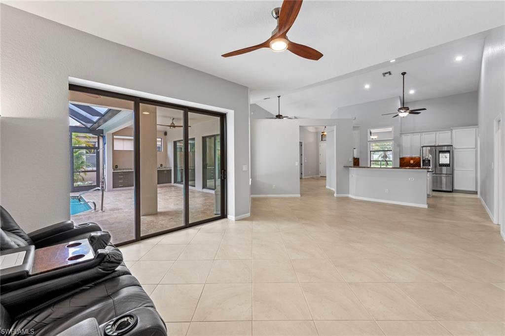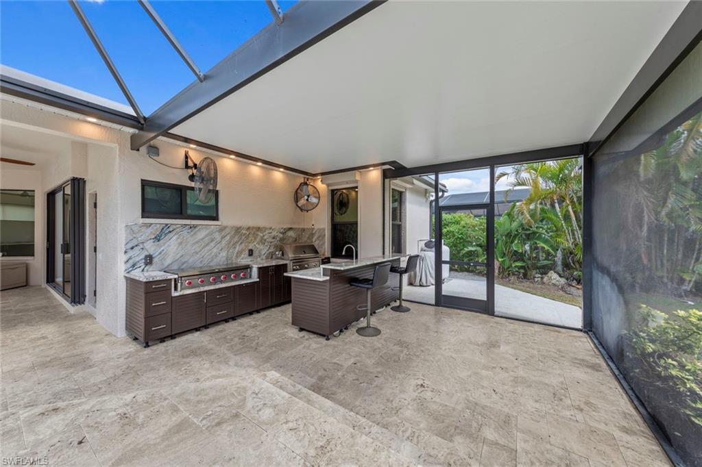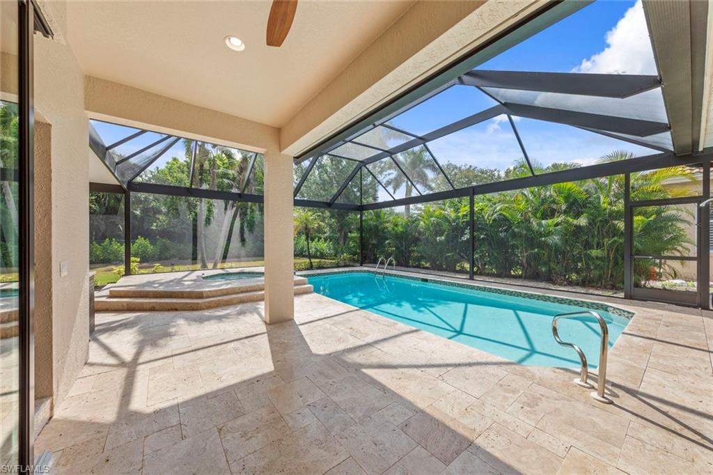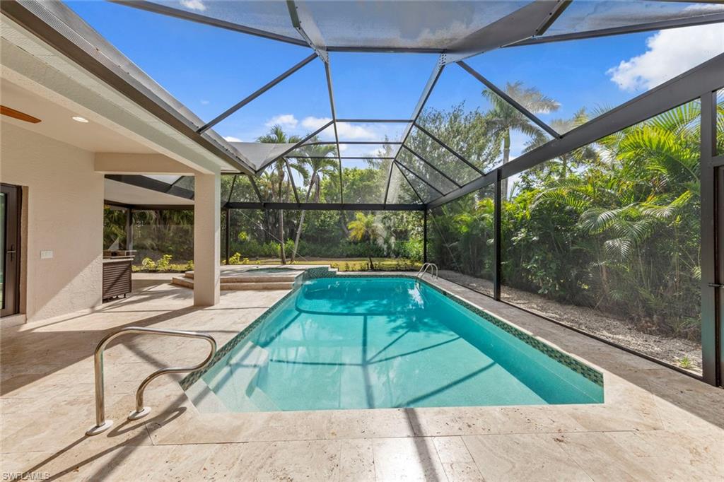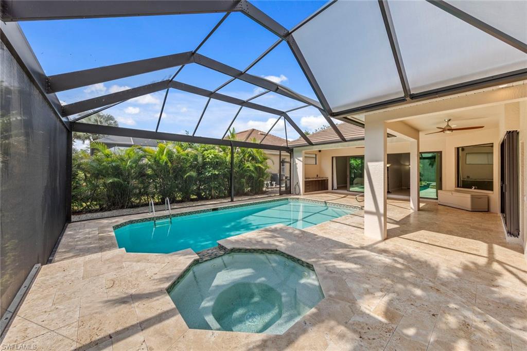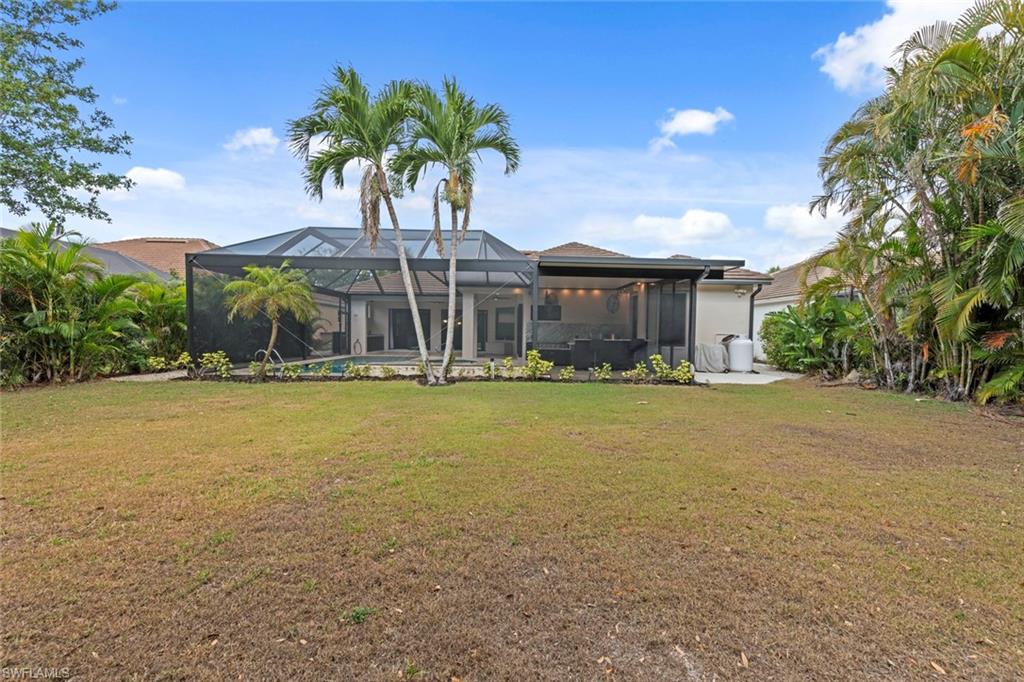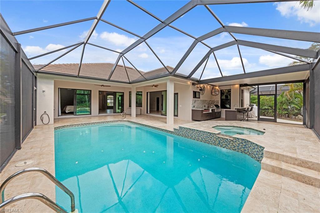 This rarely available Magnolia floor plan offers a flexible layout perfect for a variety of lifestyles. Thoughtfully designed split bedroom home offering four bedrooms and three full baths, family room with breakfast nook, over-sized living room and separate dining room. Whether you're working from home, growing your family, or looking for space to enjoy hobbies, this home checks all the boxes.. The true standout feature of this home is the newly remodeled outdoor retreat and grill lover’s dream kitchen. All new travertine decking, new extended cage are with insulated roof over a fully equipped outdoor kitchen—complete with a flat top grill, dishwasher, cabinetry, and more. Saltwater pool remodeled in 2021 with beautiful resurfacing and coping, app-operated Jandy system. Just beyond this amazing lanai is an abundance of private green space ideal for play or planting! More major updgrades: roof (2019), hurricane impact windows/sliders(2024), AC(2022), more to see on upgrade sheet. Autumn Woods offers a gated community with a clubhouse, fitness center, pool, pickleball, tennis, basketball, playground, and more—all in a prime location near top schools, Gulf beaches, and shopping/dining at Mercato and Waterside Shops.