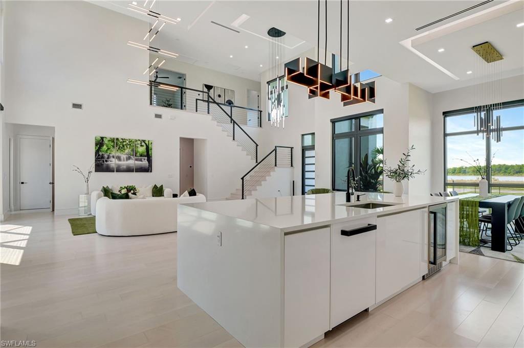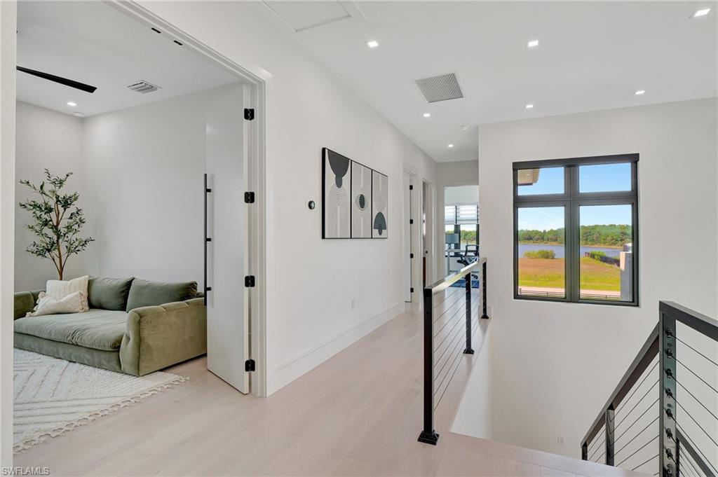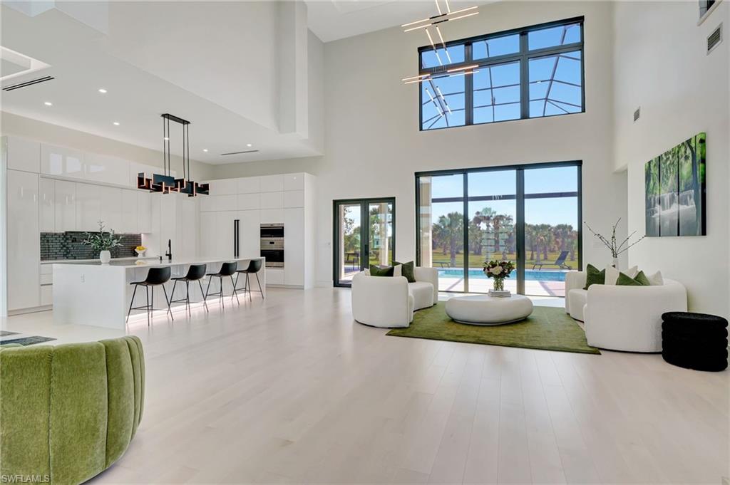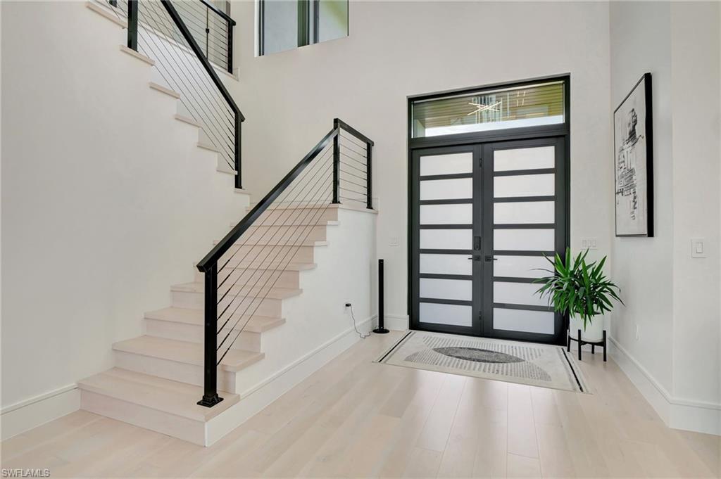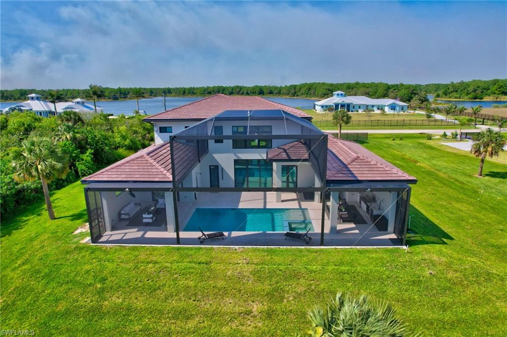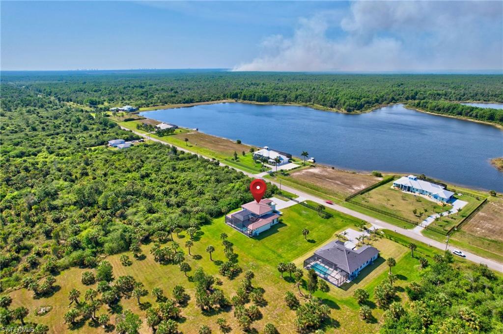 One of a kind custom design and build, on 2.27 Acres cleared, with beautiful palm trees lining the yard. No HOA Oversized master suite on ground floor and balcony overlooking pristine 160 acre lake. Corner office overlooking lake and yard. SUB ZERO APPLIANCES, hardwood floors, solid interior doors, impact resistant doors, windows, remote control black out shades. Located on the most beautiful and serene street in the Naples Estates. Butler pantry with 2nd refrigerator. 3 Bedrooms, Loft/TV room, Corner office, 3 full bathrooms and one ½ bath with access to pool. 22 ft high ceilings in the living and family room, 12 ft ceiling kitchen, 10ft ceilings throughout the rest of the house. Full outdoor kitchen with oven, dishwasher, grill, side burner and sink. Truly a unique peaceful corner of tropical paradise. Crew Bird Rookery Swamp Trails with 11 miles of nature trails is located at the end of Shady Hollow Blvd W, and Audubon Corkscrew Swamp Sanctuary with over 200 bird species located 2 miles away. Big Corkscrew Island Regional Park with pickle ball courts, tennis, basketball, soccer fields and an aquatic center is less than 2 miles away. Publix, CVS, dental clinic, and the Randal Curve development with car wash, health clinic, etc. are all within a 5 minute drive.