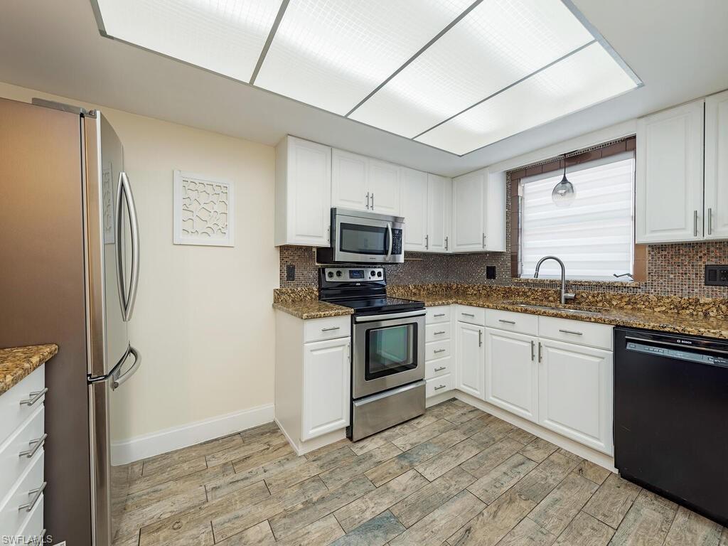 This stunning move-in ready upstairs condo is guaranteed to exceed expectations with its professional upgrades and impeccable style. Owned and renovated by a professional interior designer, every inch of this home has been thoughtfully curated for comfort, functionality, and elegance. Step inside to find a beautifully remodeled kitchen featuring stylish granite countertops, a convenient breakfast bar, new Samsung appliances, and an ultra-quiet Bosch dishwasher—a dream setup for any home chef. The open-concept dining area is enhanced by a tray ceiling, faux fireplace, and a built-in wine fridge, creating the perfect space for entertaining. Throughout the home, you’ll find sleek, wood-look tile flooring, offering both durability and contemporary appeal. The primary suite is a true retreat, boasting a spacious walk-in closet, an entire wall of additional storage cabinetry, and a fully remodeled bath with custom tile work, new vanity, comfort-height toilet, and upscale fixtures. The second bedroom, currently used as a home office, includes custom-built closet cabinets, while the second bathroom has also been stylishly updated with a new vanity, faucet, and comfort-height toilet. Enjoy peaceful mornings or evening breezes from the custom-designed lanai, complete with built-in planters and a cozy sitting area. A private one-car garage is located just downstairs for your convenience. Located in a well-maintained community offering a pool, clubhouse, and tennis courts, and just minutes from vibrant downtown Naples and the area's world-famous beaches, this condo blends luxury, lifestyle, and location into one irresistible package.