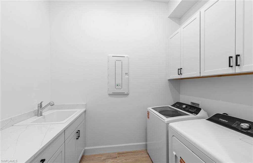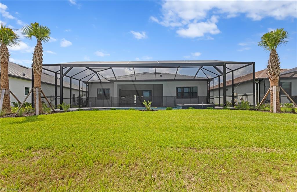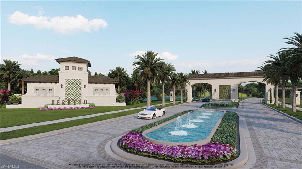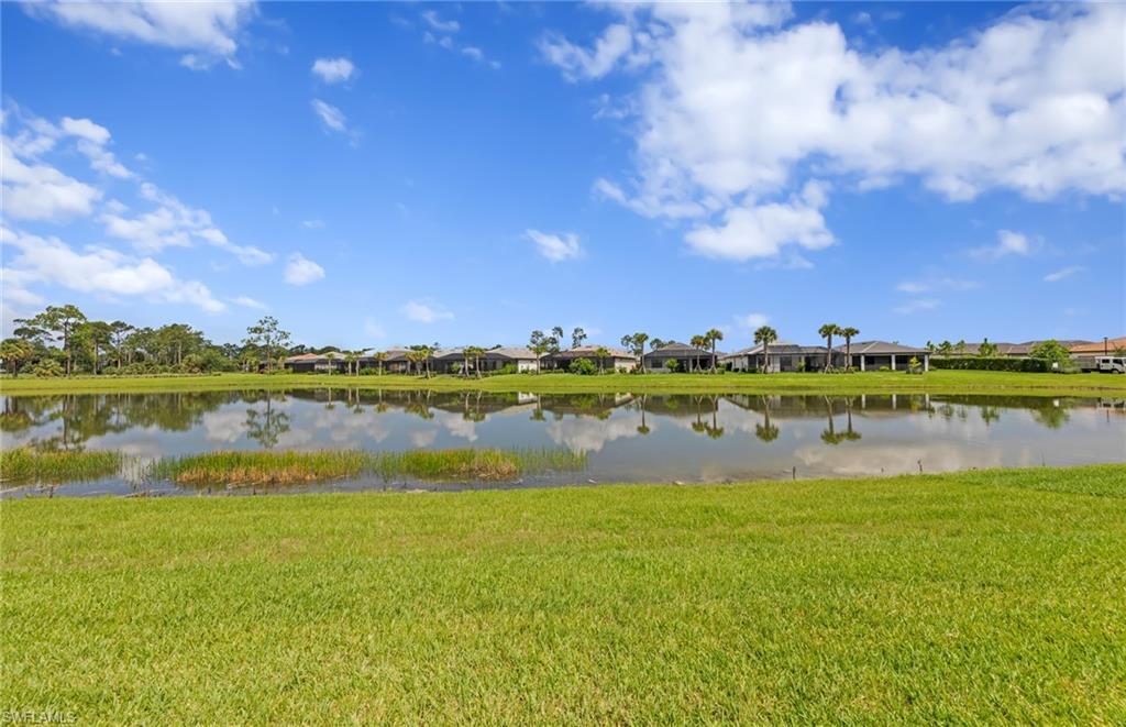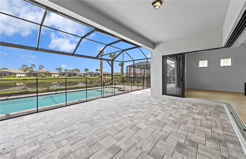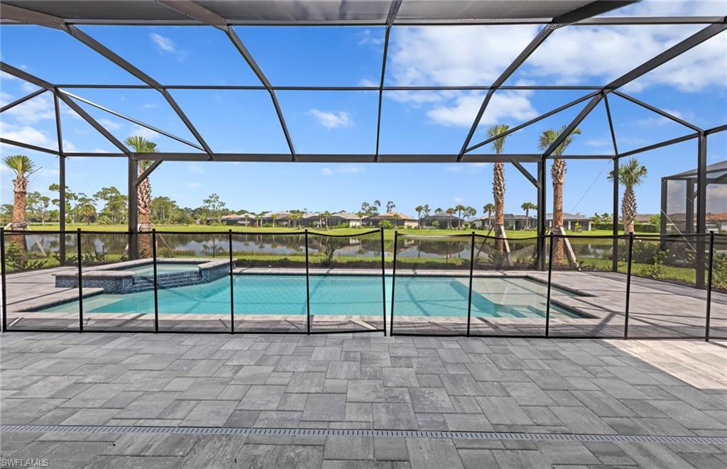 New construction Stellar plan with water views - AVAILABLE NOW! This Stellar pool & spa home features white cabinetry with matte black pulls and high end quartz countertops, impact windows, 10' zero corner sliding glass door (impact), built in kitchen appliances, beautiful wood look tile floors throughout, extended covered lanai with outdoor kitchen prep, 4' garage extension with epoxy finish, & so much more! Terreno by DiVosta is a gated community offering a resort lifestyle with open floor plans, gourmet kitchens, and large outdoor living spaces. For those looking for resort lifestyle communities with private amenities and modern houses, or luxury homes for sale in Naples, FL, Terreno should be your top choice. Neighborhood features include 15,000 sq. ft. grand clubhouse with large community room for events, catering kitchen, state-of-the-art fitness center, exercise studio, 8 pickleball courts, 2 tennis courts, dog park, playground, firepit lounge, dog park, resort style pool, lap lanes, heated spa, full-service restaurant bar & grill, food truck drive-up, 18-hole public golf-course next door & more!