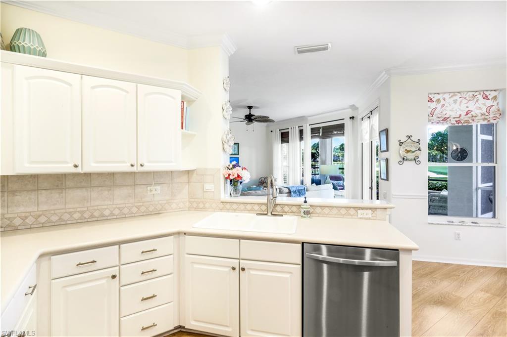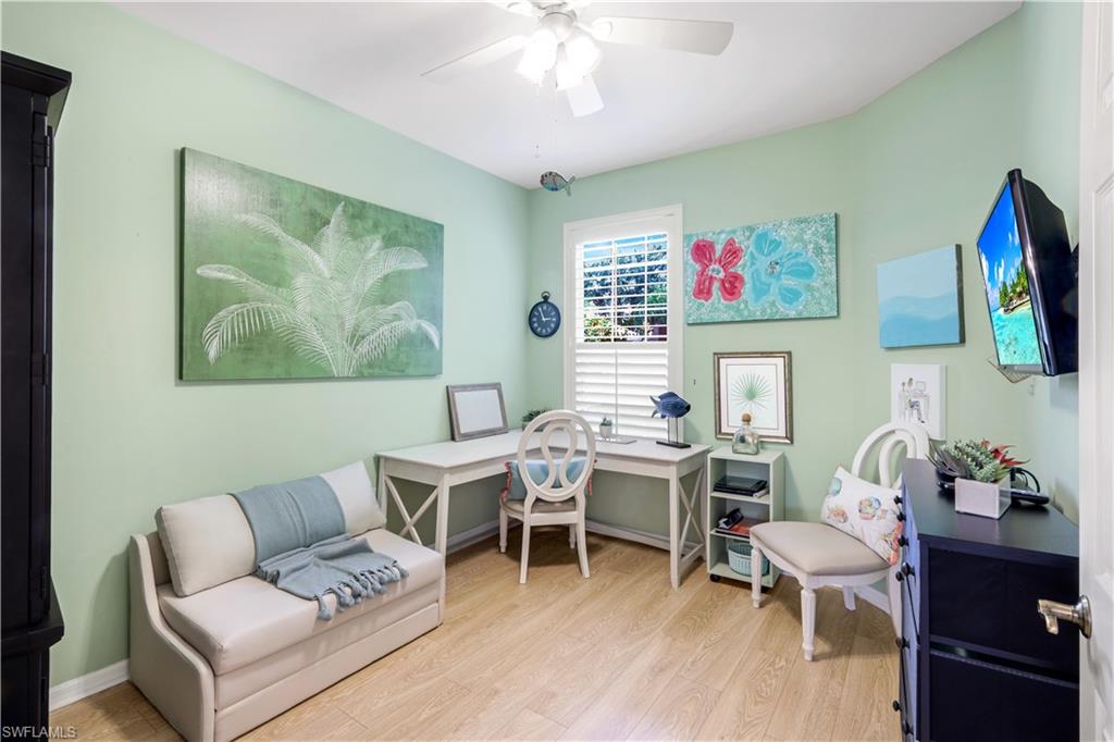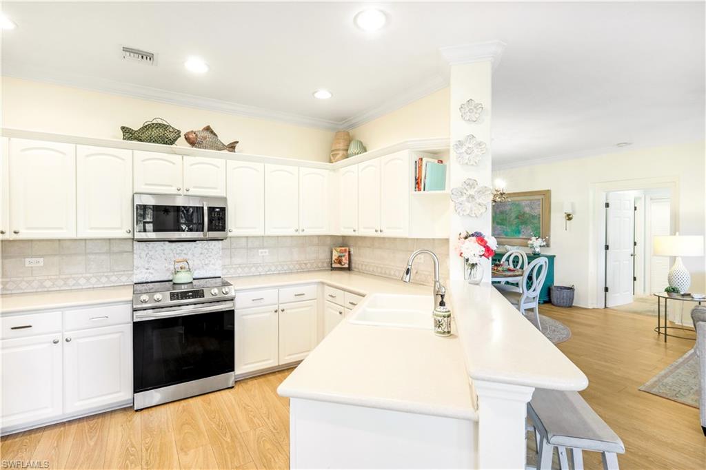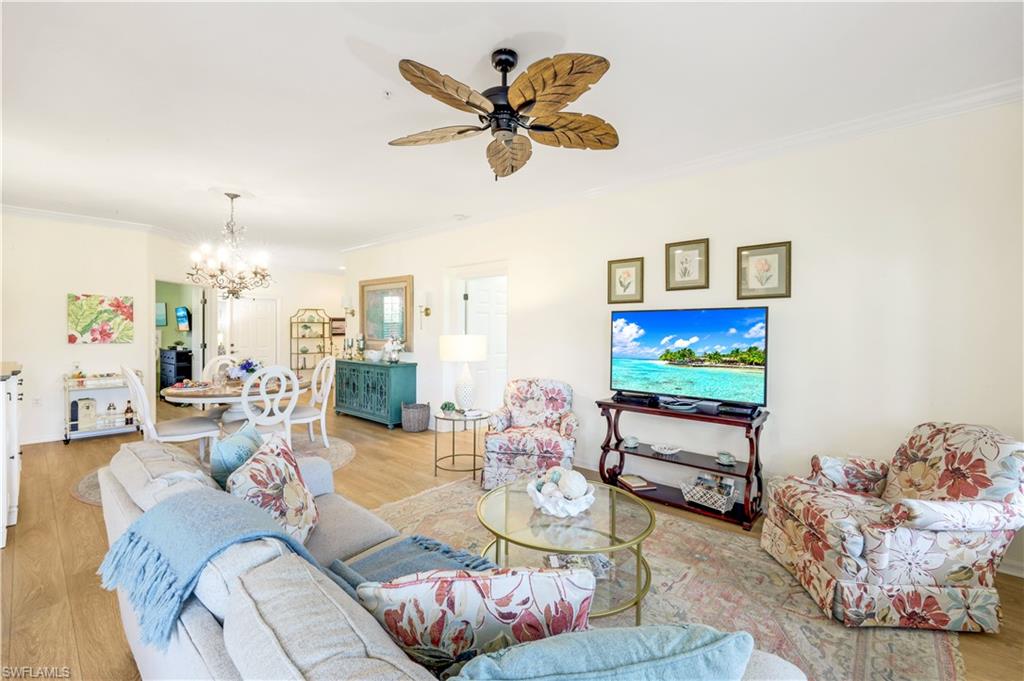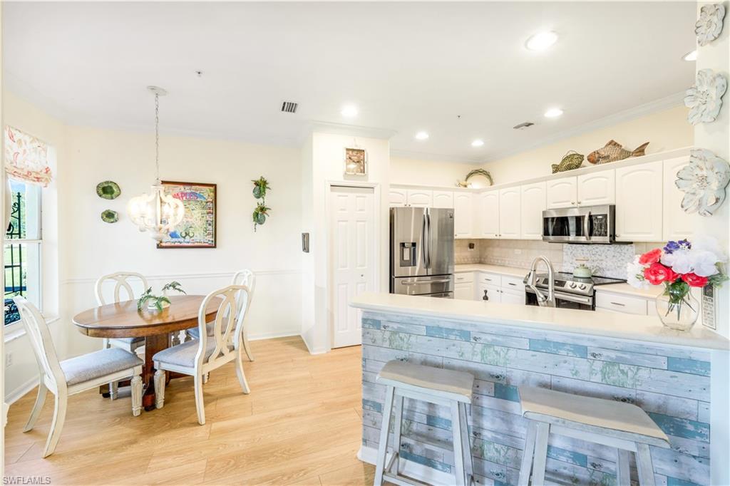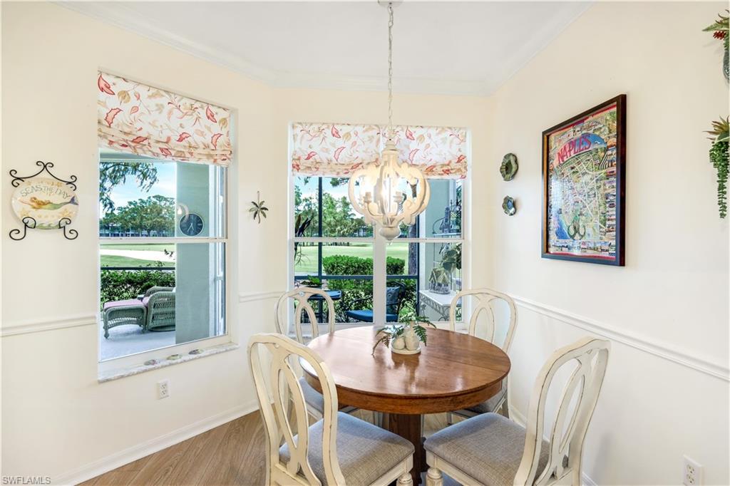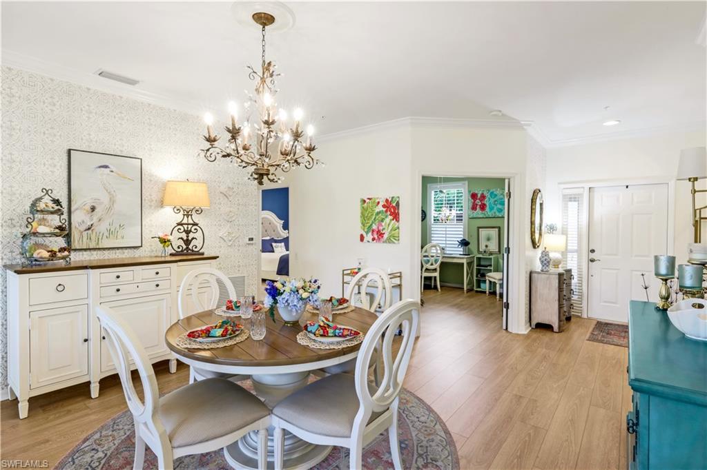 Location. Location. Location! Naples has once again been named the #1 place to retire in the U.S. by U.S. News & World Report, and this turnkey 2BR + Den carriage home with garage offers the perfect opportunity to enjoy everything this vibrant community has to offer. Ideally situated in Vanderbilt CC, an inland gated 18 hole bundled par 72 golf community, this home boasts expansive views of the 16th fairway and lake. Start your day with coffee and a sunrise on the oversized, northern facing lanai—a tranquil retreat with double-door access from the bright, open-concept living area. Screened in entry allows for breezes that flow through out the home. Perfect for entertaining, the home features crown molding throughout, neutral finishes, tile and luxury vinyl flooring, and a smart split-bedroom floor plan for ultimate privacy. The primary bedroom has en-suite bathroom, access to the lanai, a walk in closet and beautiful views of the golf course. There is an oversized bedroom perfect for guests. The den is equipped with a pull-out single bed/couch which makes a great home office or additional guest space. Newer washer and dryer is also included. The eat-in kitchen has new stainless steel appliances, a tiled backsplash and is both stylish and functional. The home comes with a Home Tech home warranty! Live the resort lifestyle with amenities including: • A stunning clubhouse with dining options • A resort-style pool + satellite pools • Har-Tru tennis courts, bocce, and full-time tennis & golf pros • A standalone fitness center with massage therapy, PT services, and organized classes Once you arrive—you may never leave.