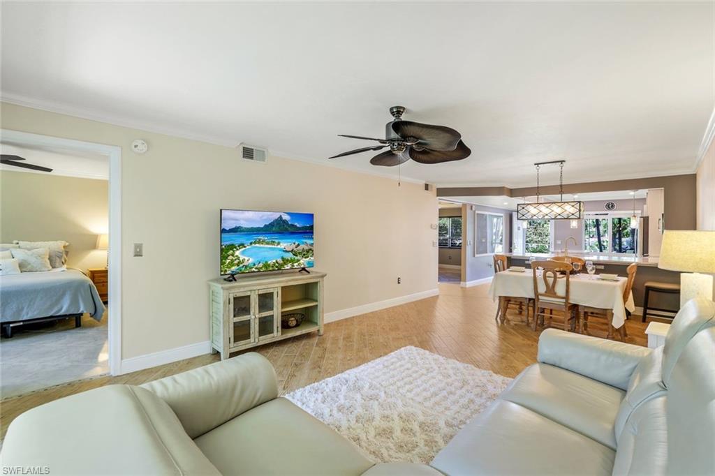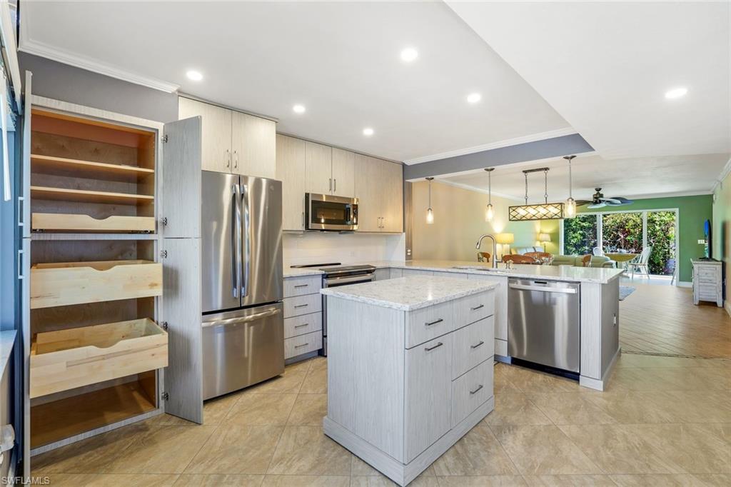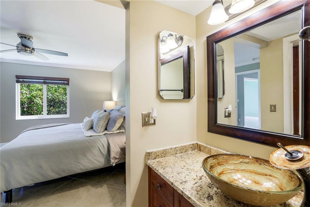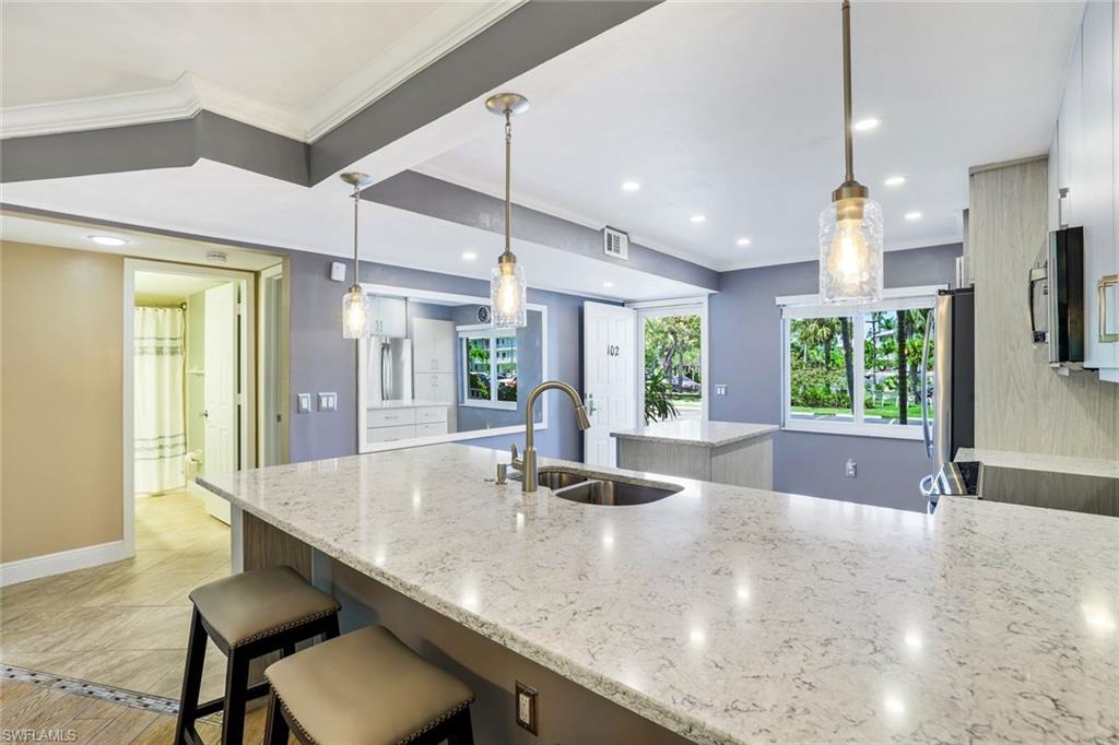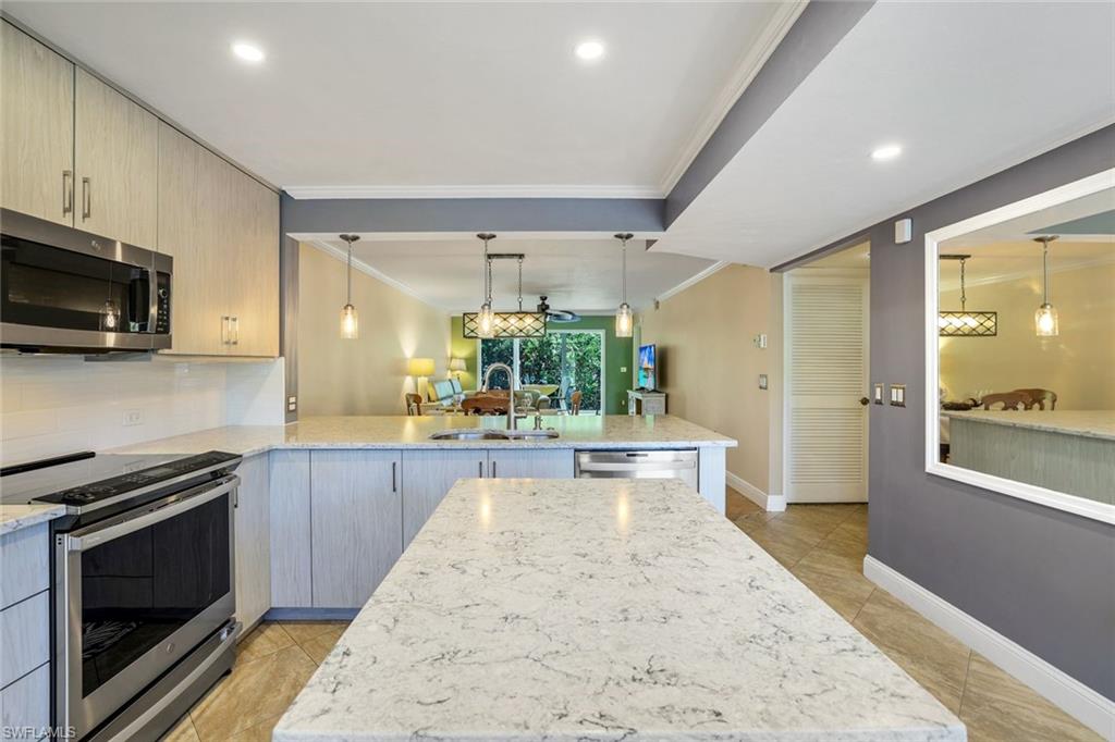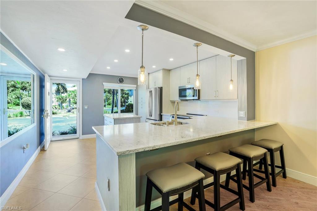 SIGNIFICANT PRICE REDUCTION - BRING OFFERS. Desirable UPDATED unit, Partially Furnished and Move-In Ready Condo in the heart of Naples at Sandpiper Bay with BOAT DOCKS (docks available for lease or purchase). No storm water intrusion and quiet location (no community pool noise). The ideal home you've been searching for has arrived with all projects recently completed including the glass enclosed lanai for expanded living space under AC. Owner has invested $100K + in beautiful updates for you to enjoy including NEW High-Impact Sliders & Windows, NEW fully remodeled Kitchen with Stainless Appliances, Quartz Countertops & Island and NEW Wood Cabinetry as well as a NEW Washer/Dryer--see attached FEATURES & UPDATES for complete list. This 2-Bedroom condo checks all the boxes and is Pet friendly. Located five minutes from prestigious Downtown Fifth Avenue for five-star dining/shopping and our award-winning beautiful beaches. Nearby Naples Botanical Gardens, the Naples Pickleball Center (national tournaments with 65 courts), Naples Community Hospital (named as One of America’s 50 Best Hospitals for 2025 by Healthgrades), the new Gulfshore Playhouse, and Baker Park with the Greenway Walking/Biking Path along the Gordon River are all less than five minutes away. This home is the perfect blend of style and comfort with clean/fresh finishes and a split-bedroom floor plan for guest privacy. Abundant natural sunlight brightens your unit throughout the day. Updated primary bedroom with King Dual Adjustable Bed (Elevate & Massage functions), primary bath with a spacious walk-in shower, and a customized walk-in closet with shelving. Enjoy your morning coffee with a scenic natural view of the mangroves or easy lanai access to your backyard area to walk your pet. This recently updated, gently lived-in, and meticulously cared-for condo is truly a hidden gem in the heart of Naples, Florida. Don’t miss this opportunity—schedule your showing today or visit an Open House! See tour links for a video walkthrough experience. DRY BUILDING, No storm water or damage in unit. New Roofs 2018, Upgraded Elevators 2024, Fresh Exterior paint 2025.