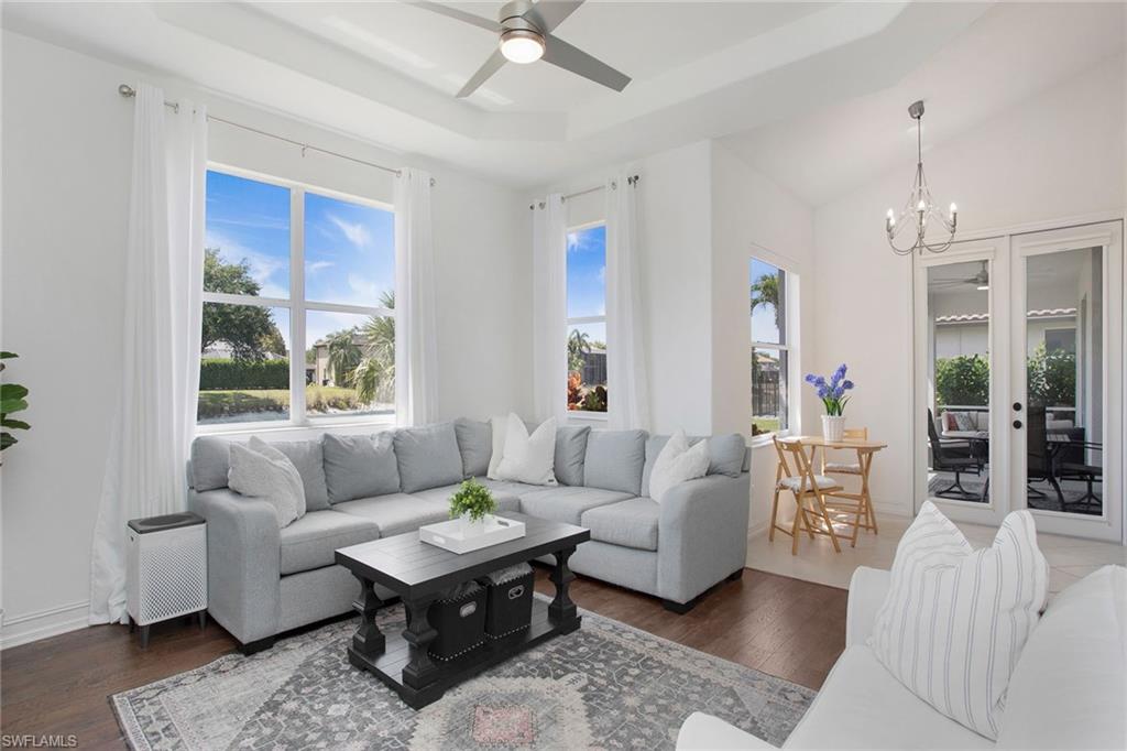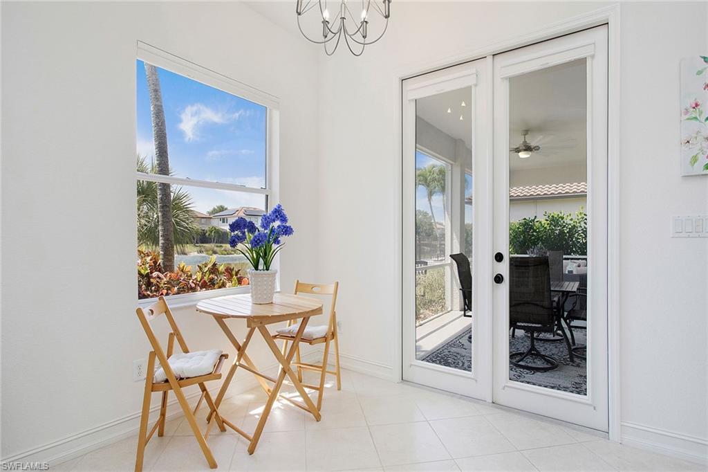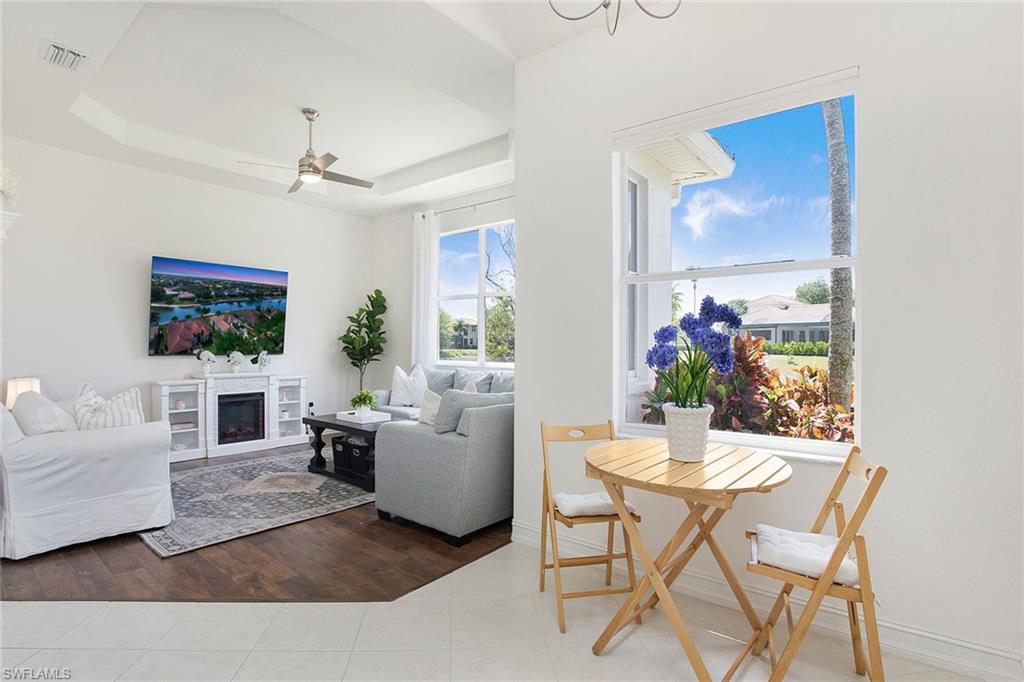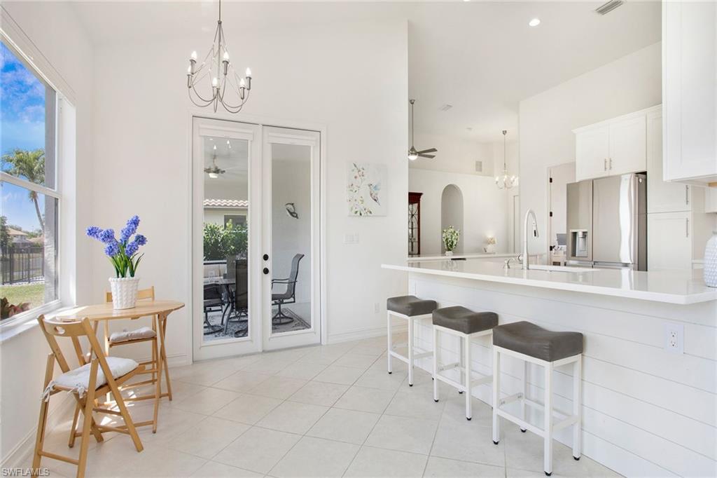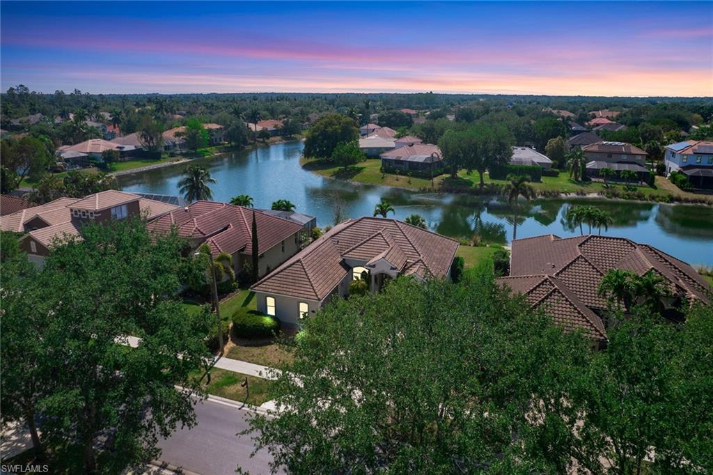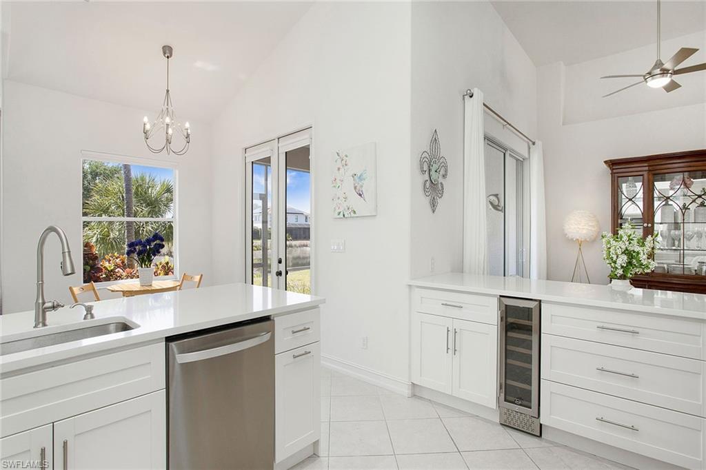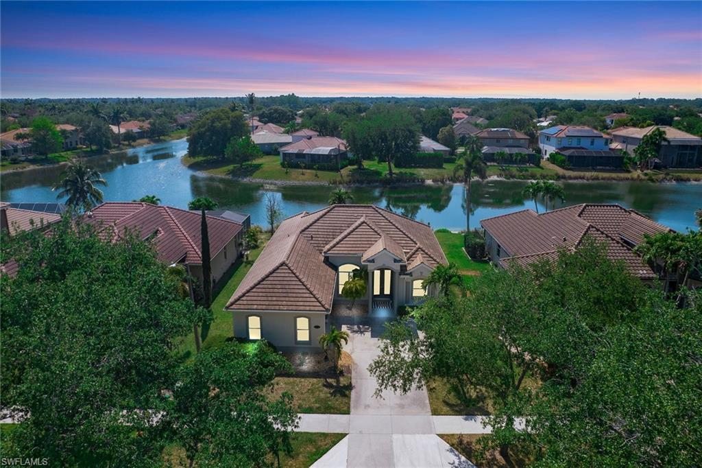 Welcome to this beautifully updated three-bedroom plus den, two-bath home positioned on a lakefront lot, offering stunning water views and breathtaking sunsets from nearly every room. Inside, you'll find a bright and airy open layout designed for everyday living and effortless entertaining. High-end finishes, custom blinds, and designer lighting add warmth and sophistication throughout. The chef-inspired kitchen features crisp white cabinetry, quartz countertops, stainless steel appliances and a built-in wine cooler, perfect for casual meals or hosting friends and family. The spacious great room flows seamlessly into a cozy breakfast nook and showcases a sleek LED fireplace, creating an inviting space to unwind or gather. The private primary suite is a peaceful retreat with a tray ceiling, a walk-in closet and a spa like en-suite bath with dual vanities. Two additional bedrooms and a flexible den provide plenty of space for guests, a home office or hobbies. Go outside to the screened lanai and enjoy a large, private backyard with serene lake views, ideal for year-round Florida living. An oversized garage offers extra storage space for added convenience. In the gated community of Indigo Lakes, residents enjoy access to resort-style amenities including a clubhouse, pool and spa, fitness center, tennis and pickleball courts, basketball courts and a playground, all with low HOA fees. Just a short distance to Oakridge Middle School and minutes from Founders Square, NCH Healthcare, dining and shopping, this home captures the best of North Naples living.