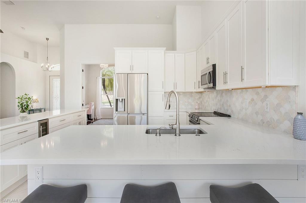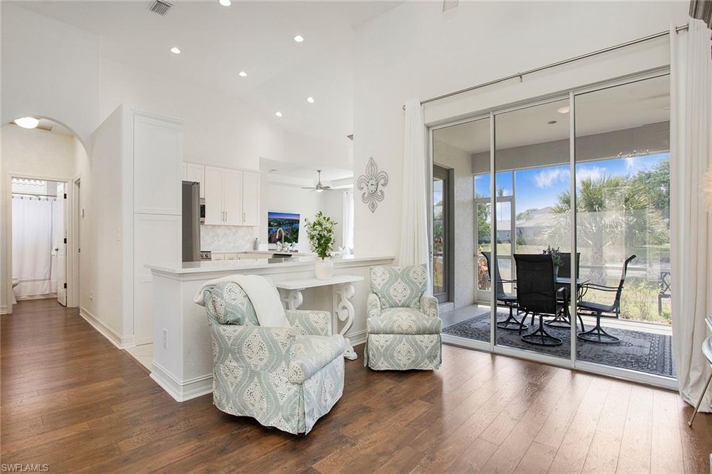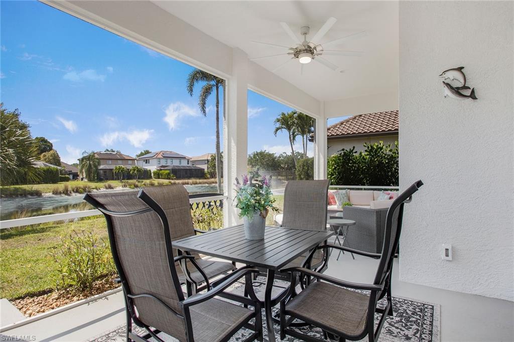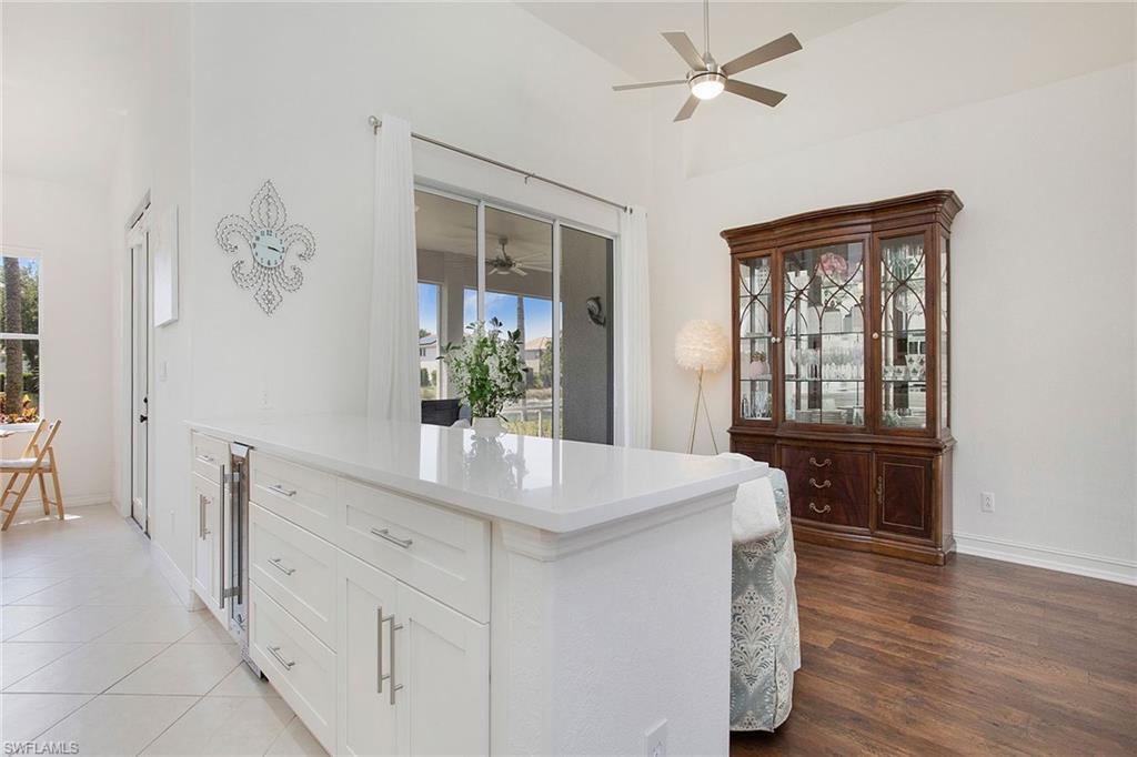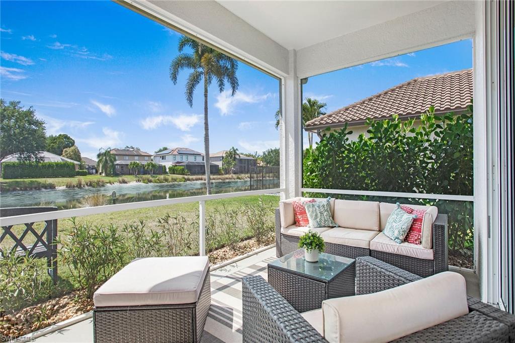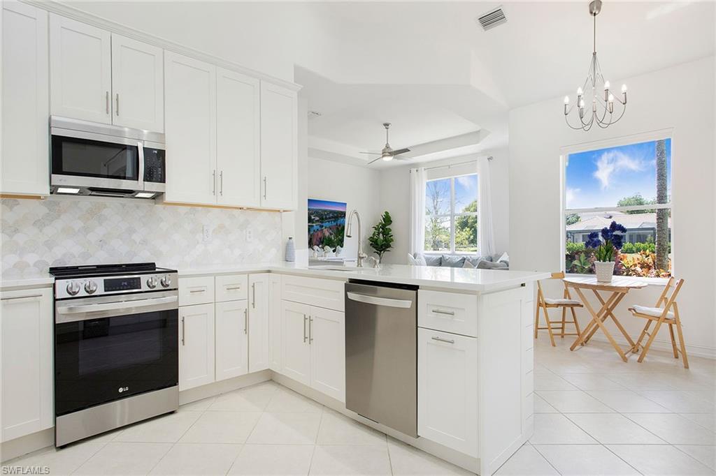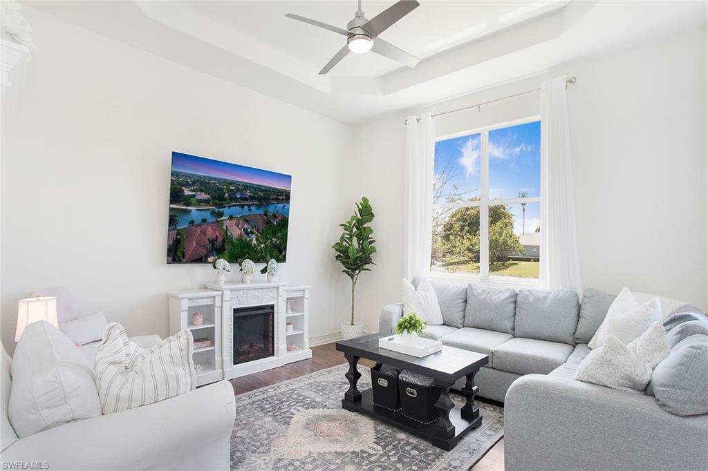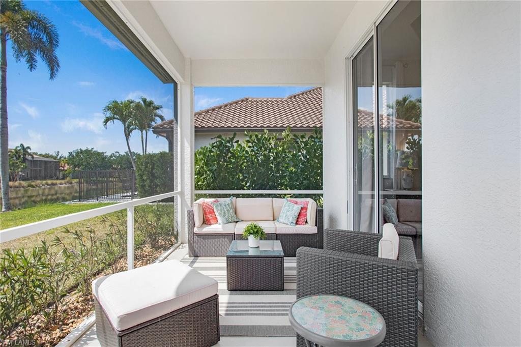 Welcome to this beautifully updated three-bedroom plus den, two-bath home positioned on a lakefront lot, offering stunning water views and breathtaking sunsets from nearly every room. Inside, you'll find a bright and airy open layout designed for everyday living and effortless entertaining. High-end finishes, custom blinds, and designer lighting add warmth and sophistication throughout. The chef-inspired kitchen features crisp white cabinetry, quartz countertops, stainless steel appliances and a built-in wine cooler, perfect for casual meals or hosting friends and family. The spacious great room flows seamlessly into a cozy breakfast nook and showcases a sleek LED fireplace, creating an inviting space to unwind or gather. The private primary suite is a peaceful retreat with a tray ceiling, a walk-in closet and a spa like en-suite bath with dual vanities. Two additional bedrooms and a flexible den provide plenty of space for guests, a home office or hobbies. Go outside to the screened lanai and enjoy a large, private backyard with serene lake views, ideal for year-round Florida living. An oversized garage offers extra storage space for added convenience. In the gated community of Indigo Lakes, residents enjoy access to resort-style amenities including a clubhouse, pool and spa, fitness center, tennis and pickleball courts, basketball courts and a playground, all with low HOA fees. Just a short distance to Oakridge Middle School and minutes from Founders Square, NCH Healthcare, dining and shopping, this home captures the best of North Naples living.