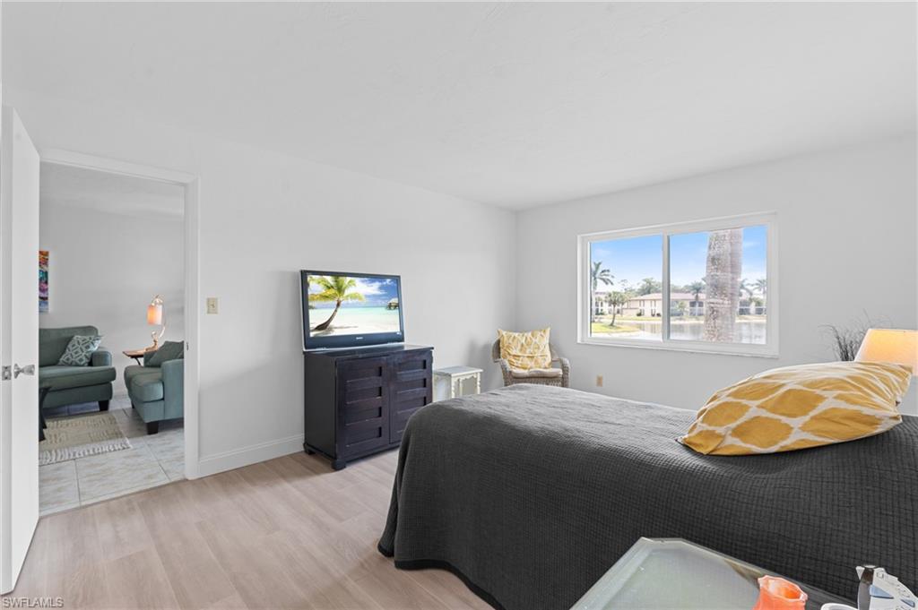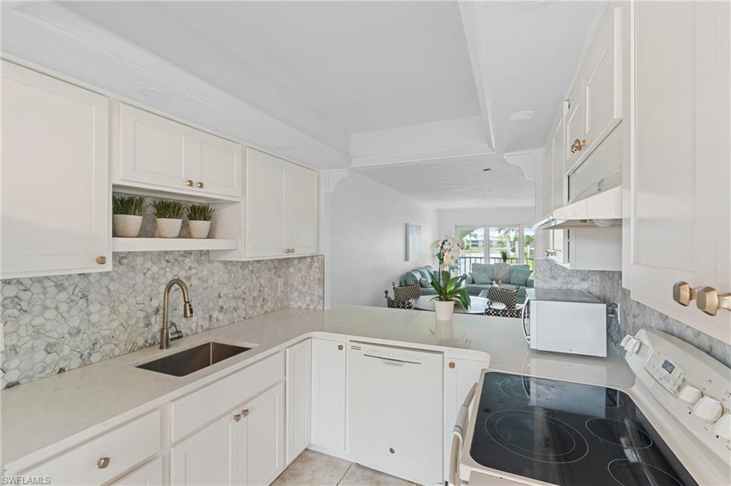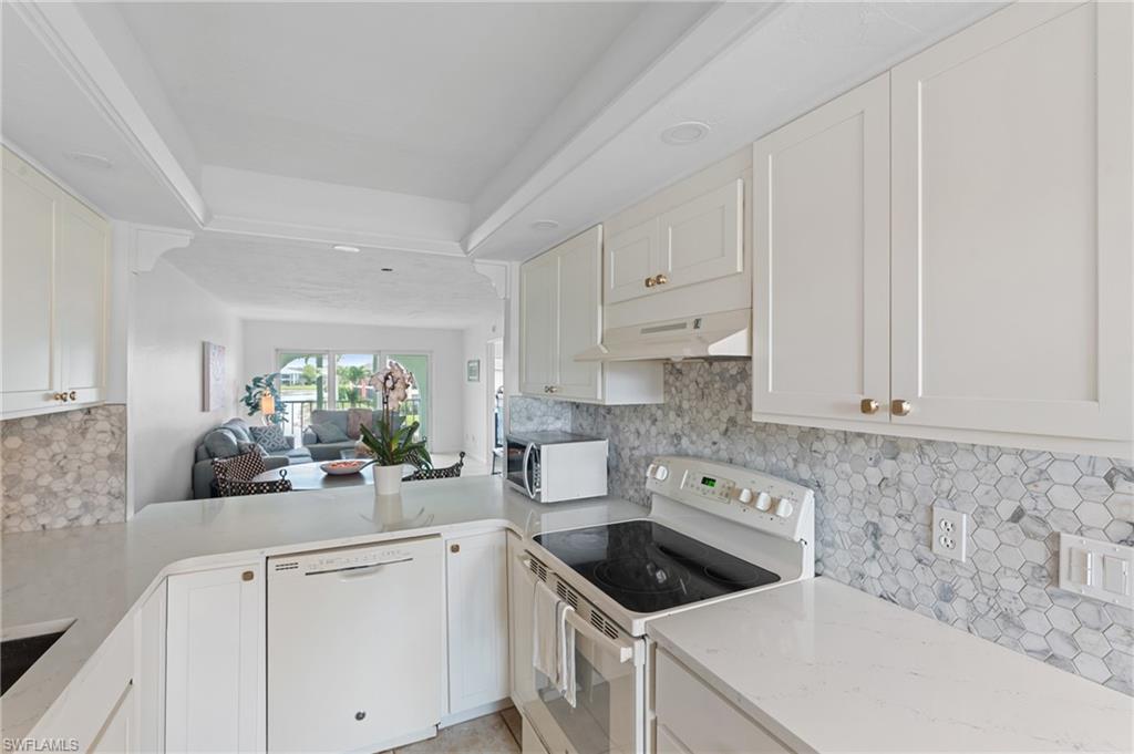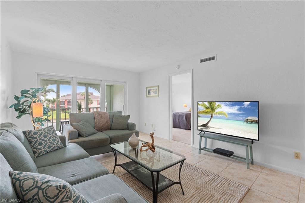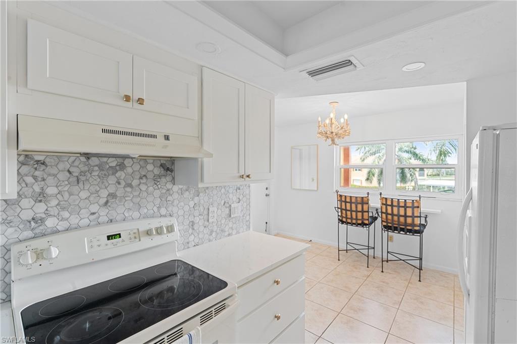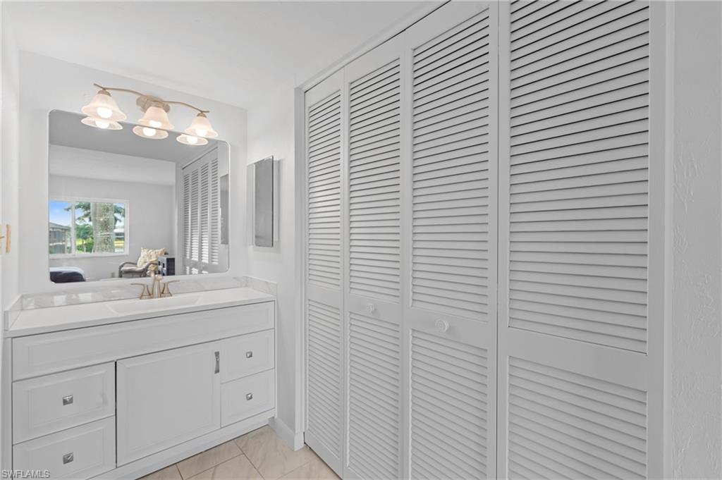 Renovated top to bottom in 2020, this 2 bed, 2 bath condo in The Fountains (55+) feels fresh, comfortable, and completely move-in ready. Inside, you’ll find updated tile and LVP flooring, quartz countertops, cabinetry with brass hardware, a striking stone hex backsplash, and two fully renovated bathrooms. A fresh coat of paint was just added throughout, giving the space a clean, cohesive feel. All windows and doors are impact grade, and the lanai is equipped with pull-down storm shutters — offering full protection and peace of mind during hurricane season. The southwest-facing lanai brings in plenty of natural light from mid-afternoon through sunset, with a lake view that immediately draws your attention as soon as you step into the kitchen and living room. The way the sunlight reflects off the water gives the space a calm, inviting energy that’s hard to beat. This unit is just steps from the community pool and grille area — ideal for easy socializing or a quick dip — and your deeded carport is conveniently located nearby. The Fountains is a well-maintained, active 55+ community with low HOA fees and a laid-back, friendly feel. You're about 15 minutes from Olde Naples, with quick access to luxury shops, great dining, and local favorites like the Naples Pier and Lowdermilk Beach. Golfers will appreciate having public courses like Lely’s Mustang and Flamingo, as well as Hibiscus Golf Club, just around the corner. Whether you’re looking for a seasonal escape or a full-time home, this one makes it easy.