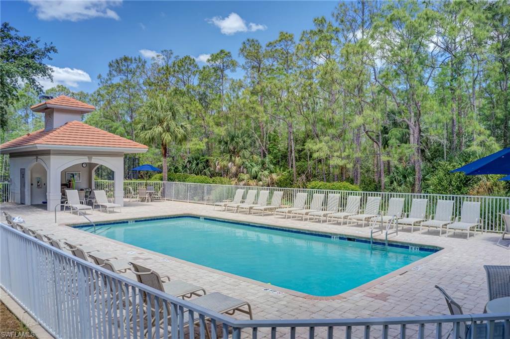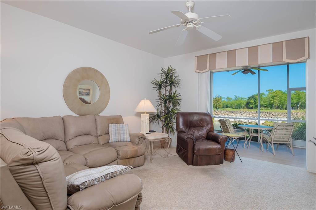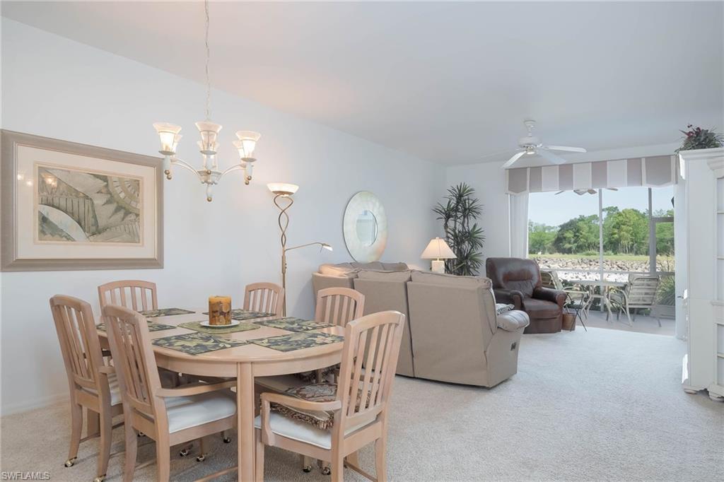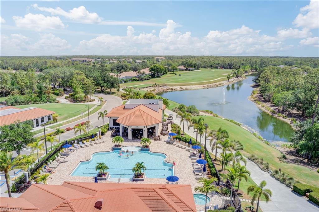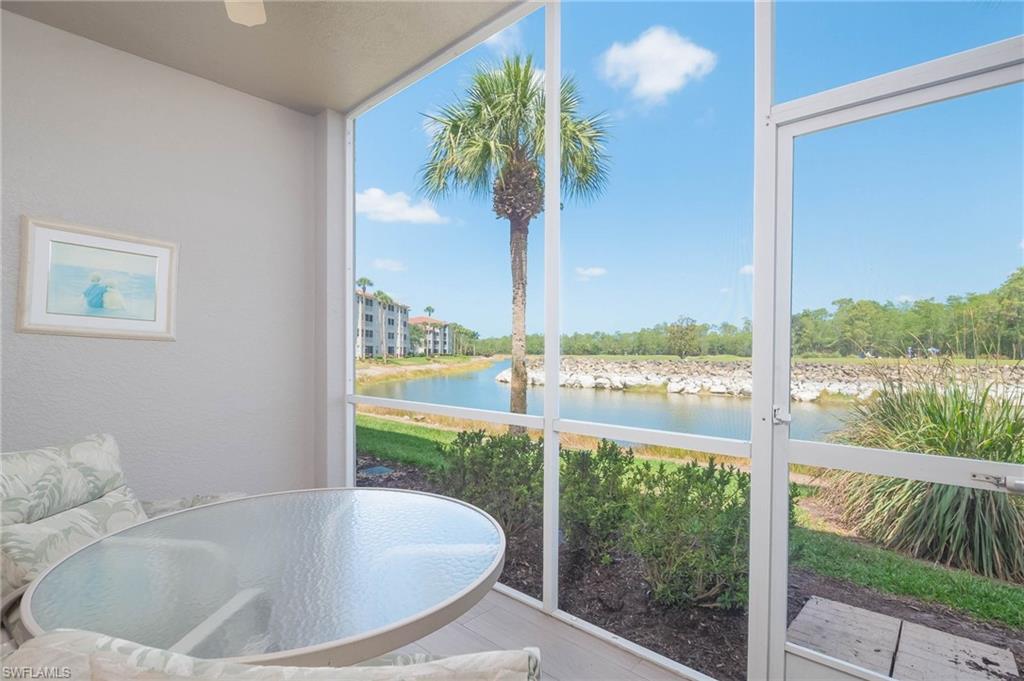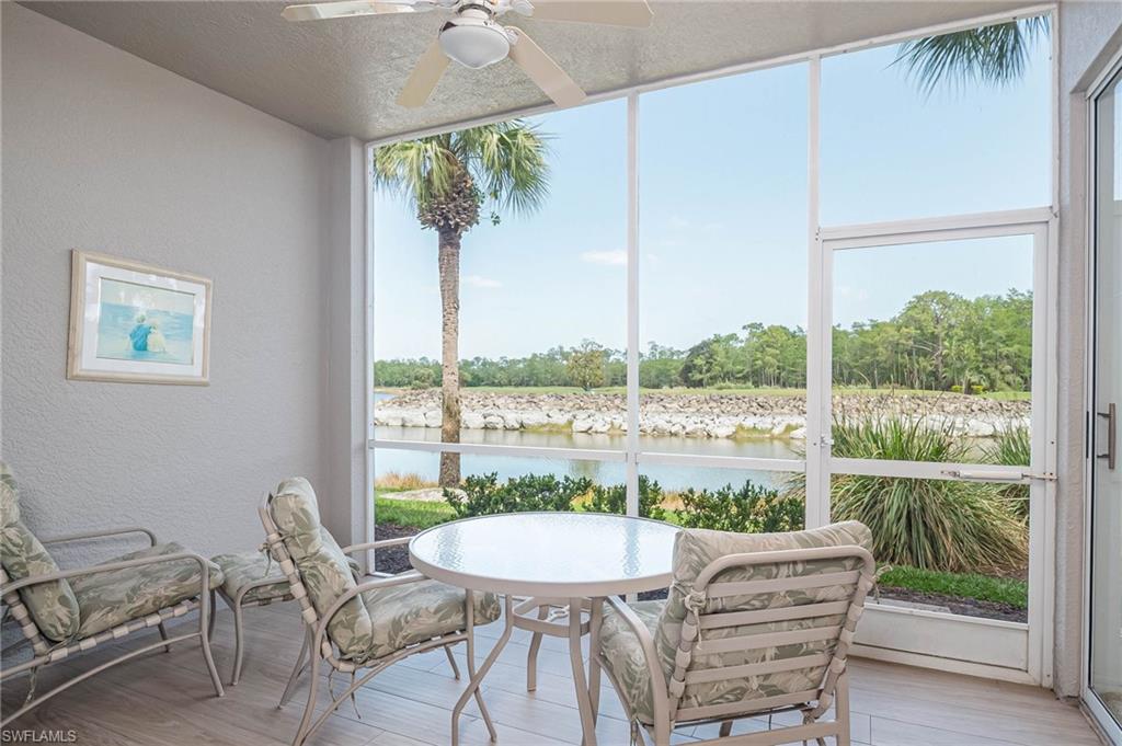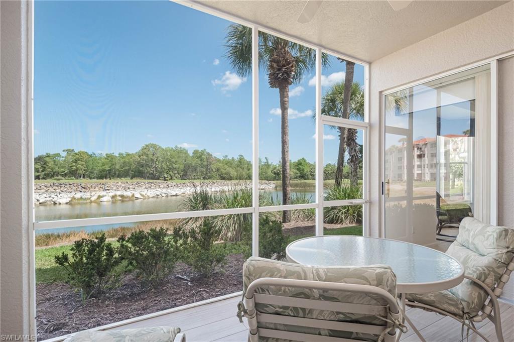 FULL GOLF MEMBERSHIP INCLUDED Rarely available 1ST Floor END UNIT offers 2 BR / 2 BATH PLUS DEN w/ garage offers sweeping unobstructed water, golf and preserve views!! This home has been lovingly cared for by the initial owner and it shows! This property is unique in that it has both a front and rear patio allowing for a remarkable amount of outdoor living space. The kitchen has been updated and includes newer Shaker white cabinetry, granite countertops and lovely stainless steel appliances. The home boasts an open floor plan concept allowing for a very generous living and dining room space. The Den offers double pocket doors for privacy and is ideal as an office or a third bedroom. The primary bedroom is spacious and overlooks the water and golf course. The 2nd full bedroom and bathroom are oversized and can easily host family and friends The master bath has been updated and has two walk-in closets in the private ensuite. The patio has direct water and golf views with no homes blocking this priceless view. Naples Heritage offers and 18 hole bundled golf course, pro shop, putting green & driving range. The community offers a newly renovated clubhouse, restaurant, poolside cabana & bar. There is a wonderful fitness center with tennis, pickle ball and bocce to enjoy year round living or our winter residents. Naples Heritage is centrally located 3 miles from I-75 going to either Miami or Tampa, the new Great Wolf Lodge 2 miles from the community, Florida Sports Park and within 5 miles to the shoppes, restaurants and entertainment of Naples premier shopping destination 5th Avenue. Seed 2 Table is rebuilding on Davis Blvd and the new convention center is 4 miles from Naples Heritage. Welcome Home!