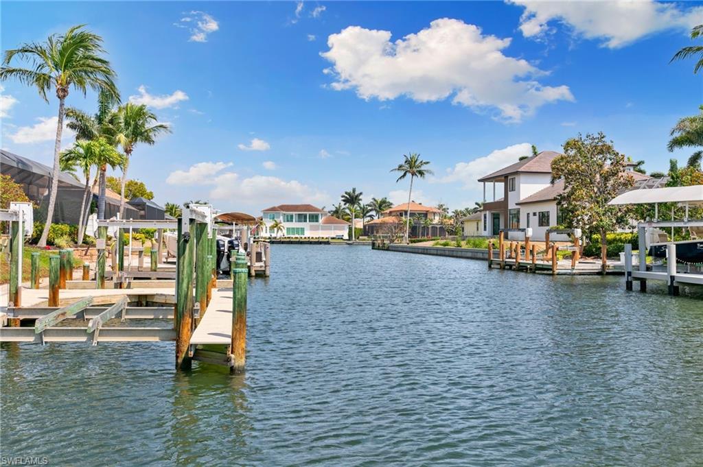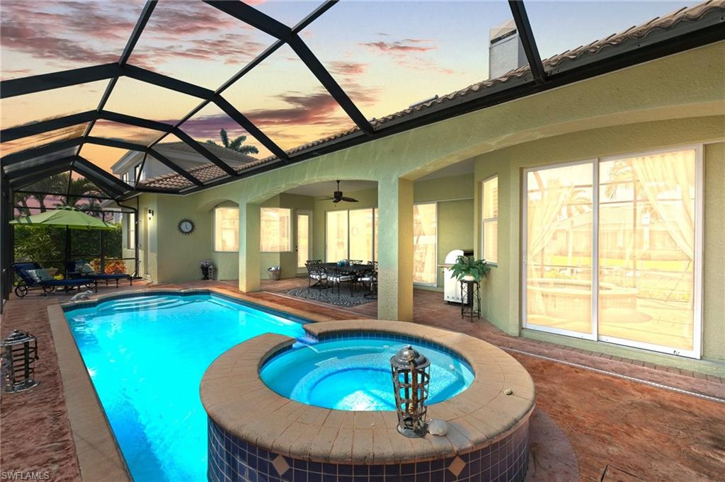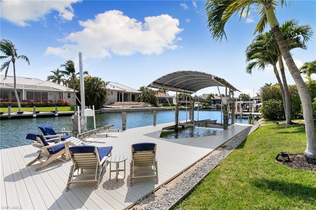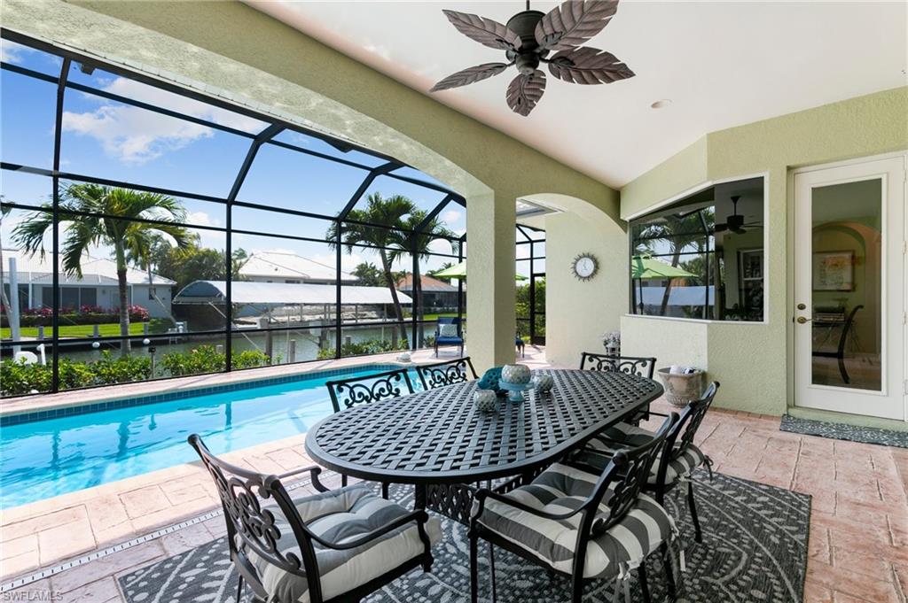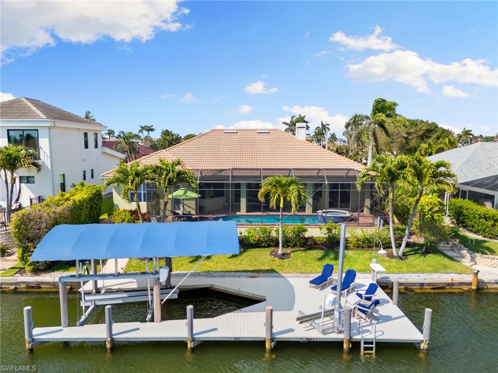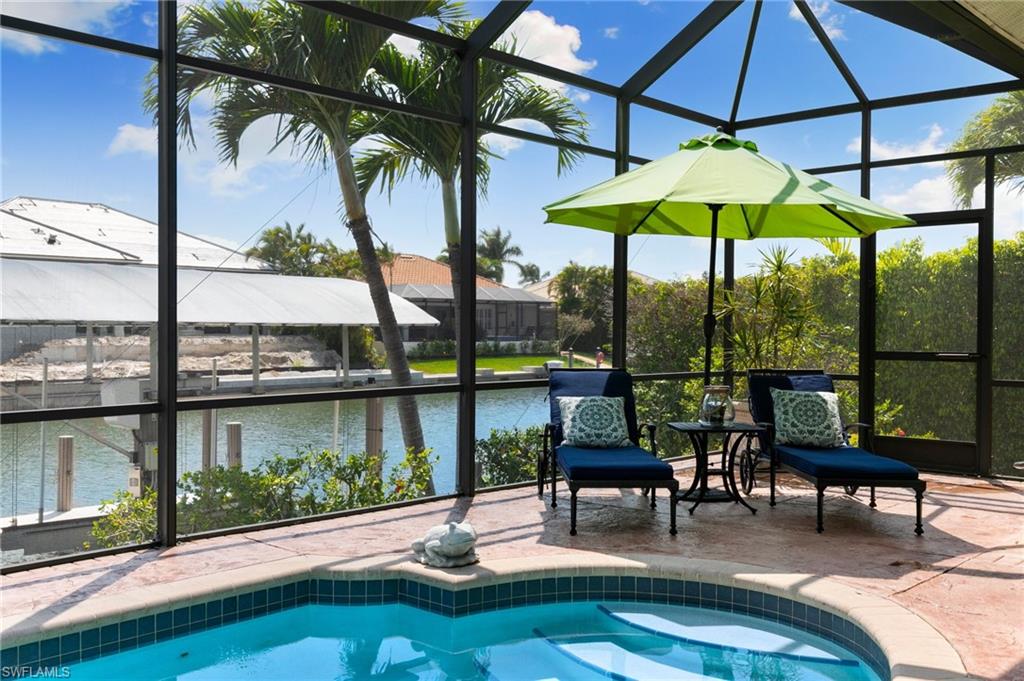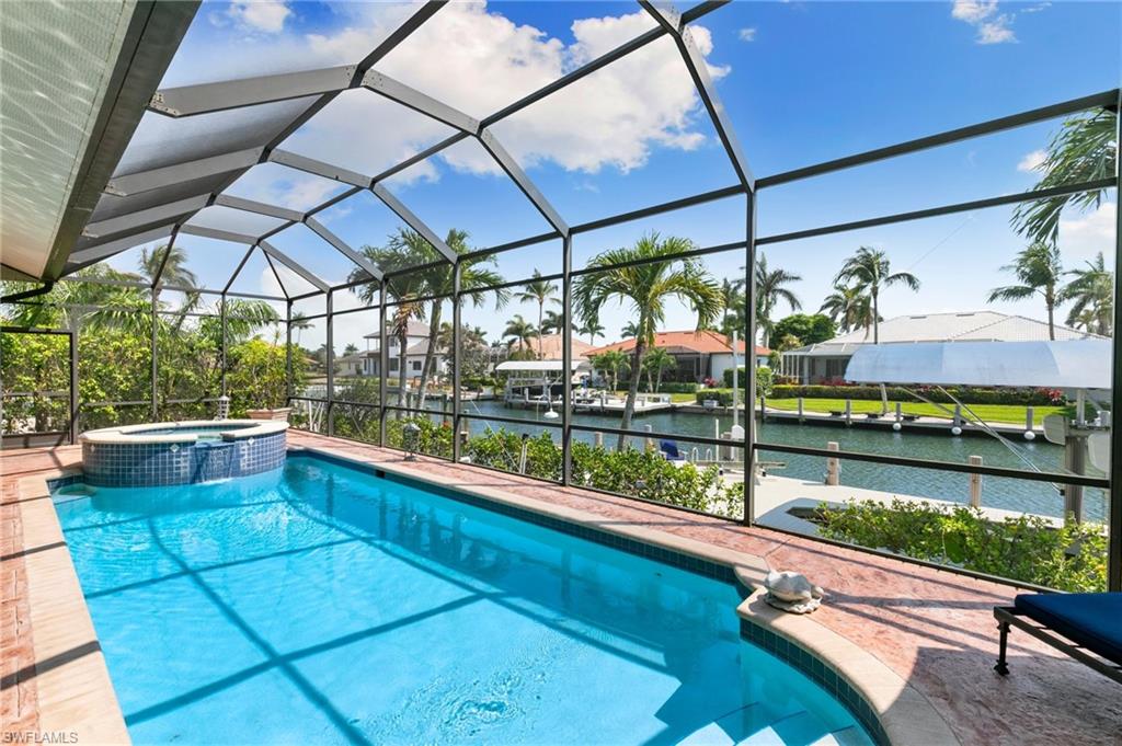 This beautifully designed 3-bedroom + office/den, 2 1/2 bath home offers direct boating access to the Gulf—no bridges, no delays—just moments away from the renowned 10,000 Islands for world-class fishing, boating, and island-hopping adventures. Step inside to find an inviting split-bedroom layout that provides both privacy and flow, enhanced by high coffered ceilings and sunny southern exposure. The spacious kitchen is a chef's delight, featuring a wine cooler, beverage frig, pantry, breakfast bar, and generous counter space—perfect for entertaining or casual family meals. The adjacent dining area boasts a stunning mitered glass window offering sparkling views of the pool and tranquil canal. The primary suite is a retreat, offering access to the pool and a master bath with two enclosed his and hers water closets and a soaking tub. Outdoors, enjoy your personal paradise with a screened-in pool and spillover spa, ideal for soaking in the Florida sun or enjoying cool evenings under the stars. The covered boat dock comes complete with a 12,000lb boat lift, jetski lift, and expansive deck area for lounging, dining, or sunset cocktails. Located in the desirable River area, this home is perfect whether you're a year-round resident or seasonal escapee. This property delivers the ultimate Florida lifestyle plus offers a 1 Year HOME WARRANTY for the new owner's peace of mind.
