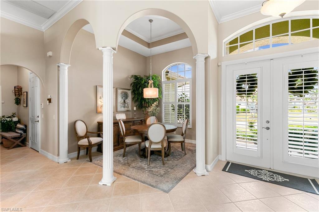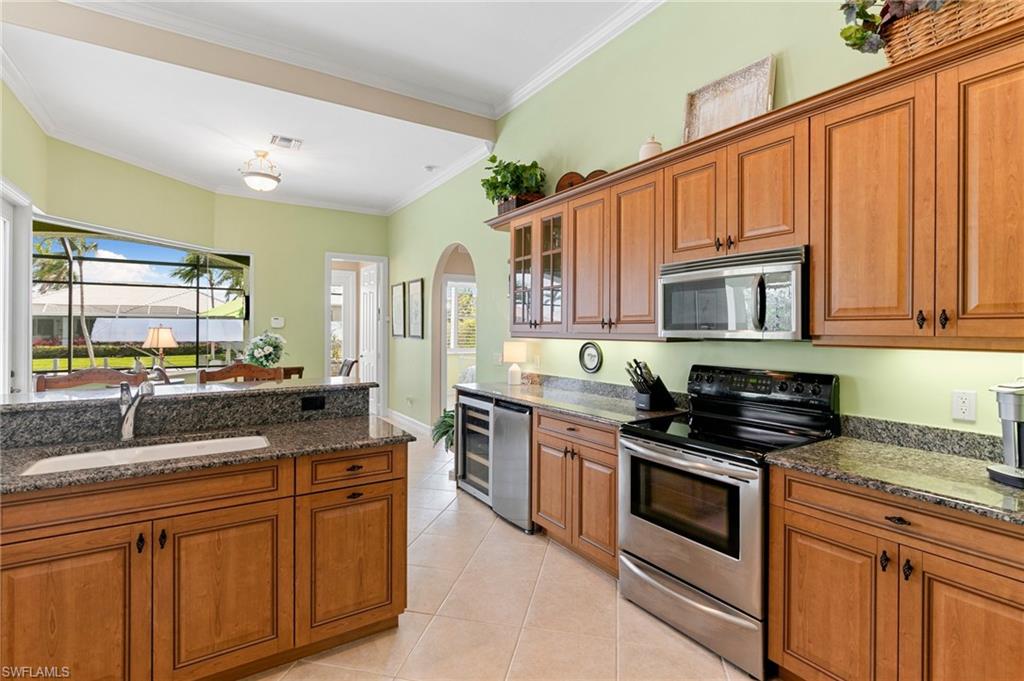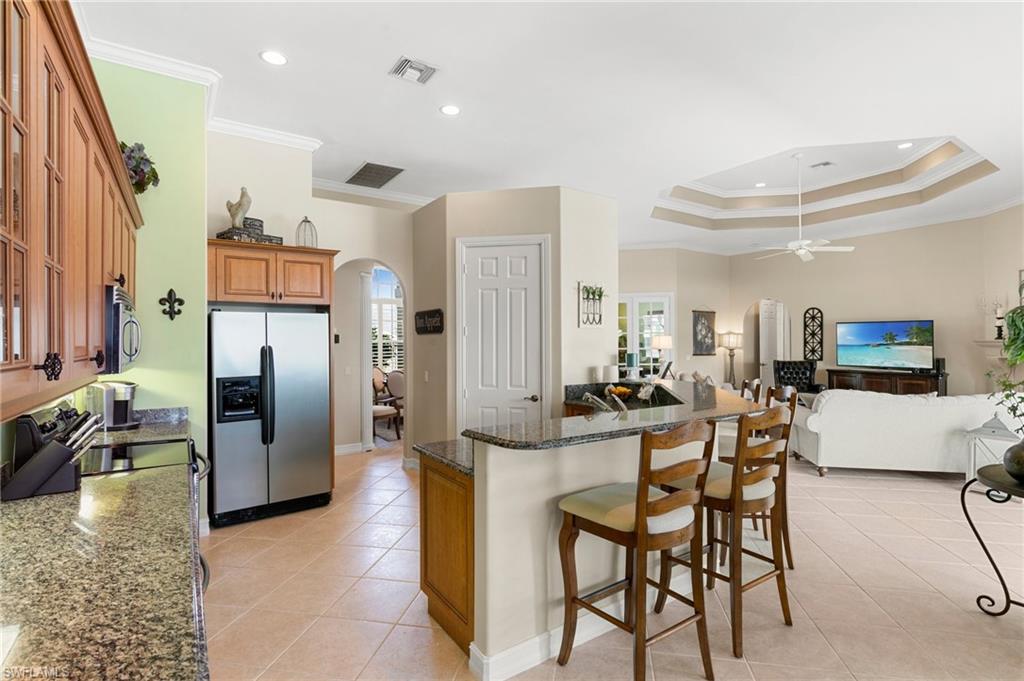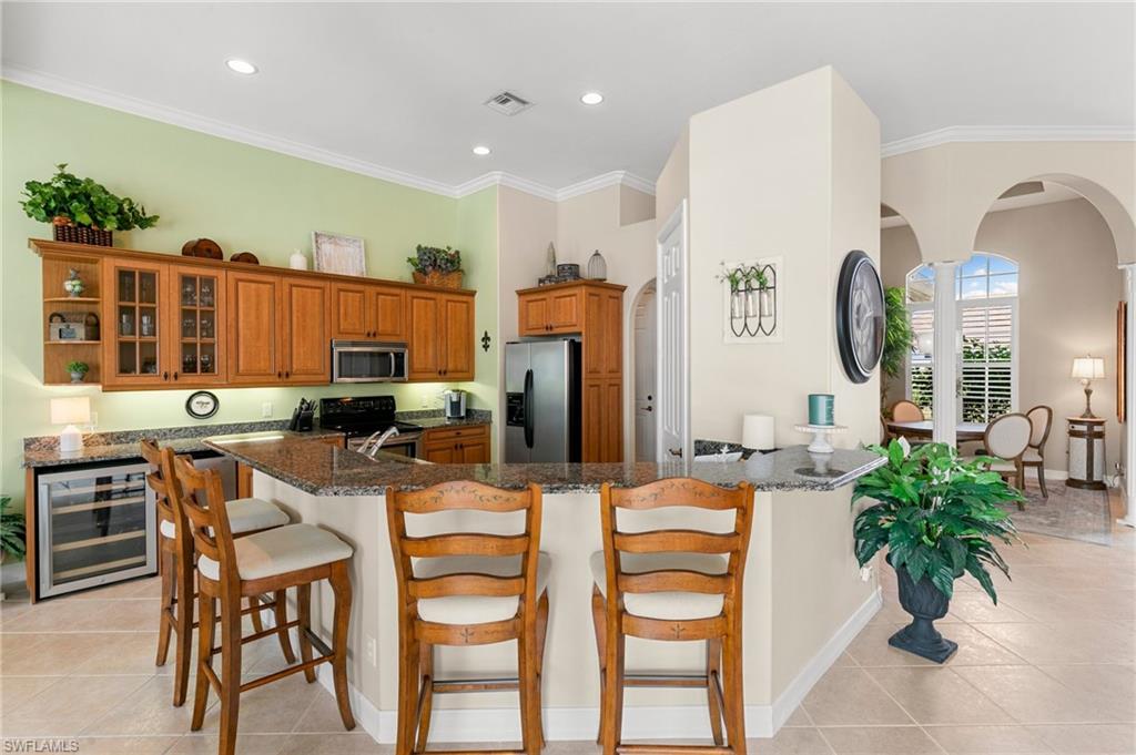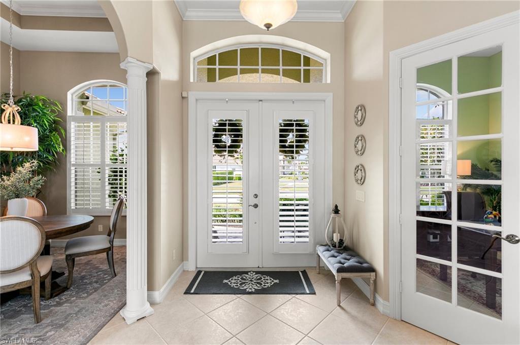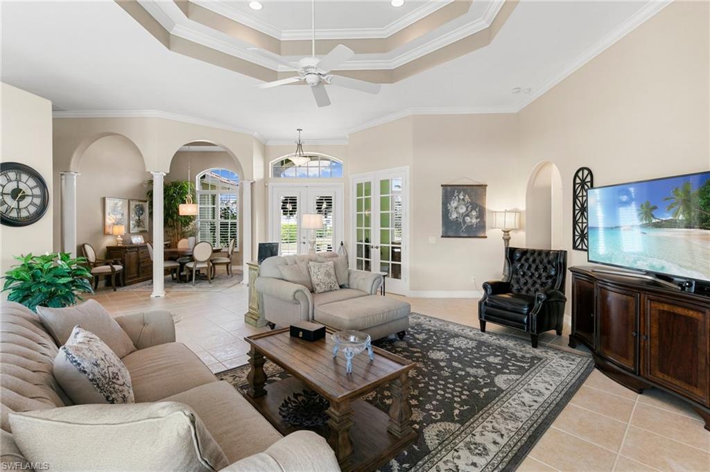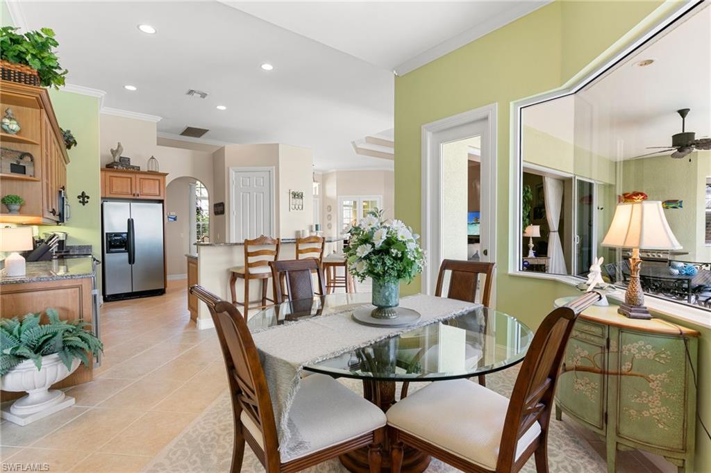 This beautifully designed 3-bedroom + office/den, 2 1/2 bath home offers direct boating access to the Gulf—no bridges, no delays—just moments away from the renowned 10,000 Islands for world-class fishing, boating, and island-hopping adventures. Step inside to find an inviting split-bedroom layout that provides both privacy and flow, enhanced by high coffered ceilings and sunny southern exposure. The spacious kitchen is a chef's delight, featuring a wine cooler, beverage frig, pantry, breakfast bar, and generous counter space—perfect for entertaining or casual family meals. The adjacent dining area boasts a stunning mitered glass window offering sparkling views of the pool and tranquil canal. The primary suite is a retreat, offering access to the pool and a master bath with two enclosed his and hers water closets and a soaking tub. Outdoors, enjoy your personal paradise with a screened-in pool and spillover spa, ideal for soaking in the Florida sun or enjoying cool evenings under the stars. The covered boat dock comes complete with a 12,000lb boat lift, jetski lift, and expansive deck area for lounging, dining, or sunset cocktails. Located in the desirable River area, this home is perfect whether you're a year-round resident or seasonal escapee. This property delivers the ultimate Florida lifestyle plus offers a 1 Year HOME WARRANTY for the new owner's peace of mind.