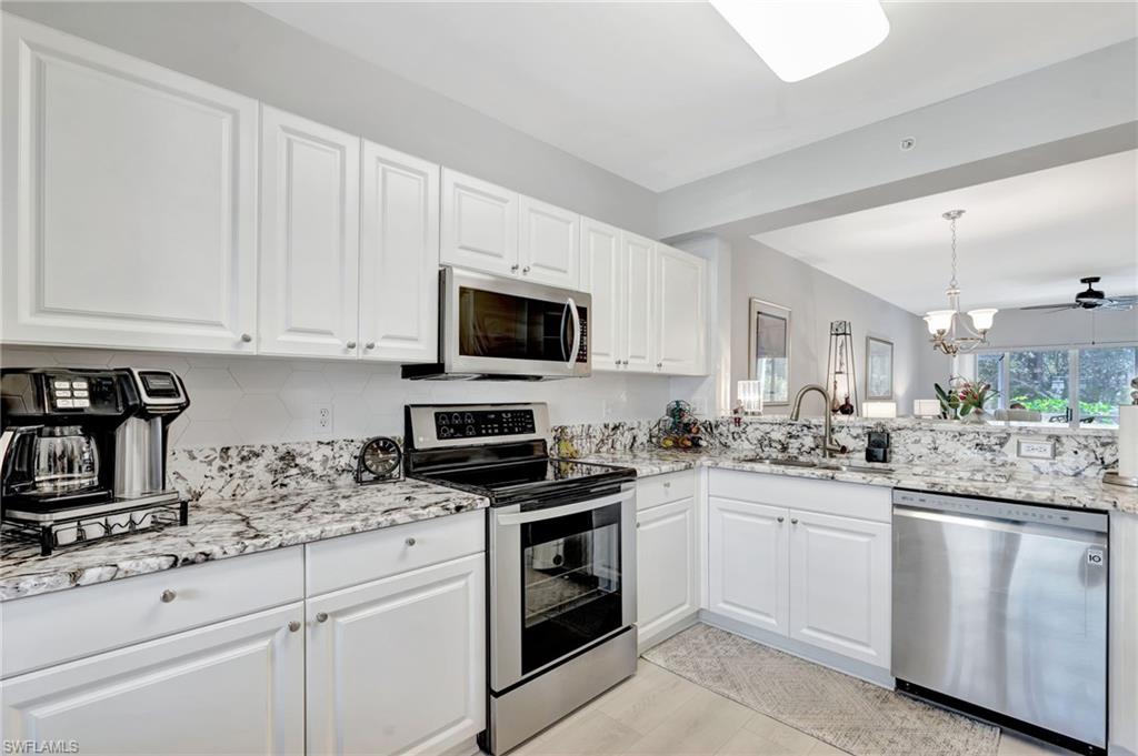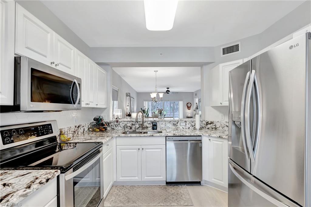 Beautifully Updated 2-Bedroom, 2-Bath First-Floor Residence. Welcome home to this beautifully renovated first-floor condo, where style meets comfort in every detail. Freshly painted throughout, this residence features brand-new luxury vinyl plank flooring in the Great Room, Kitchen, and bathrooms, paired with plush new carpeting in the bedrooms for a cozy touch. The custom-designed kitchen is a standout, showcasing crisp white cabinetry, sleek stainless steel appliances, and gleaming custom granite countertops—perfect for both everyday living and entertaining guests. Step out to your private screened lanai and enjoy peaceful preserve views—ideal for relaxing afternoons and morning coffee. Located in a highly desirable gated community, this home combines tranquility with unbeatable convenience—just minutes from I-75, shopping, dining, and more. Residents also enjoy access to resort-style amenities including a sparkling community pool and a welcoming clubhouse. Low HOA fees of $1,172 per quarter include covered carport, basic cable and water—adding extra value to this already exceptional home.