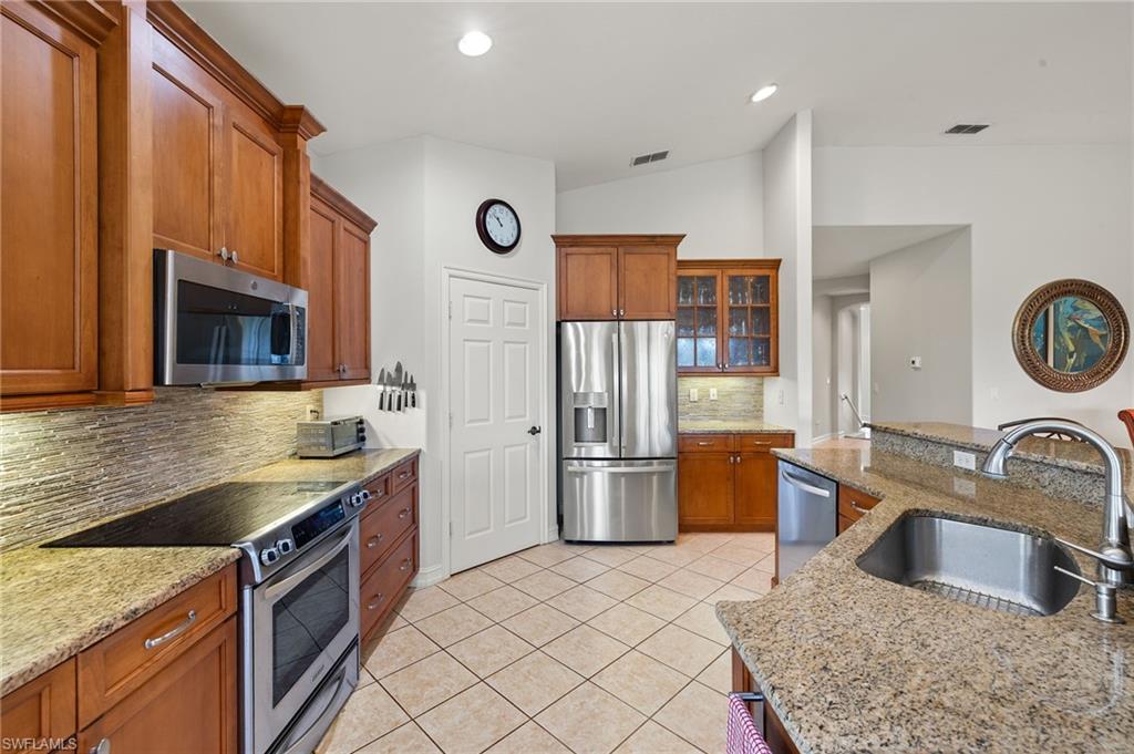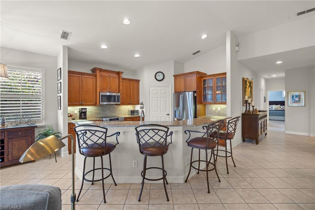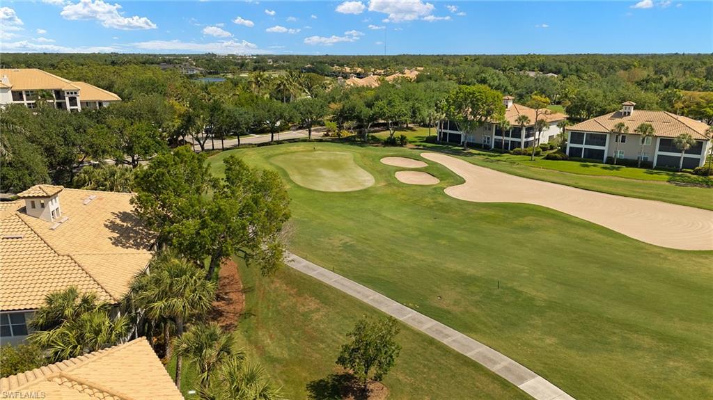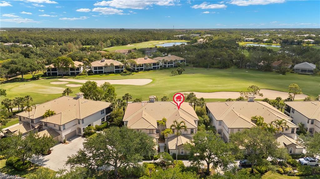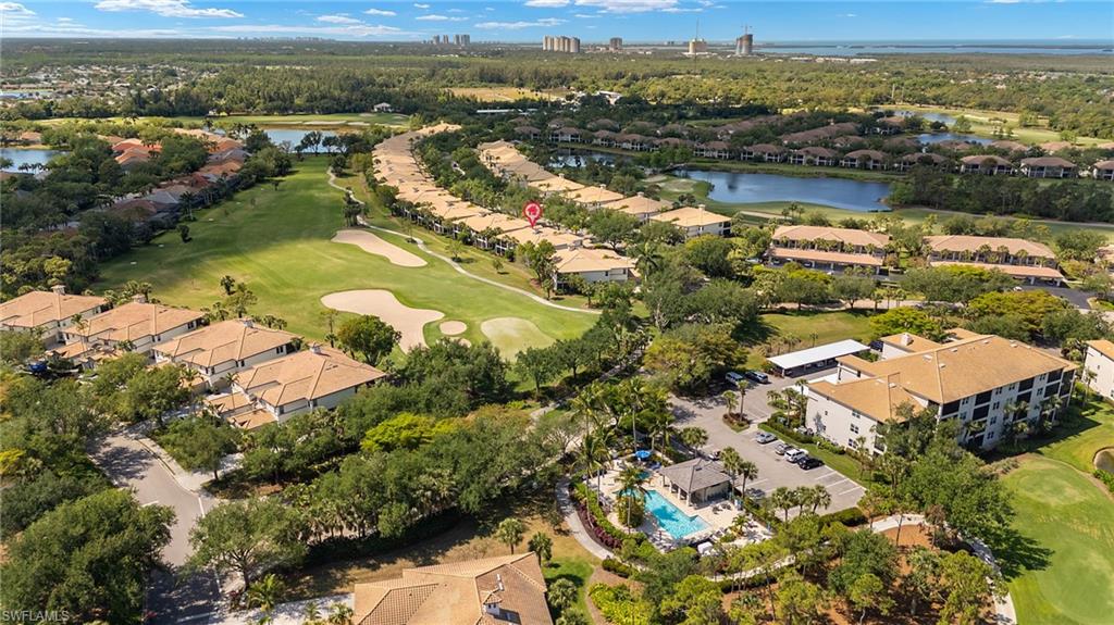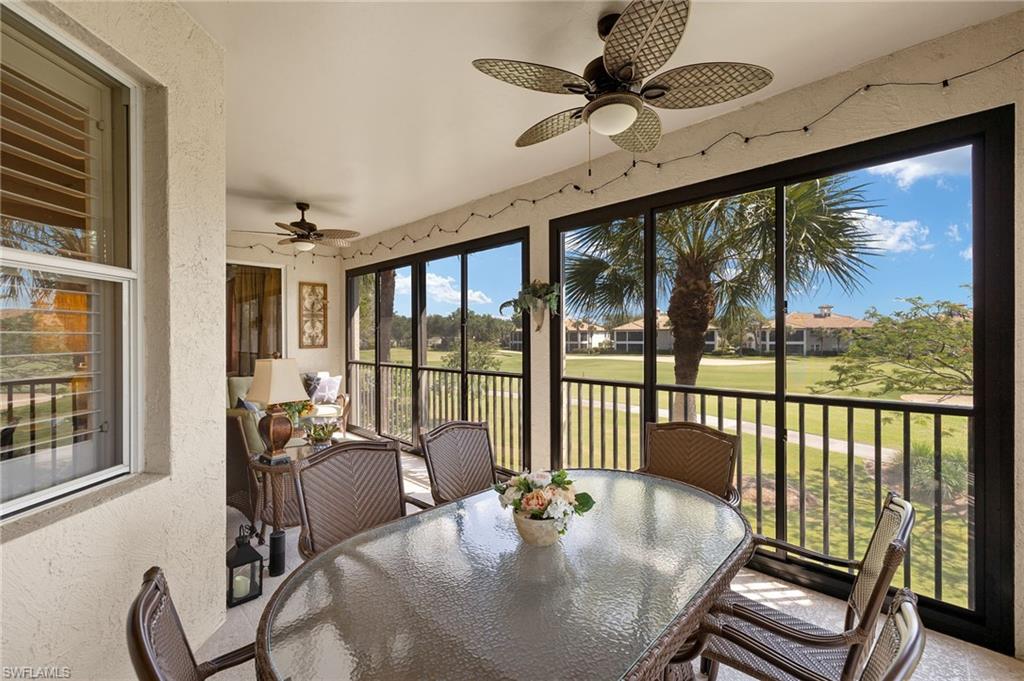 Membership Included in this amenity-rich community of Pelican Sound! Finally what you have been looking for! Exceptional turnkey furnished second floor carriage home with volume ceiling and wide open living space. Features include 3 bedrooms all with walk-in closets, plus a den and 2 full baths. Located just off the 8th fairway, offering continuous enjoyment as you relax on the wrap around lanai with Lexan sliders and watch the the golfers from fairway to putting green. Additional features include renovated kitchen with granite counters, stainless appliances, staggered rich wood cabinets with underlighting to accentuate the gorgeous decorative backsplash. Spacious primary suite with recently renovated bathroom offering gorgeous tiled shower, seamless shower door, granite counter top and more. Unique to the carriage home the door to the laundry room has been moved giving the den a much more finished look. Plantation shutters throughout and A/C replaced in 2024. If you are looking for an active lifestyle look no further: 27 holes of Championship golf, 14 pickleball, 8 tennis and 6 bocce courts. State of the art fitness center that is professionally staffed. Pelican Sound is nestled up to the Estero River with access to the Gulf of Mexico. The community offers dry boat storage, kayaks, canoes and paddle boarding, along with a shuttle boat to Lovers Key State Beach Park. Minutes from RSW International airport and surrounded by fabulous shopping and restaurants. Start Living The Dream!